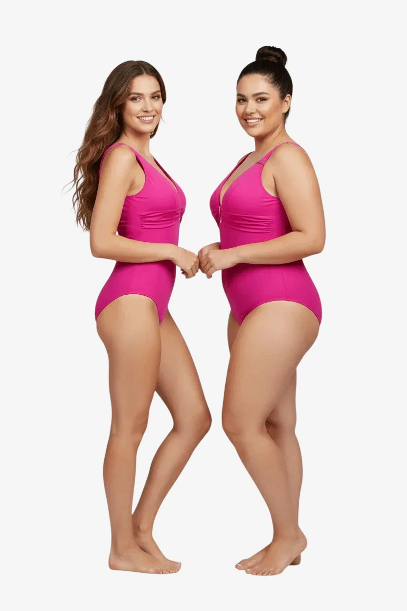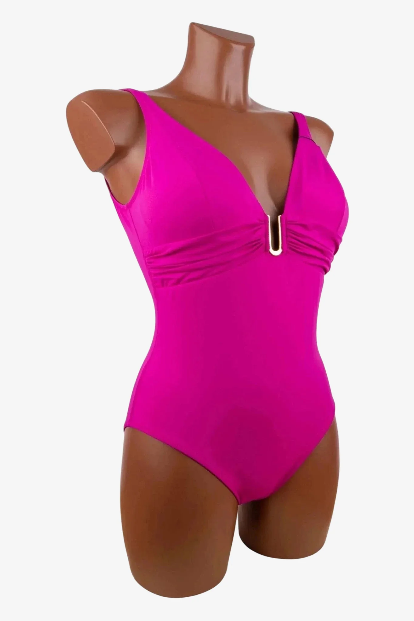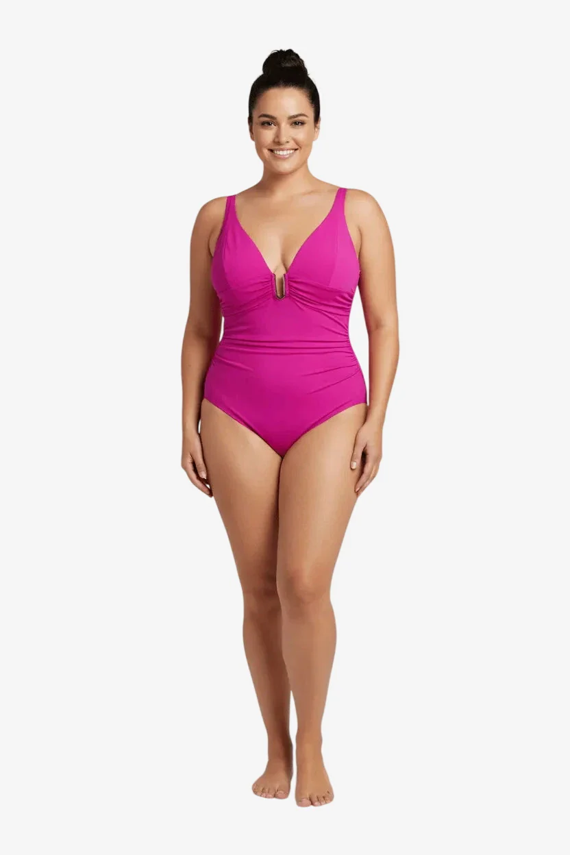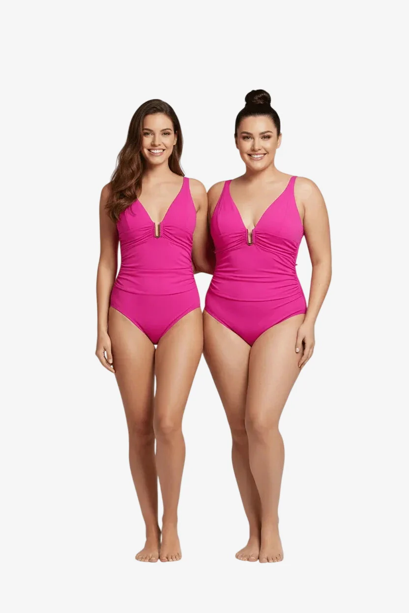 Perfetto per chi cerca un costume che unisca eleganza e funzionalità. L’arricciatura sotto seno garantisce sostegno ottimale, mentre lo scollo profondo con accessorio metallico dona un tocco glamour.