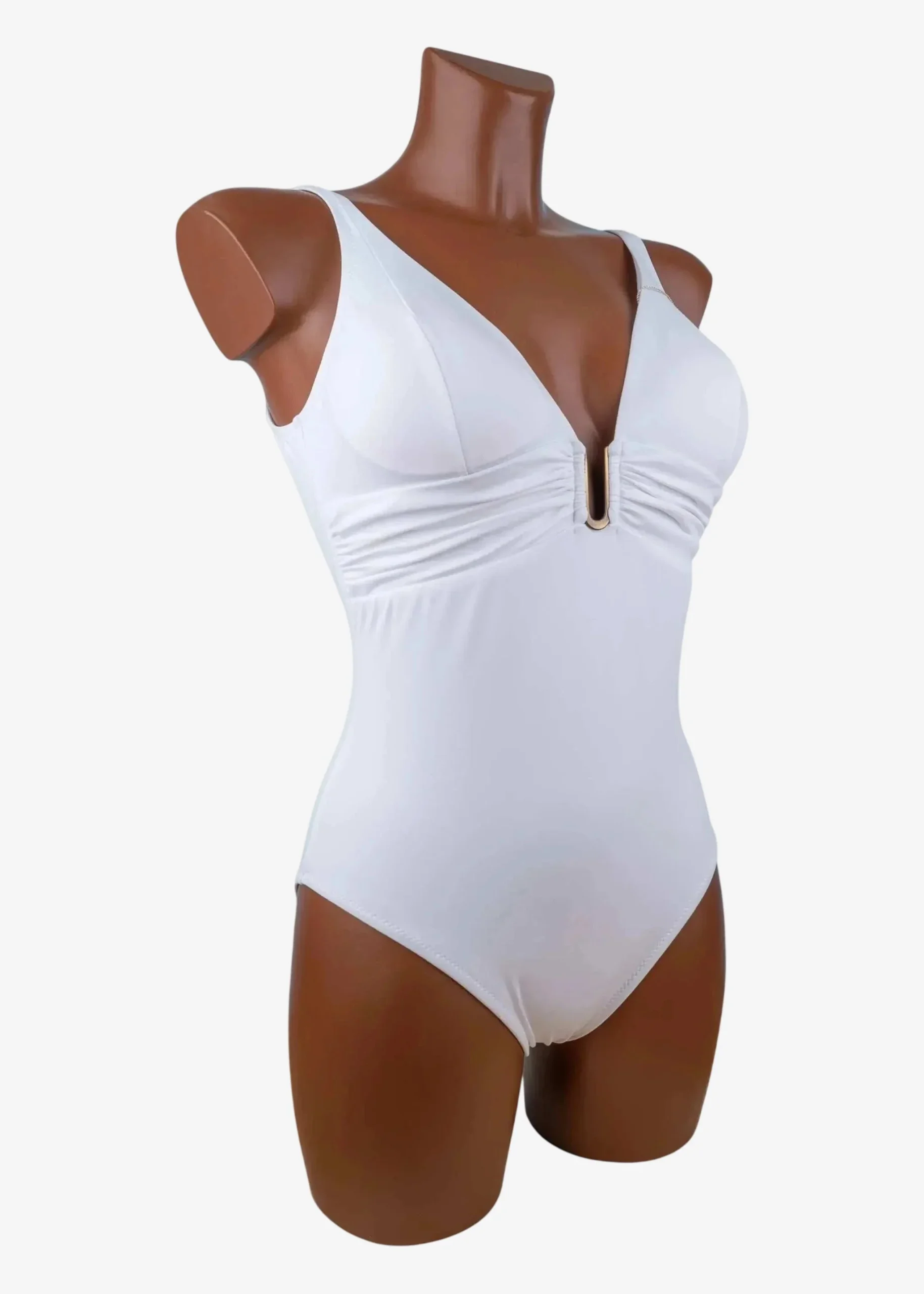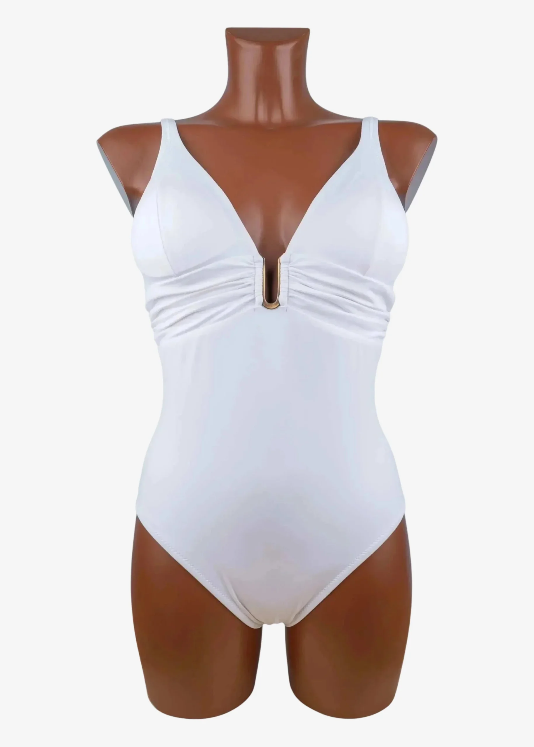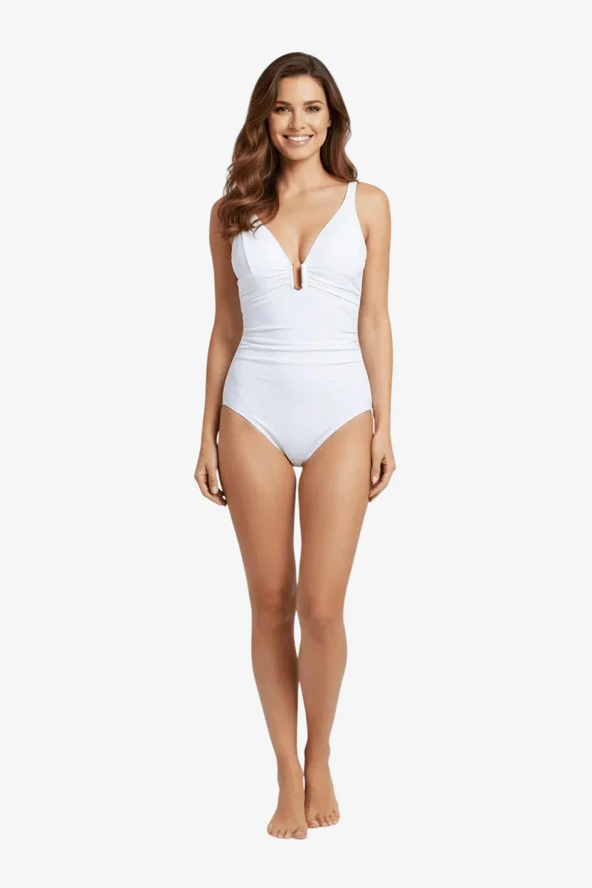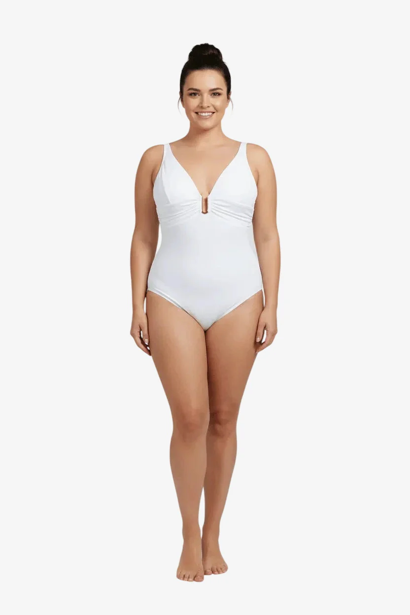 Costume intero Roidal dallo scollo profondo con arricciatura sotto seno che dona sostegno e ottima vestibilità. Lo scollo è valorizzato da accessorio in metallo anallergico (nickel free).