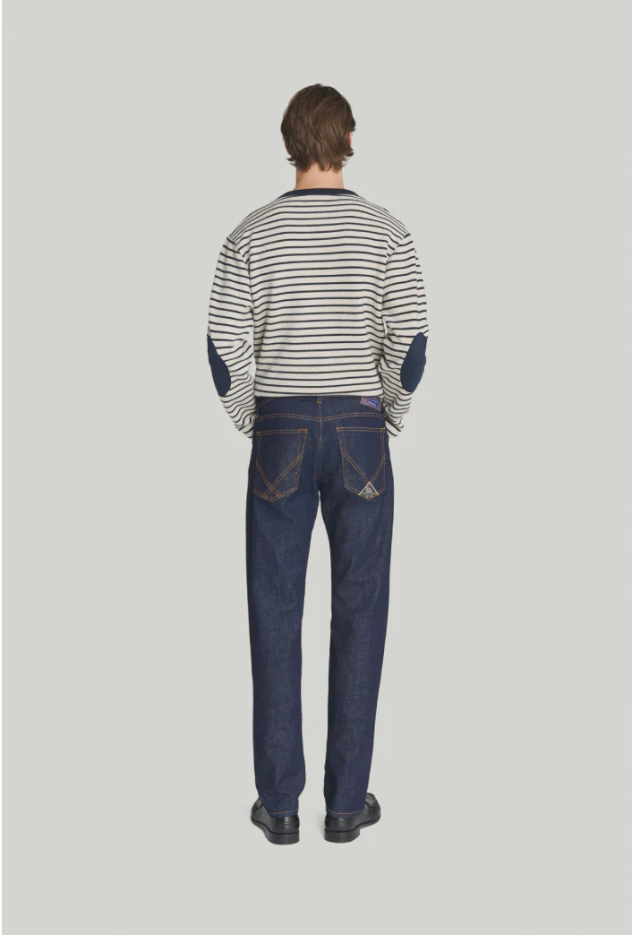 Jeans in denim one wash con lavaggio scuro e impunture in contrasto. Vita media con passanti e salpa Roy Roger’s ORIGINAL applicata sul retro. Chiusura con bottone logato e zip. Due tasche sul fronte e due tasche sul retro con label Roy Roger’s applicata. Regular fit. COMPOSIZIONE: 98% COTONE 2% ELASTAN. Il modello è alto […]
