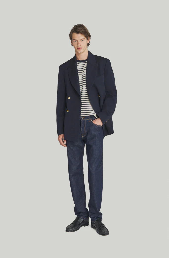 - Jeans in denim one wash con lavaggio scuro e impunture in contrasto.