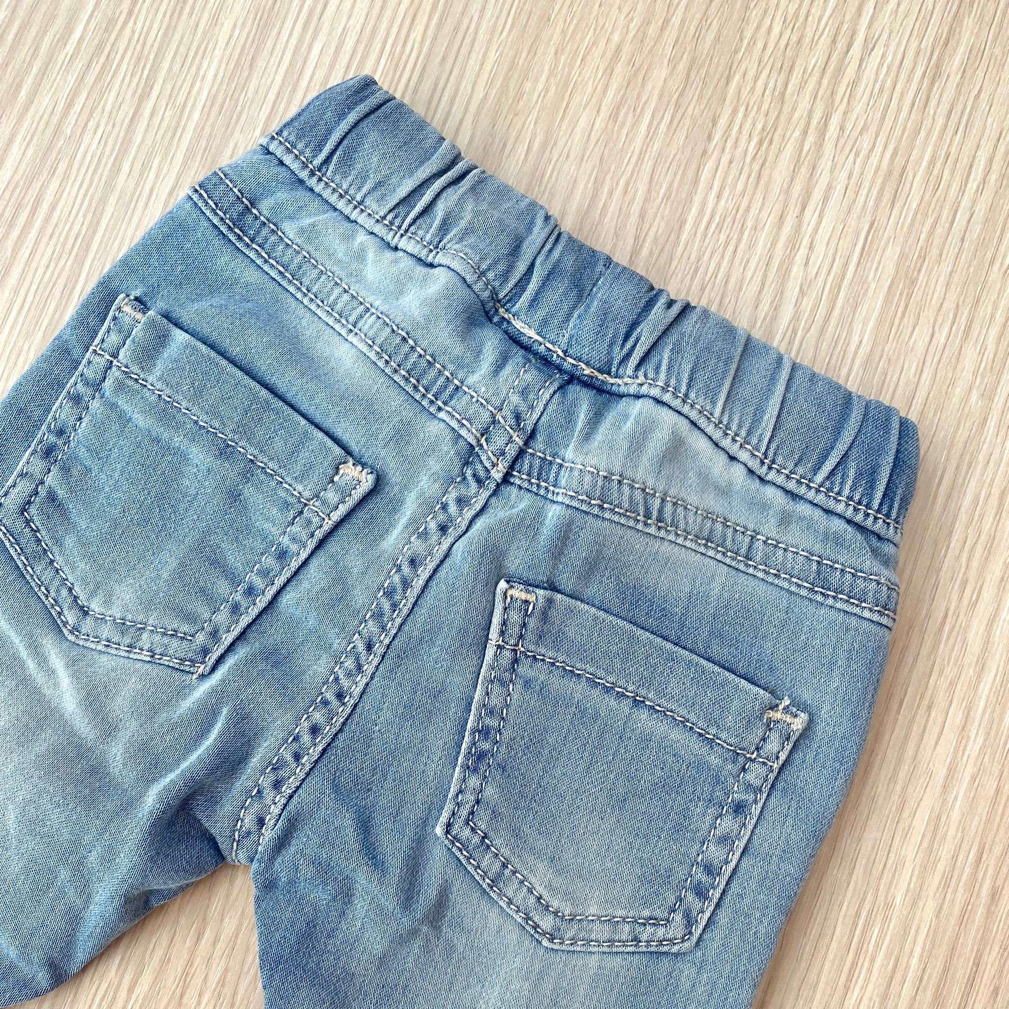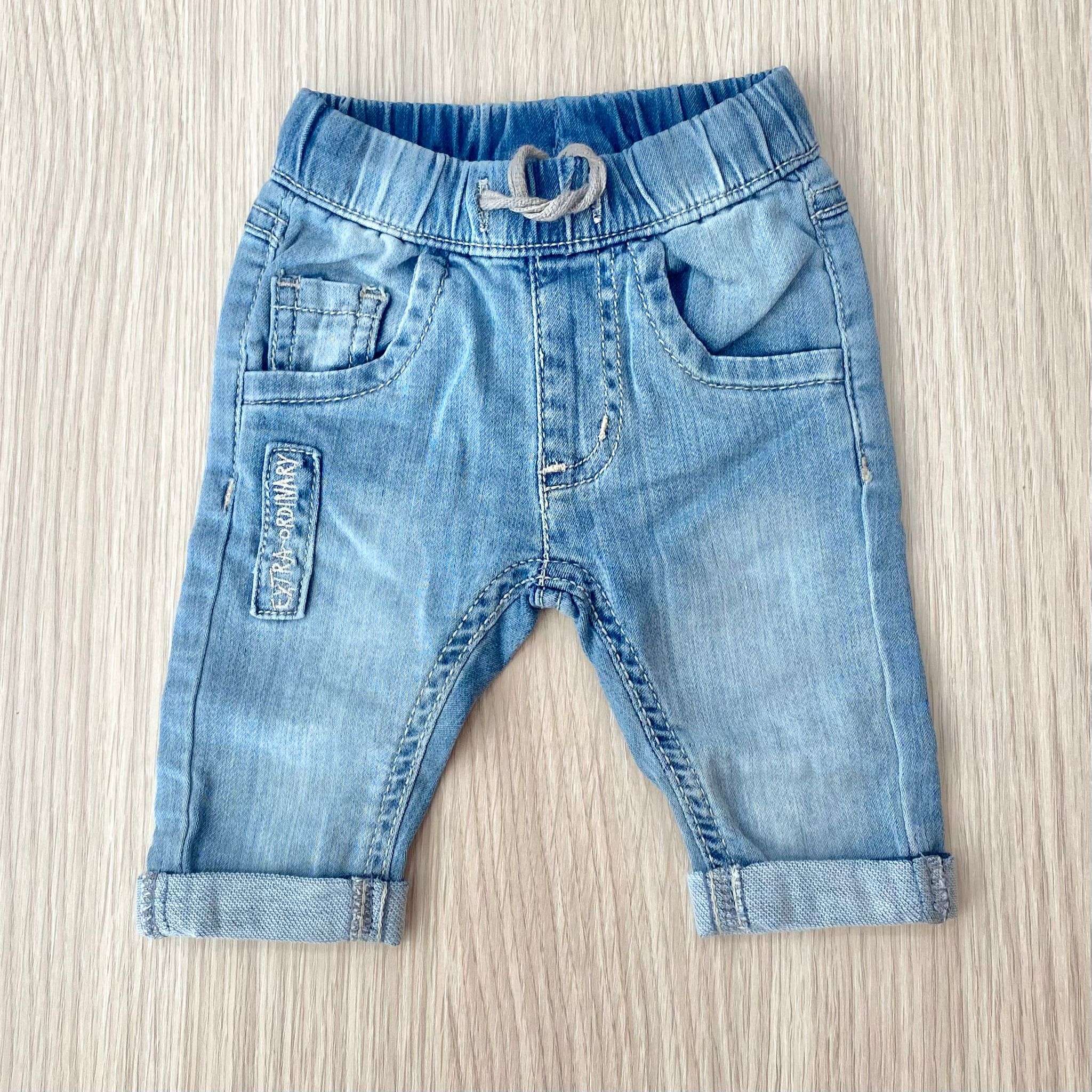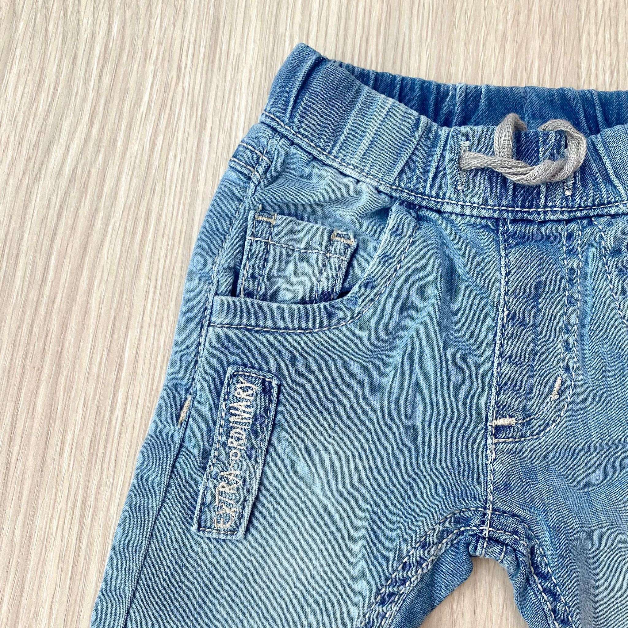 Jeans neonato/bambino in cotone adatto alla stagione primavera/estate, con dettaglio di tasche, con laccetto regolabile. 99% Cotone. 1% Elastane.