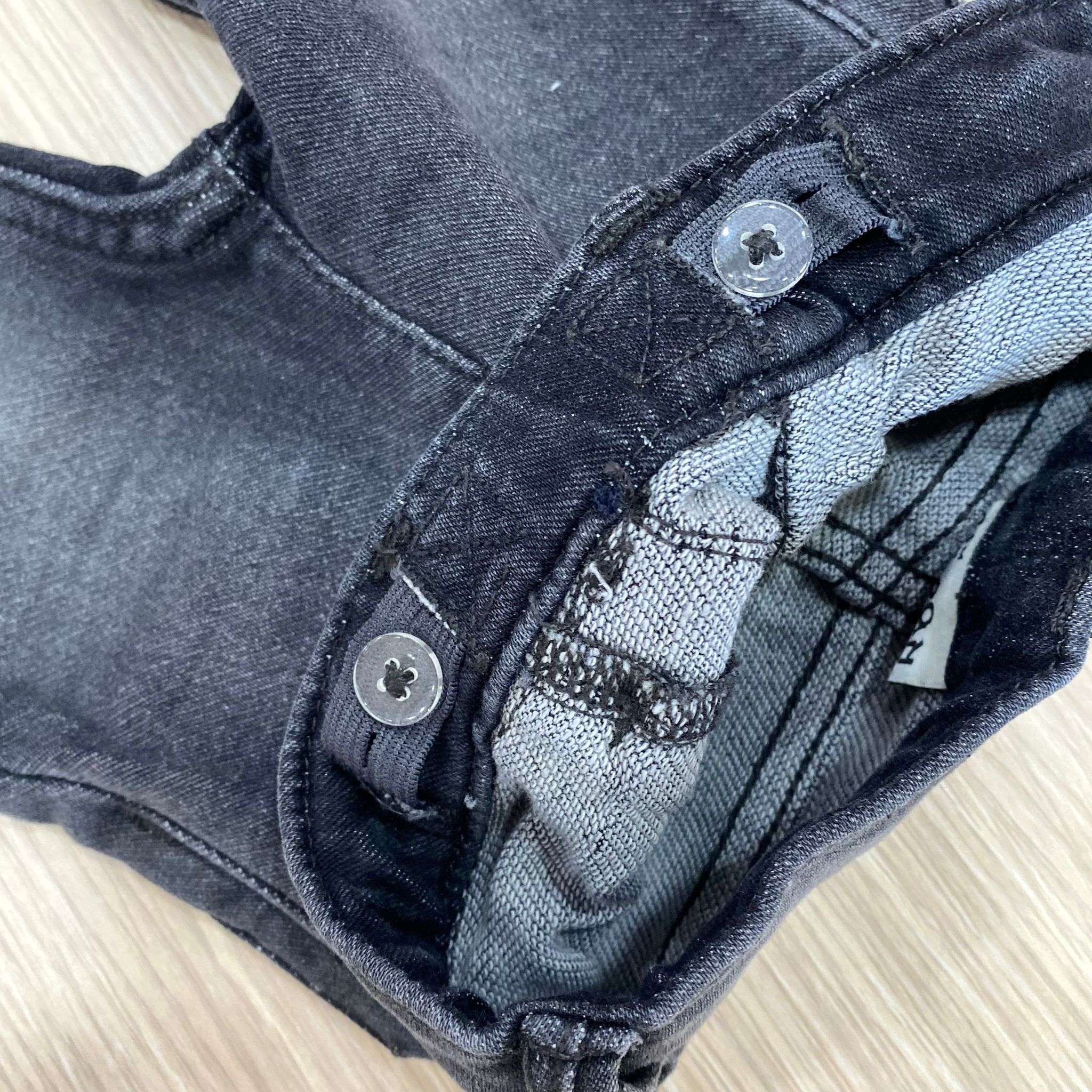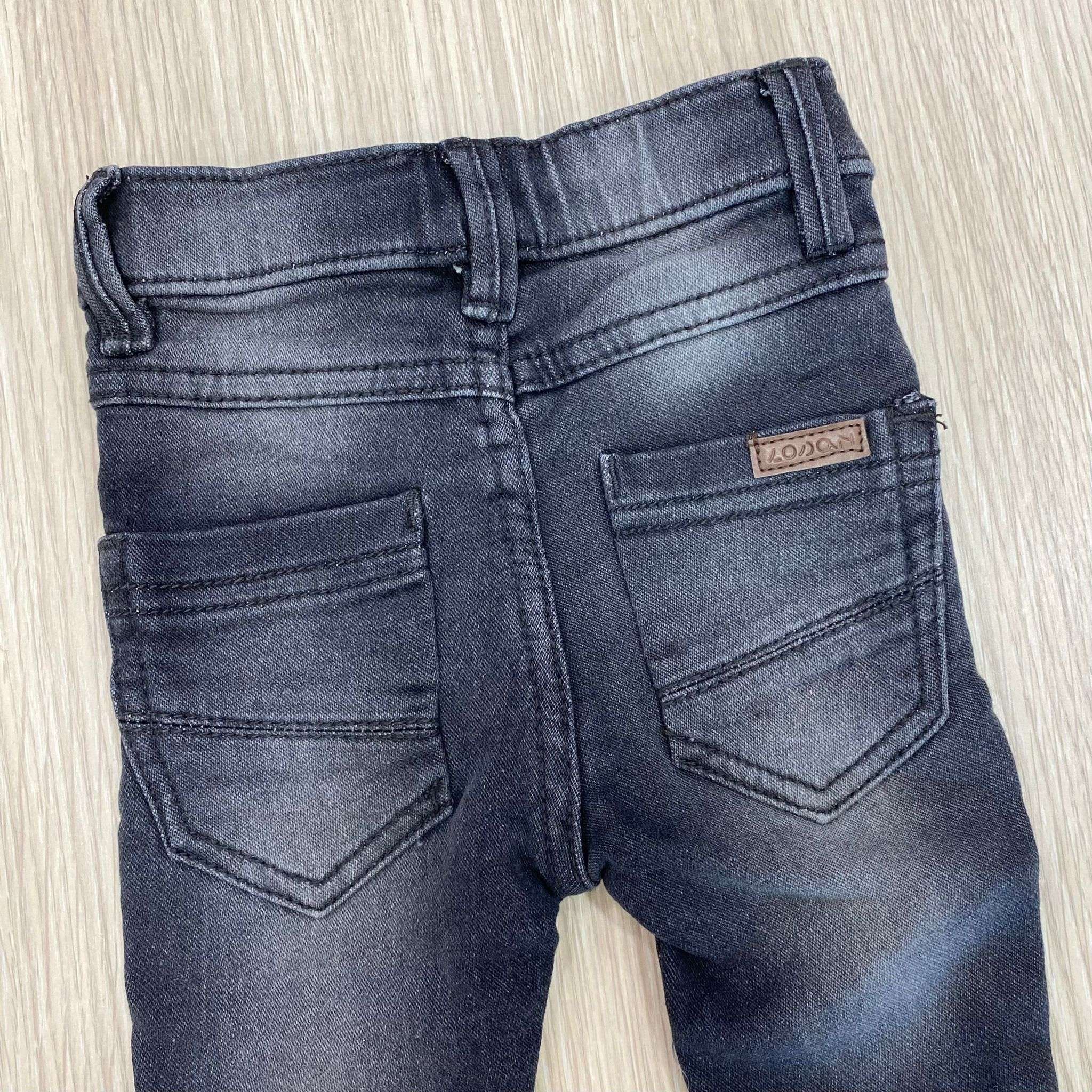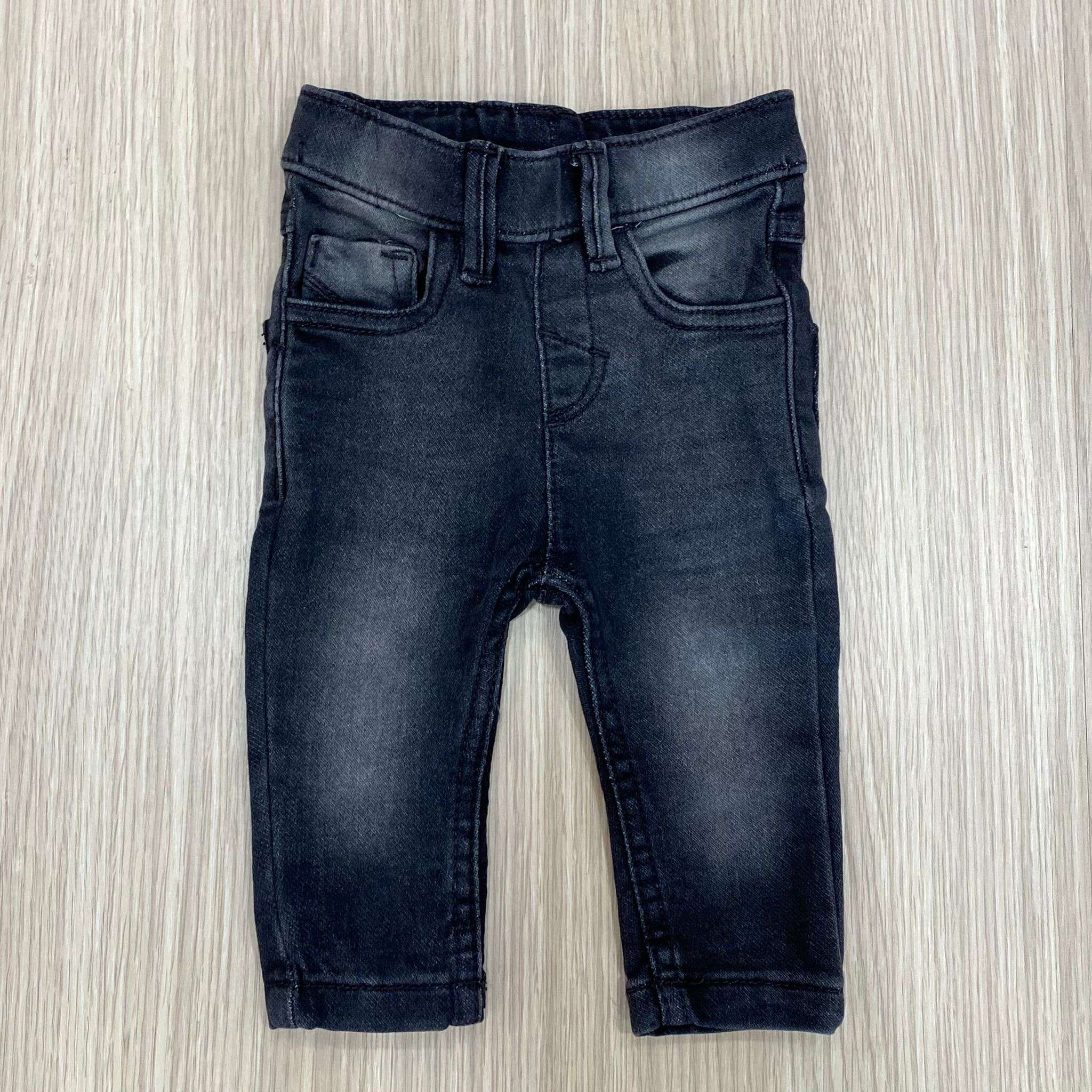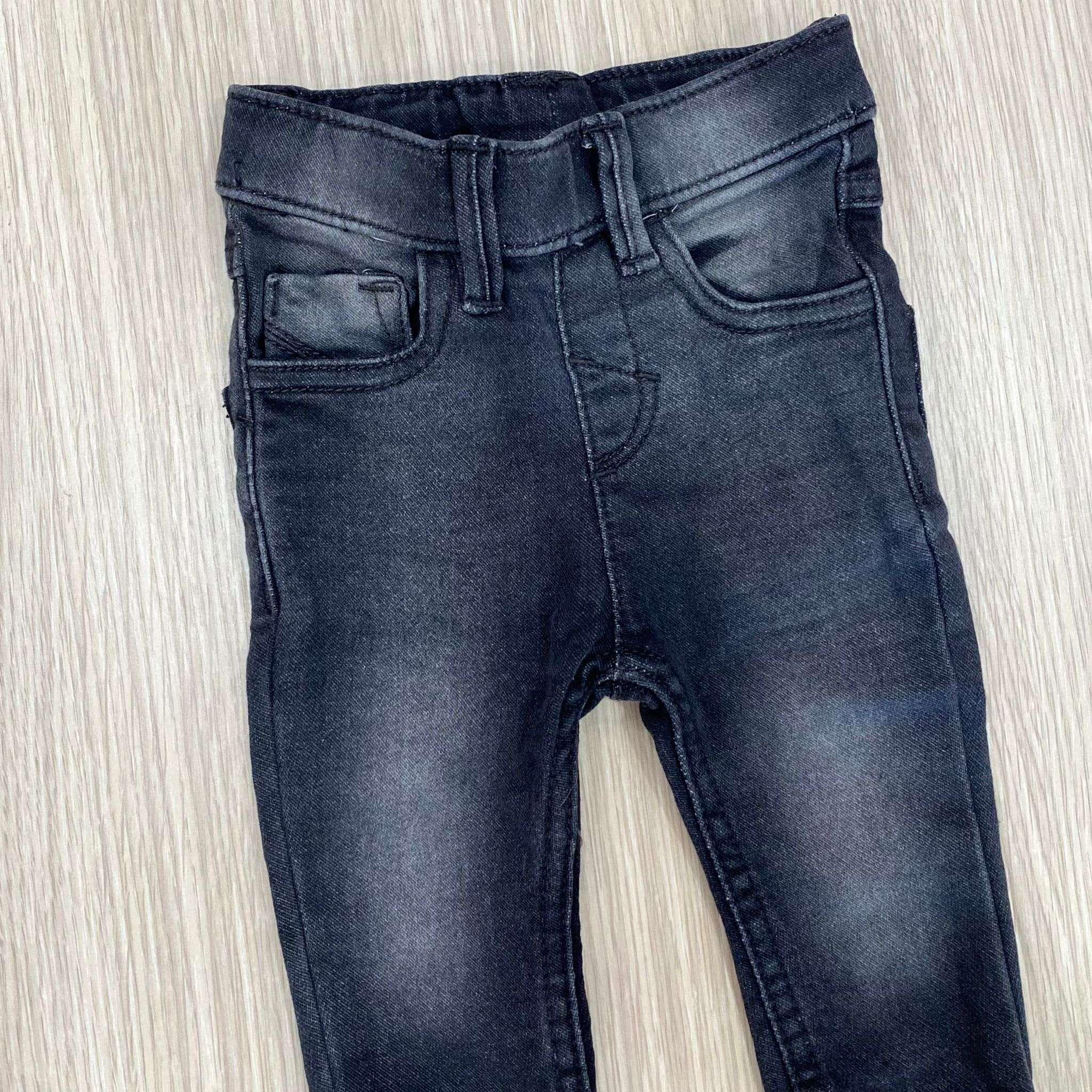 Jeans neonato/bambino in cotone elasticizzato, di colore nero chiaro, con elastico regolabile all’interno. 80% cotone. 18% Poliestere. 2% Elastane.