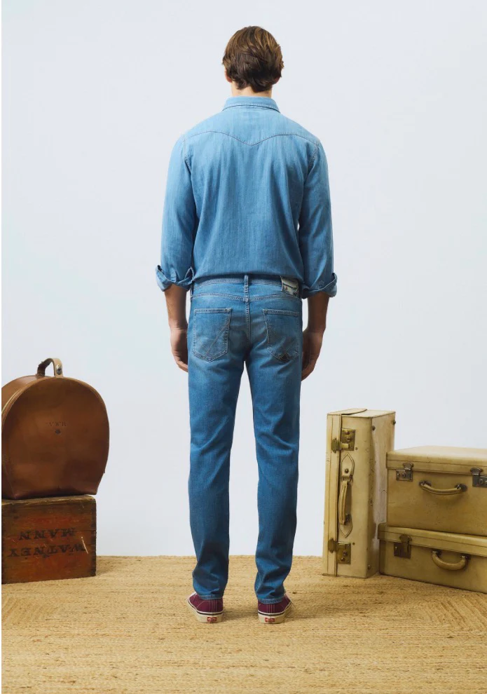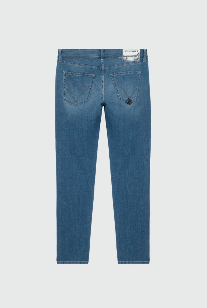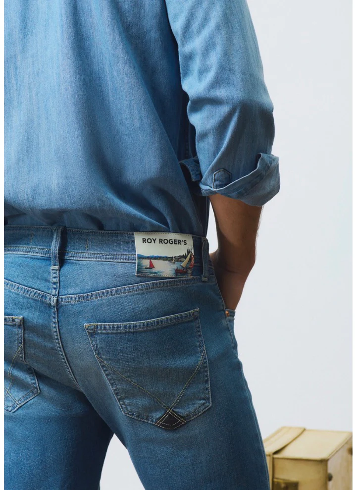 Jeans in denim con lavaggio chiaro. Leggere baffature sul fronte. Vita media con passanti e particolare salpa applicata. Chiusura con bottone logato e zip. Due tasche sul fronte e due tasche sul retro con label Roy Roger’s applicata. Slim fit. COMPOSIZIONE: 98% COTONE 2% ELASTAN.