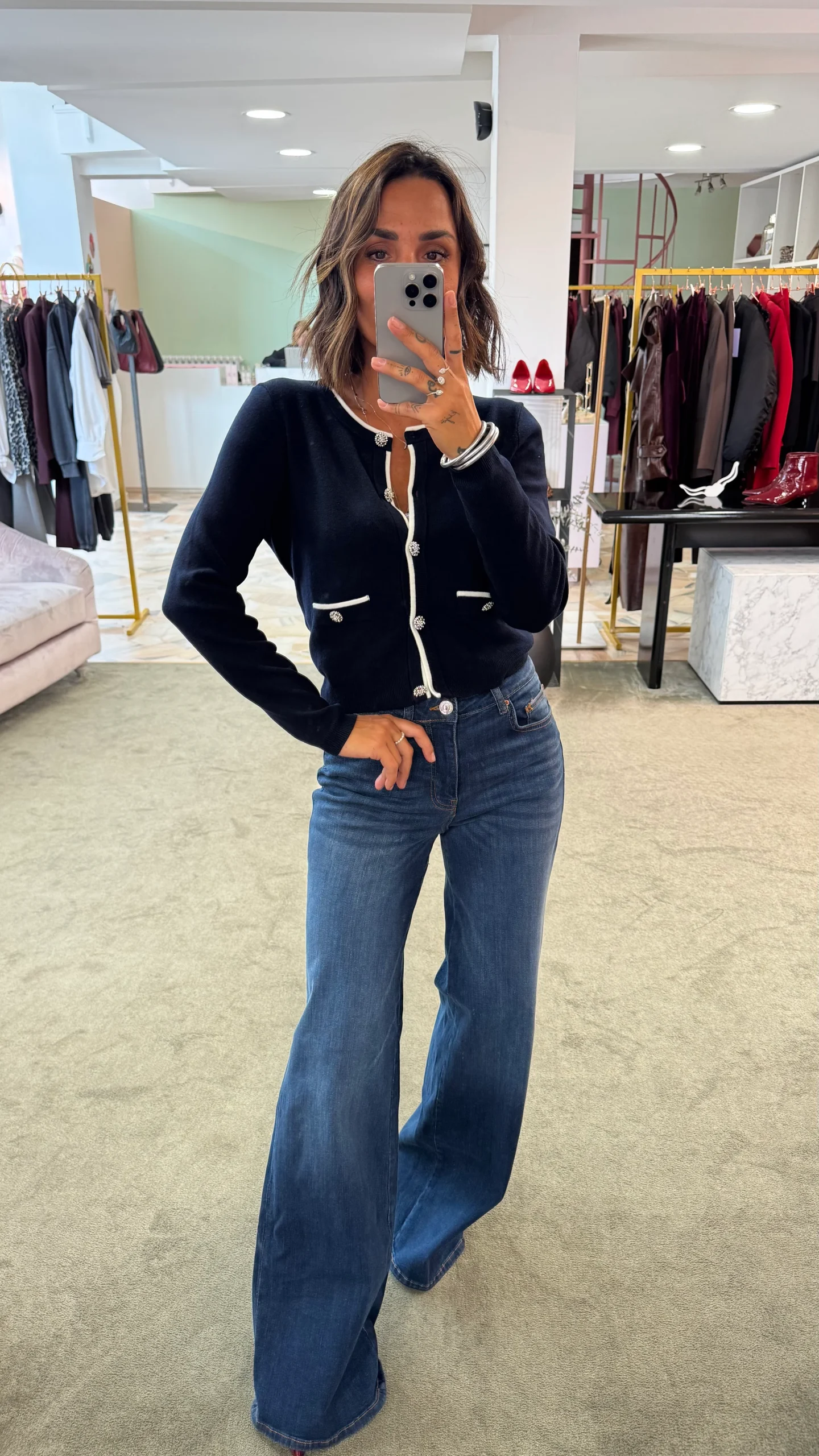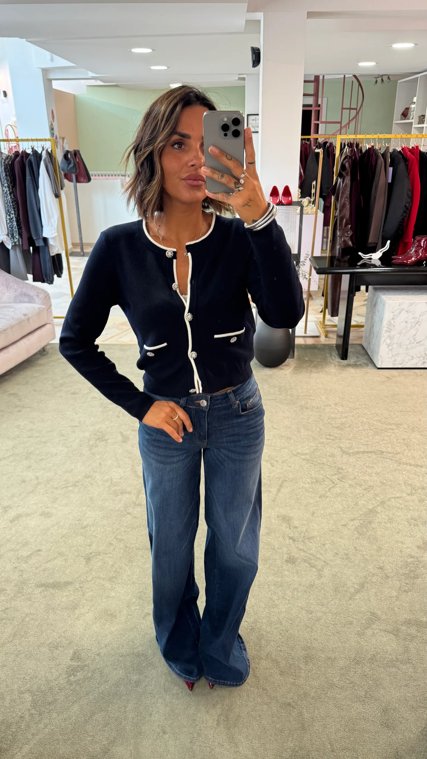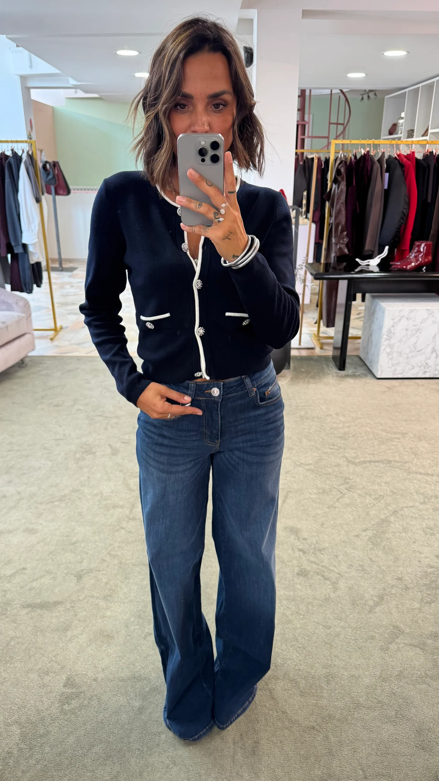 La Manu indossa una 25. Aggiungere +14 per ottenere la taglia italiana. Vestibilità: vita alta, elasticizzato, gamba larga MISURE MANU:Altezza 1,63Peso 53kg VITA 70 – GIRO SENO 65 – FIANCHI 90