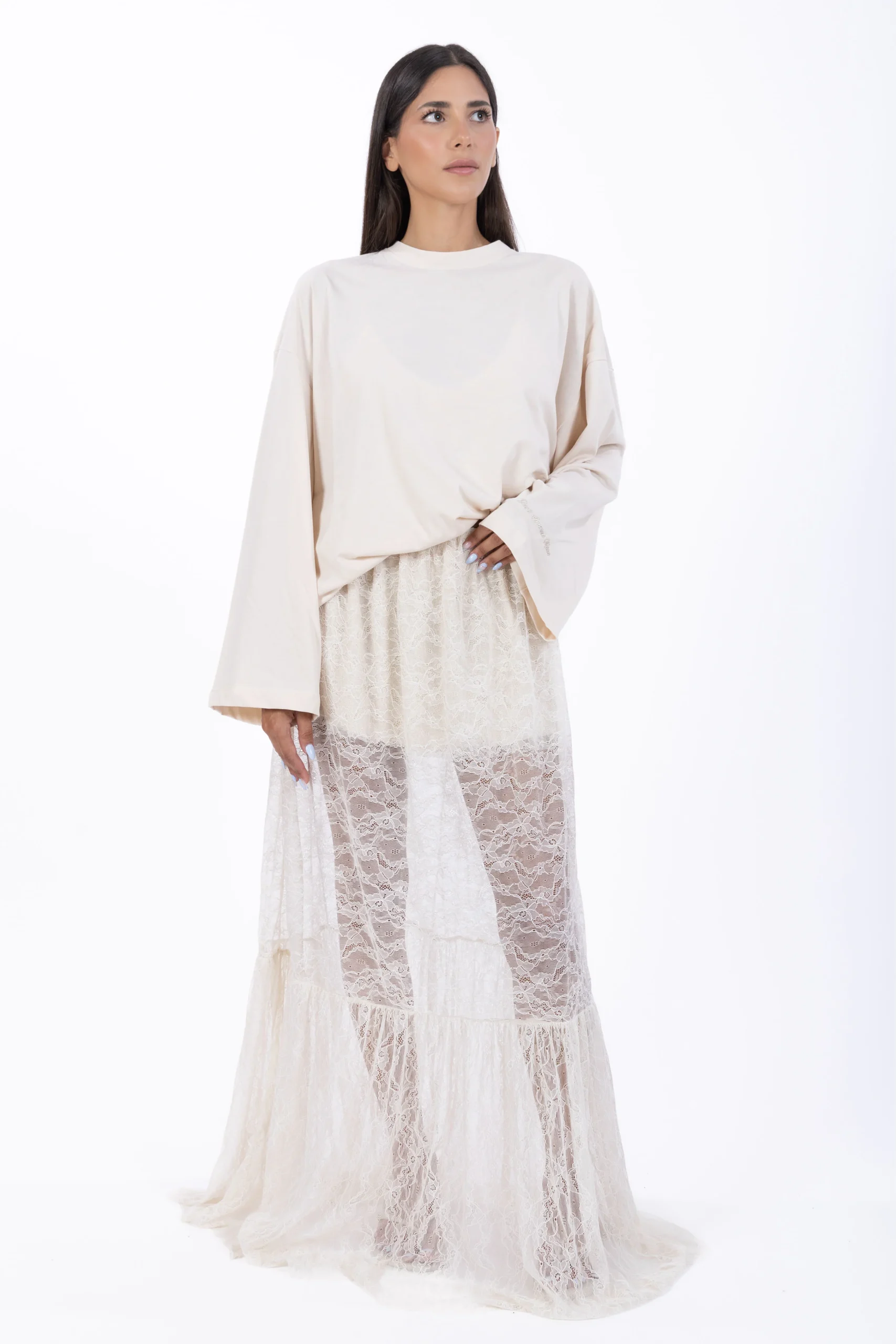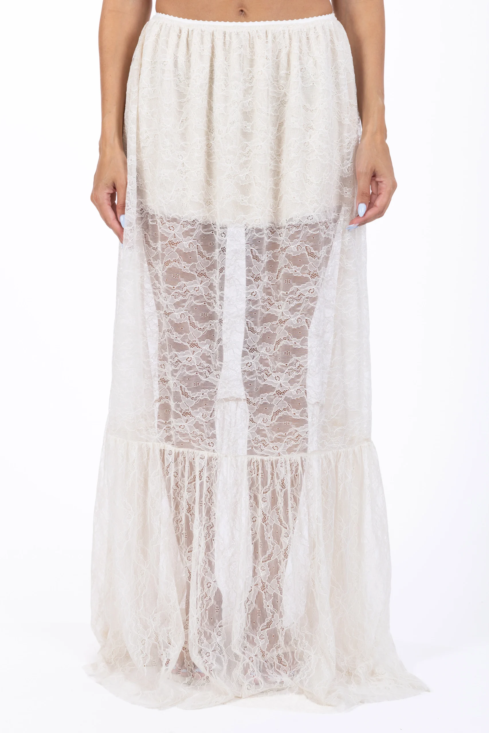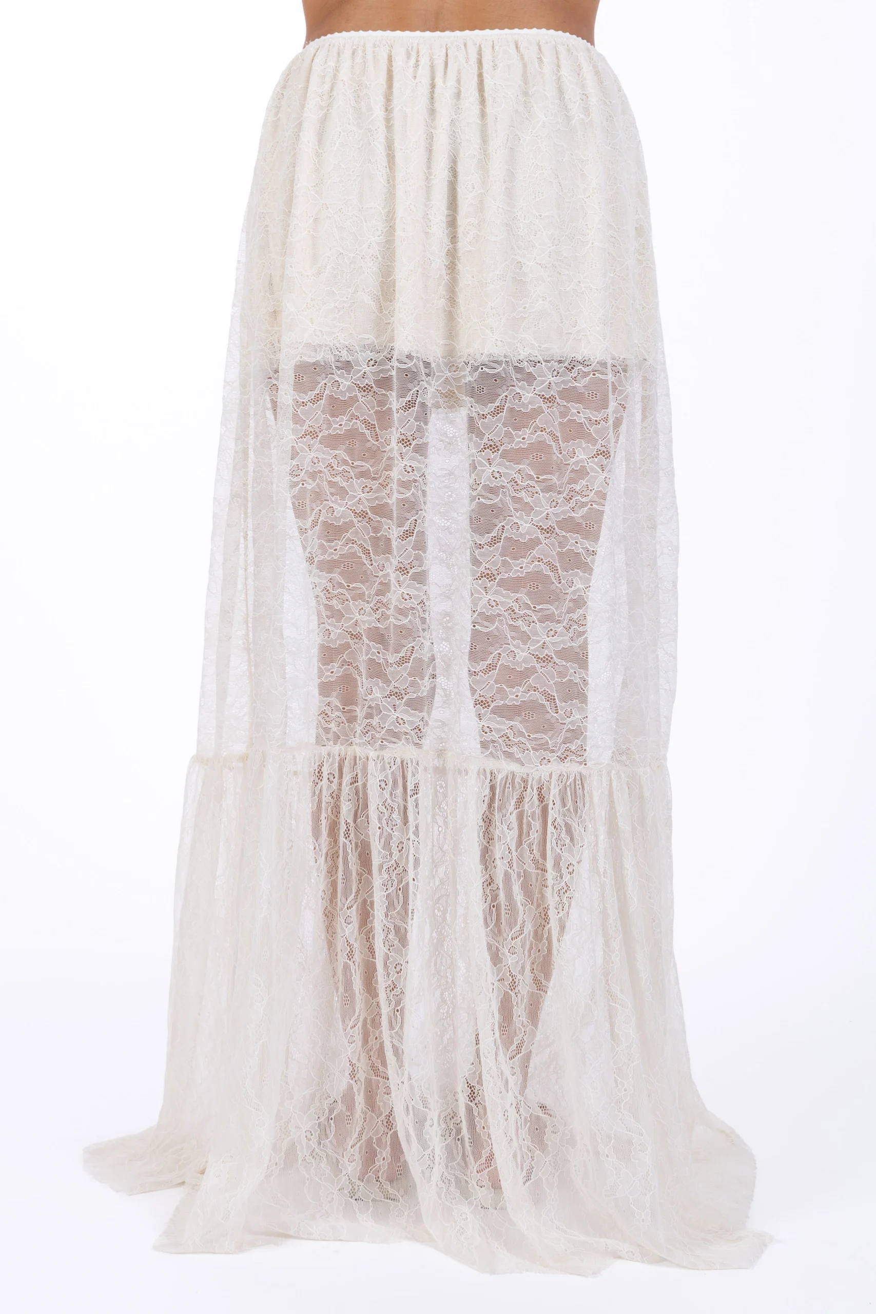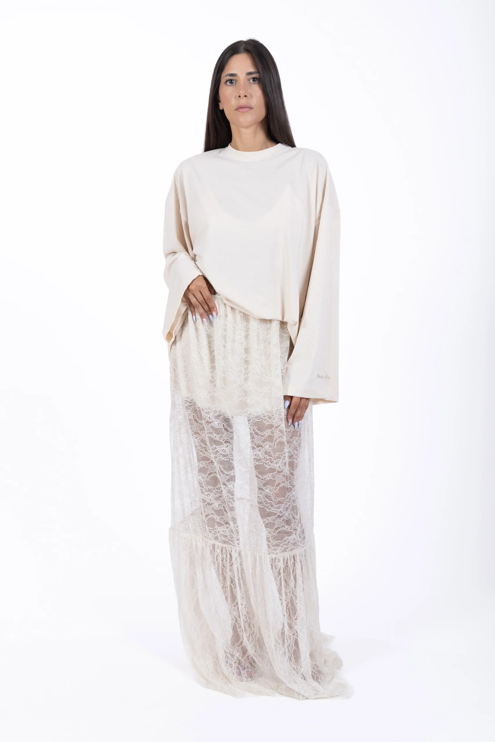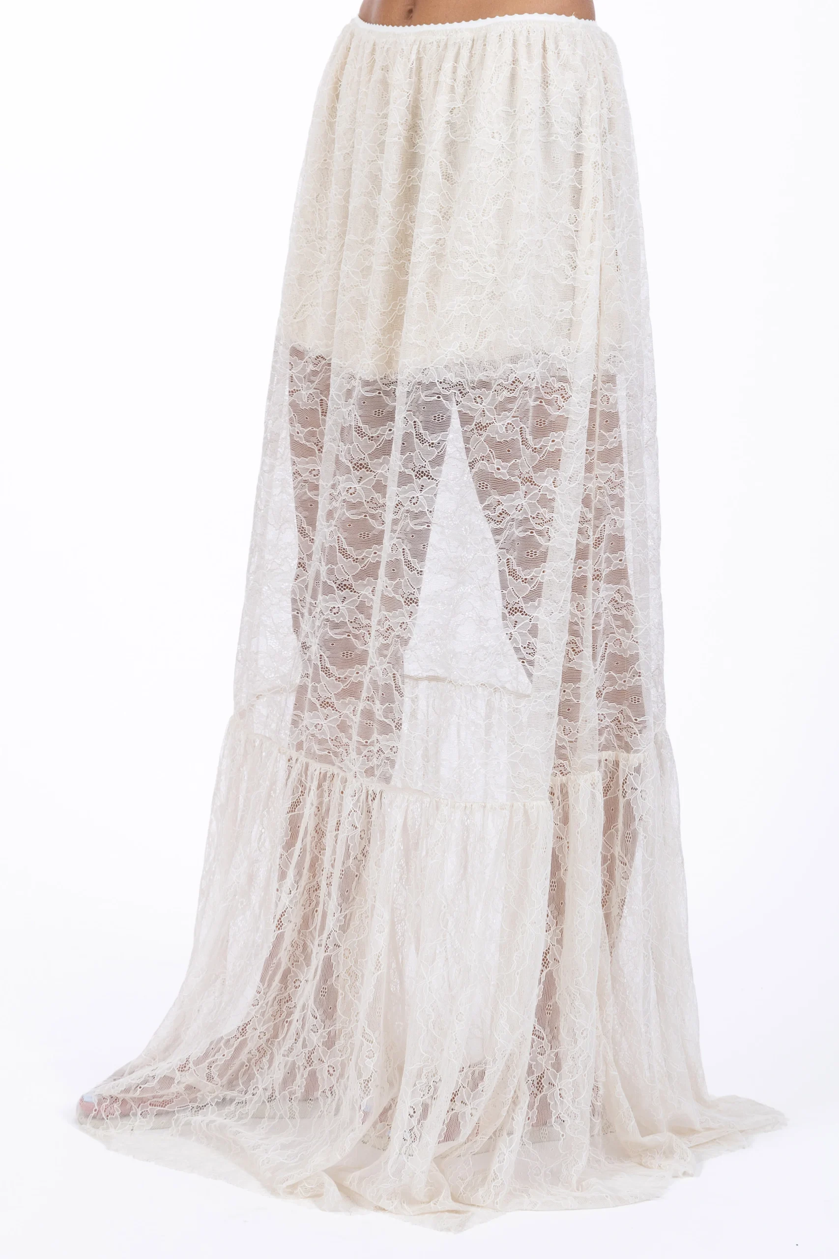 Romantica e sofisticata, la gonna lunga Juliette in pizzo burro è un capo pensato per chi ama giocare con trasparenze e volumi leggeri.