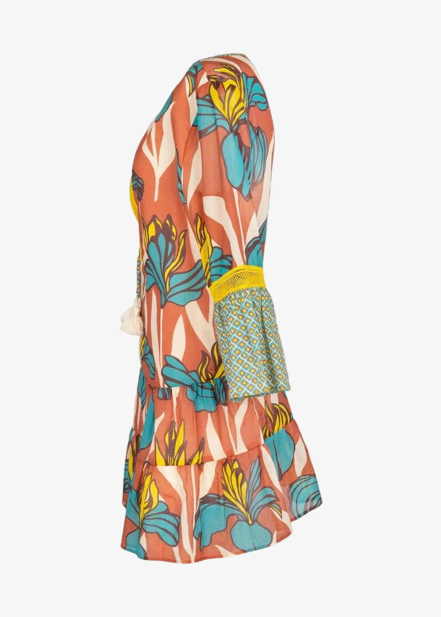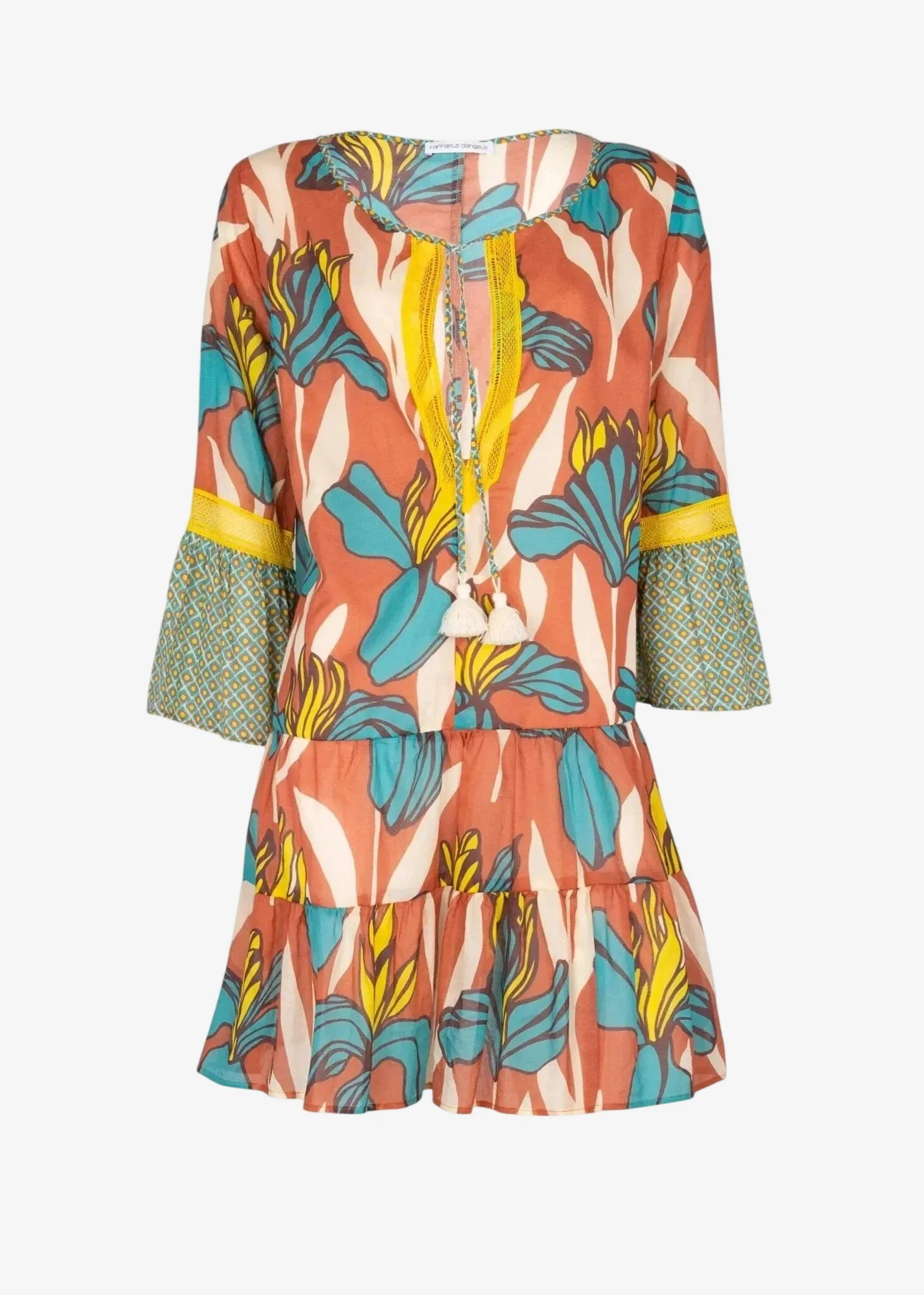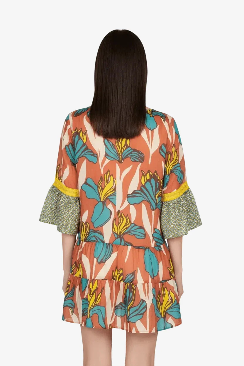 Kaftano corto a balze Raffaela D’angelo in cotone bio fresco e leggerissimo , stampato a disegni floreali macro , con inserti di pizzo e micro stampa.