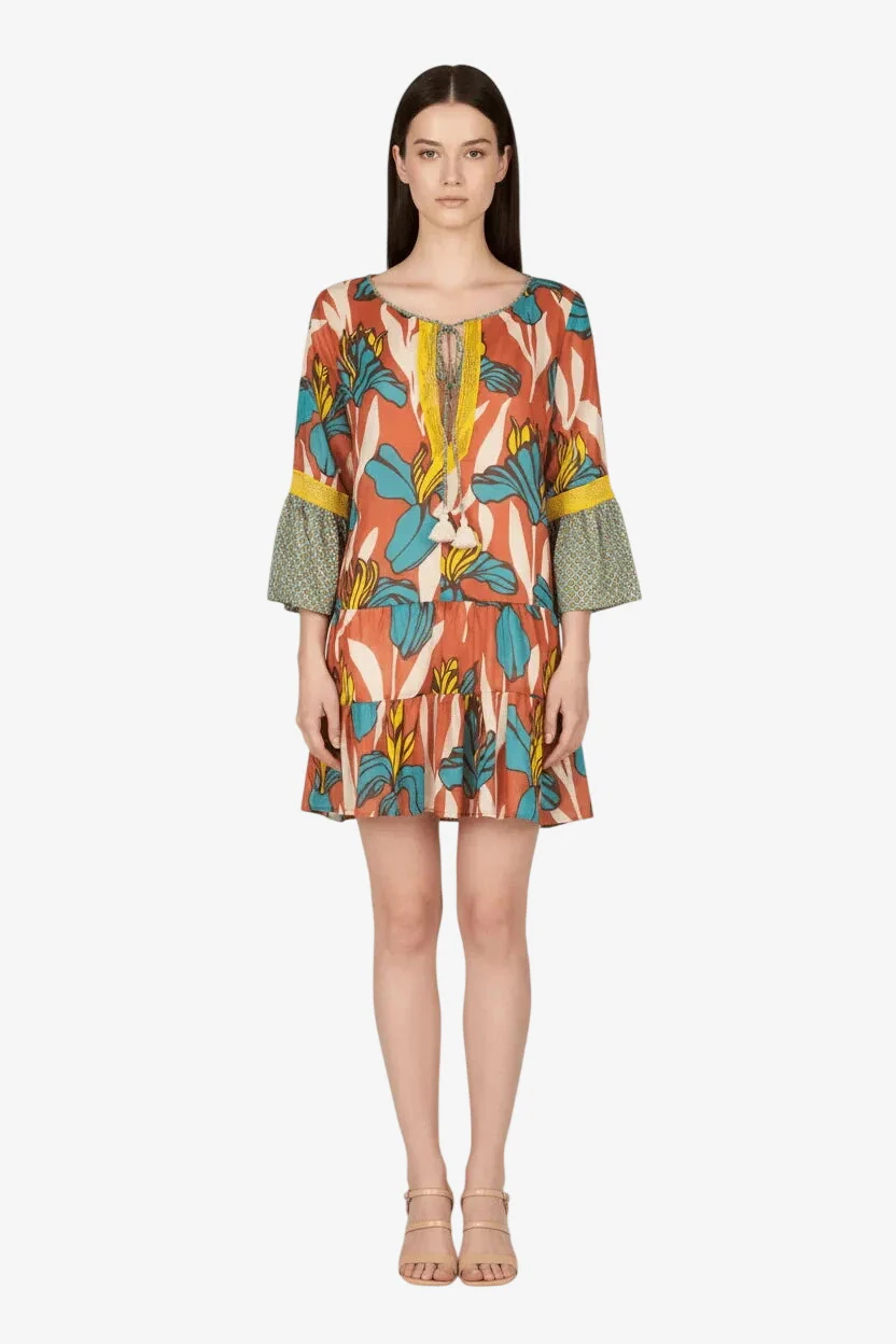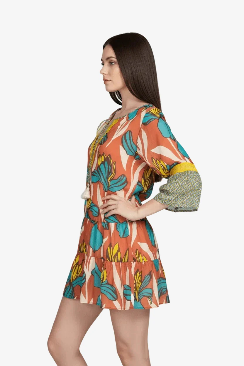 Kaftano corto a balze Raffaela D’angelo in cotone bio fresco e leggerissimo , stampato a disegni floreali macro , con inserti di pizzo e micro stampa. Composizione 100% Cotone