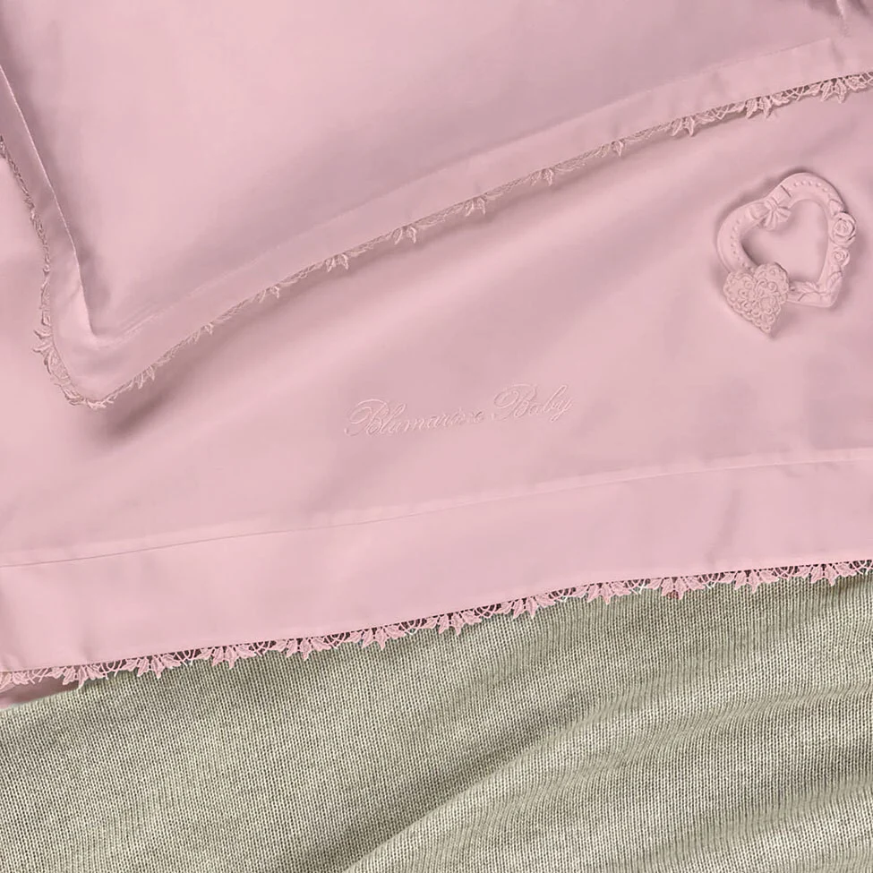Completo lenzuola 3 pezzi per culla in raso di cotone tinta unita con logo Blumarine ricamato.