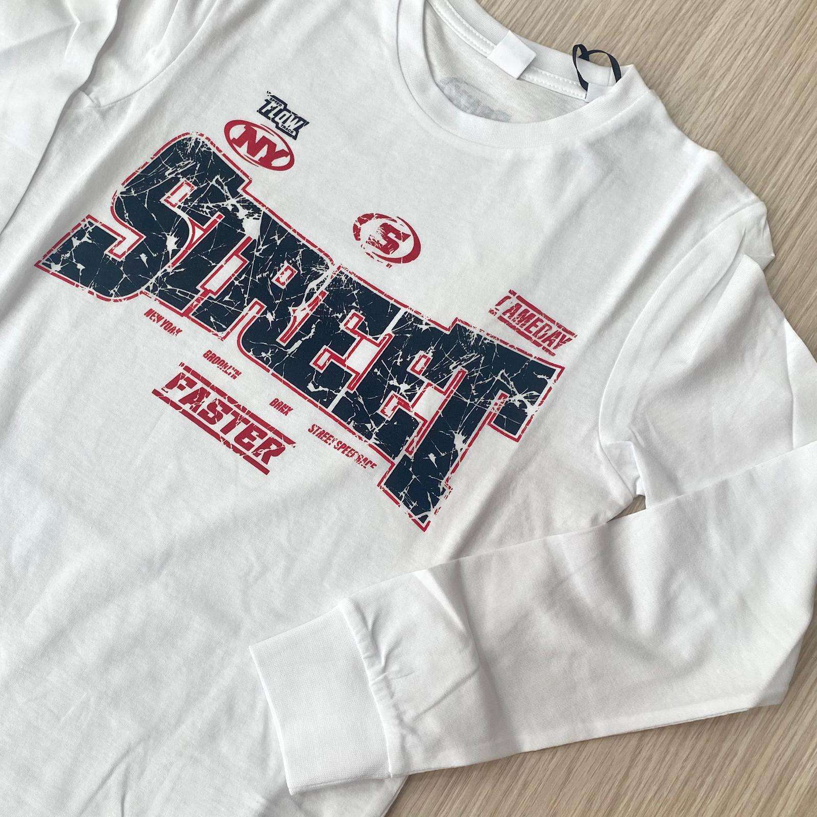 Maglia a manica lunga in cotone bianco, dal design urbano e sportivo. Sul fronte spicca una stampa grafica effetto vintage con scritta centrale “STREET” in stile distressed, arricchita da dettagli e lettering ispirati alla cultura street di New York. Il contrasto dei colori nero e rosso dona carattere e dinamicità al capo. Vestibilità regolare, girocollo classico e polsini elasticizzati per un comfort ottimale. Perfetta per un look casual e contemporaneo, ideale da abbinare a jeans o pantaloni sportivi per un outfit quotidiano dal forte impatto stilistico.