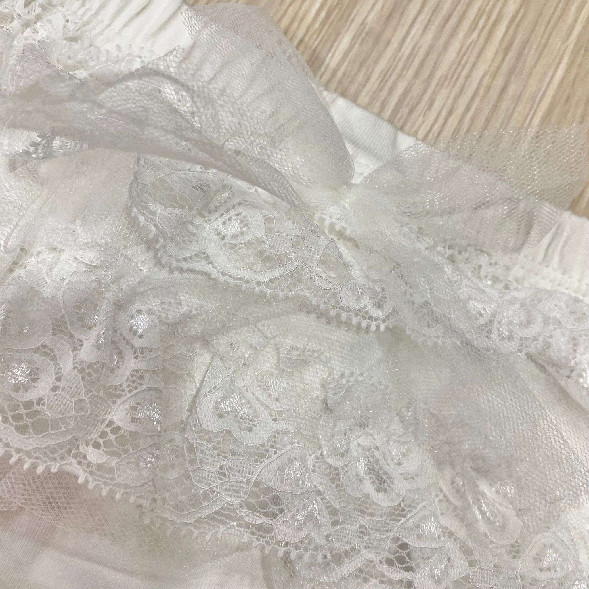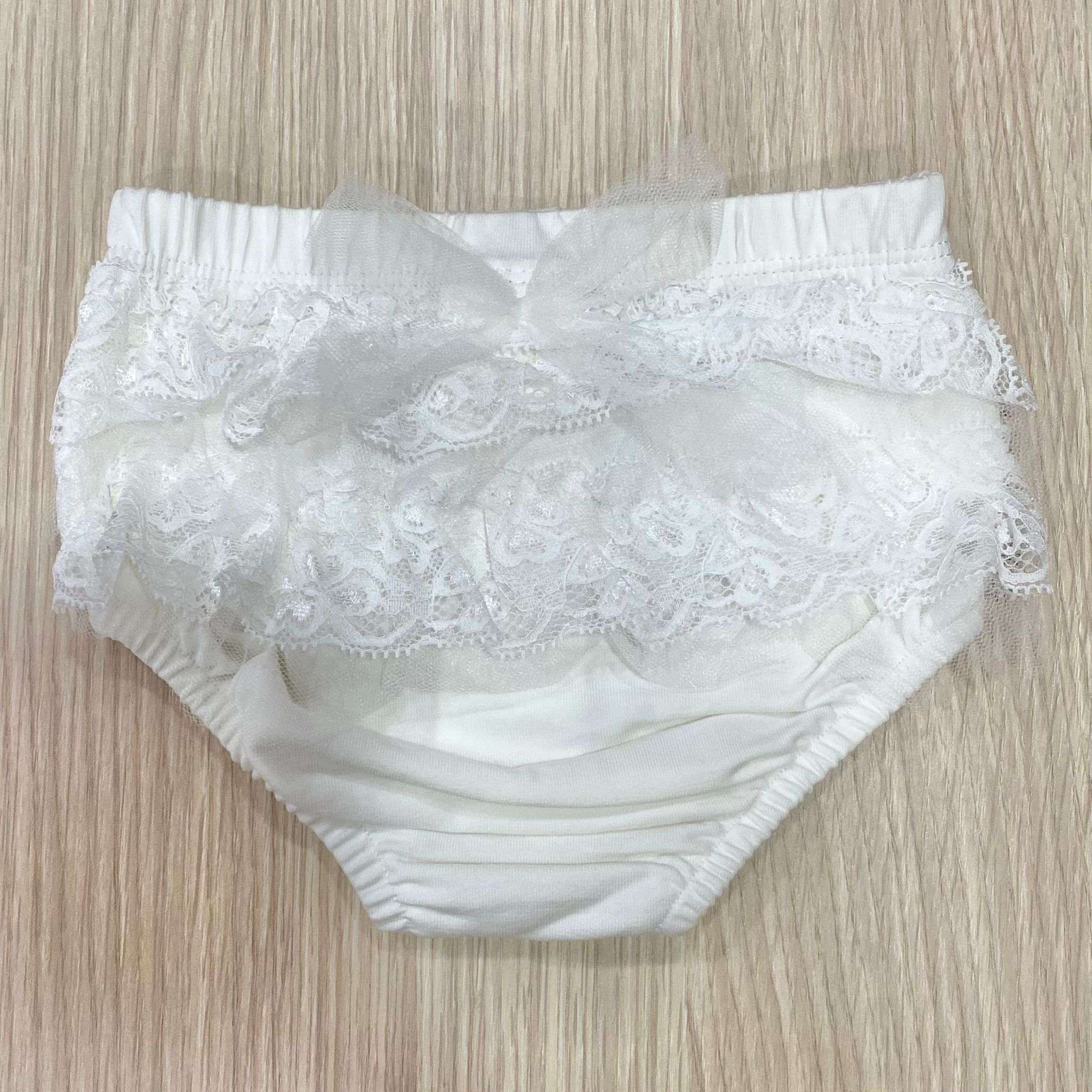 Mutandina copripannolino neonata/bambina in cotone elasticizzato, di colore panna, con balze a riccetto alternate con tulle e applicazione di fiocchetto centrale.