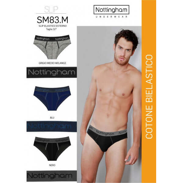 Nottingham Slip S83 Pack Assortito 6pz. Slip da uomo, fianco medio, in cotone elasticizzato con elastico esterno. Disponibile nei colori Nero, e Assortito. La confezione assortita รจ composta dai colori: X2Nero, X2Grigio, X2Blu.