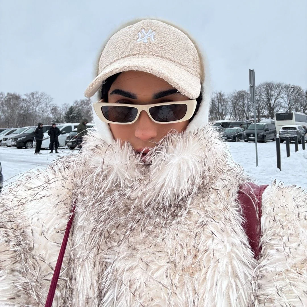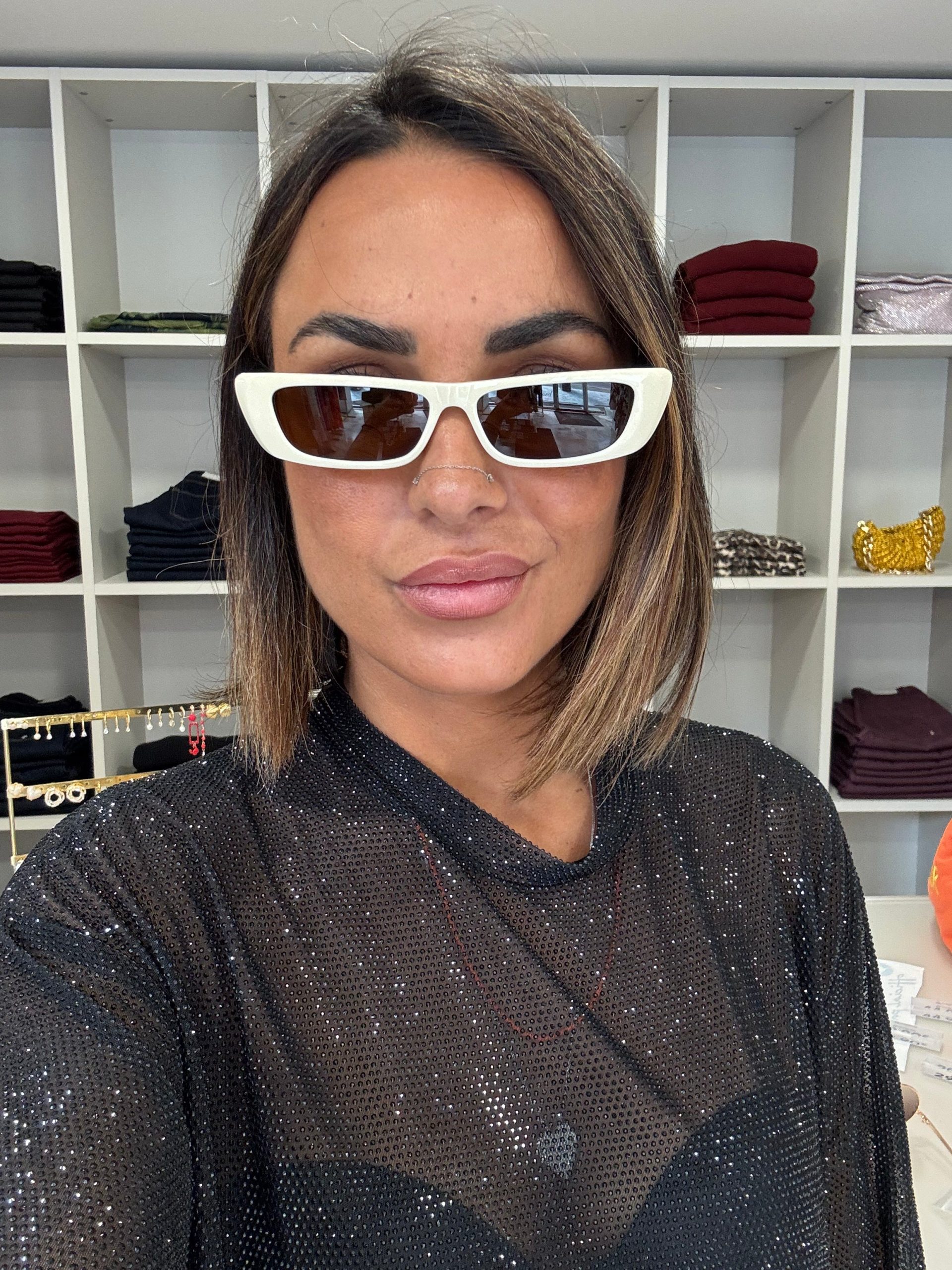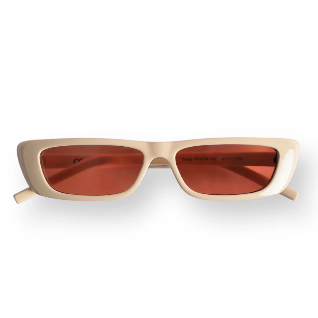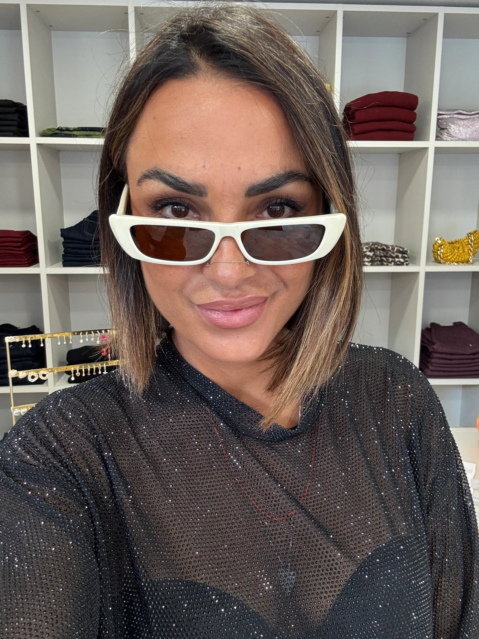 Occhiale da sole con montatura rettangolare e spessa in acetato.