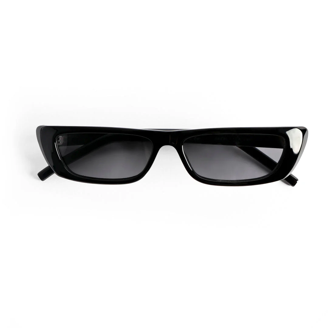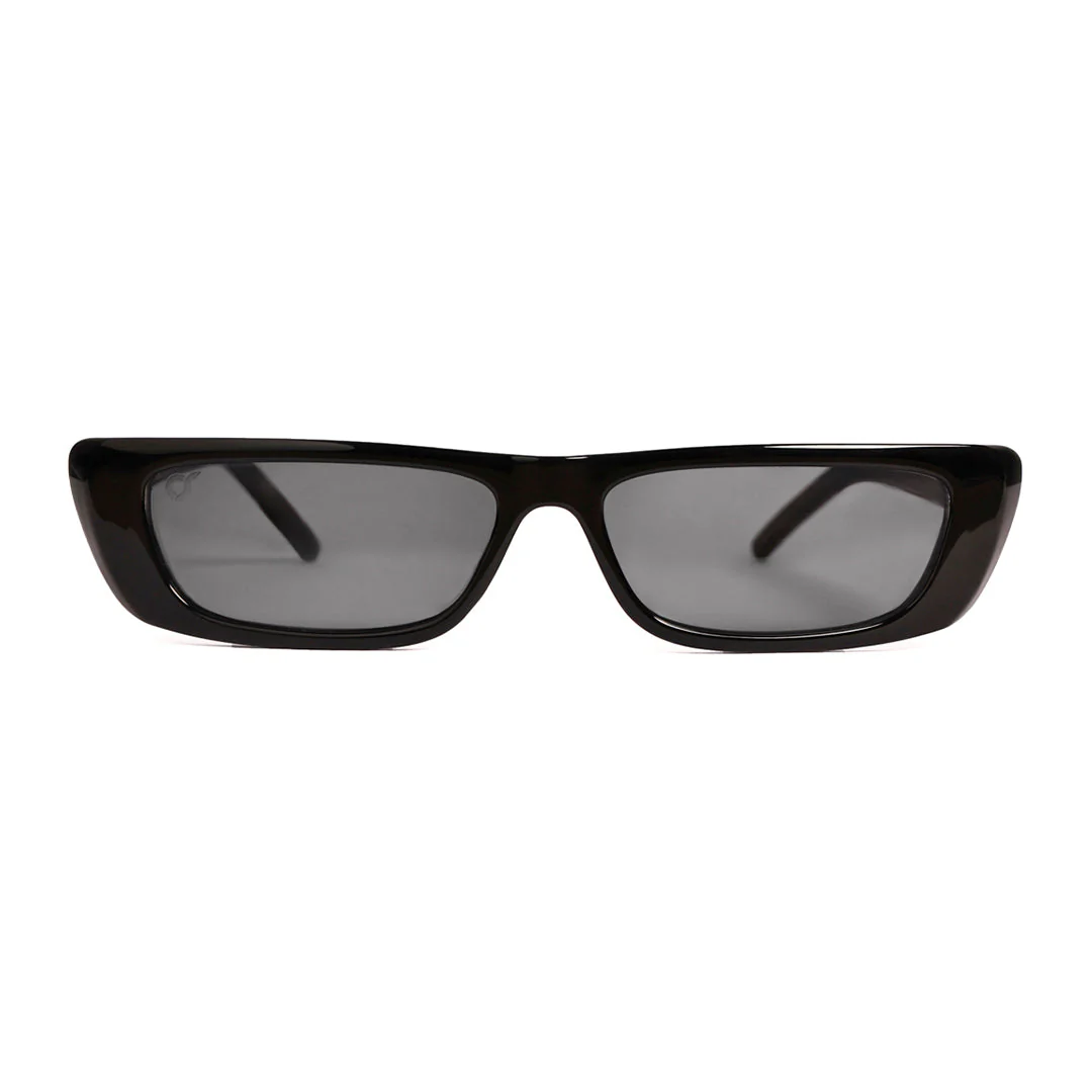 Occhiale da sole con montatura rettangolare e spessa in acetato.