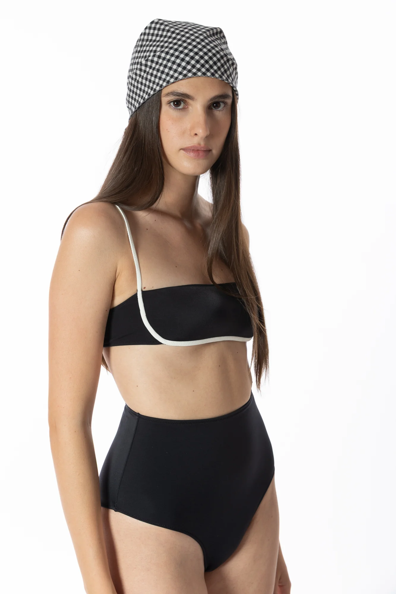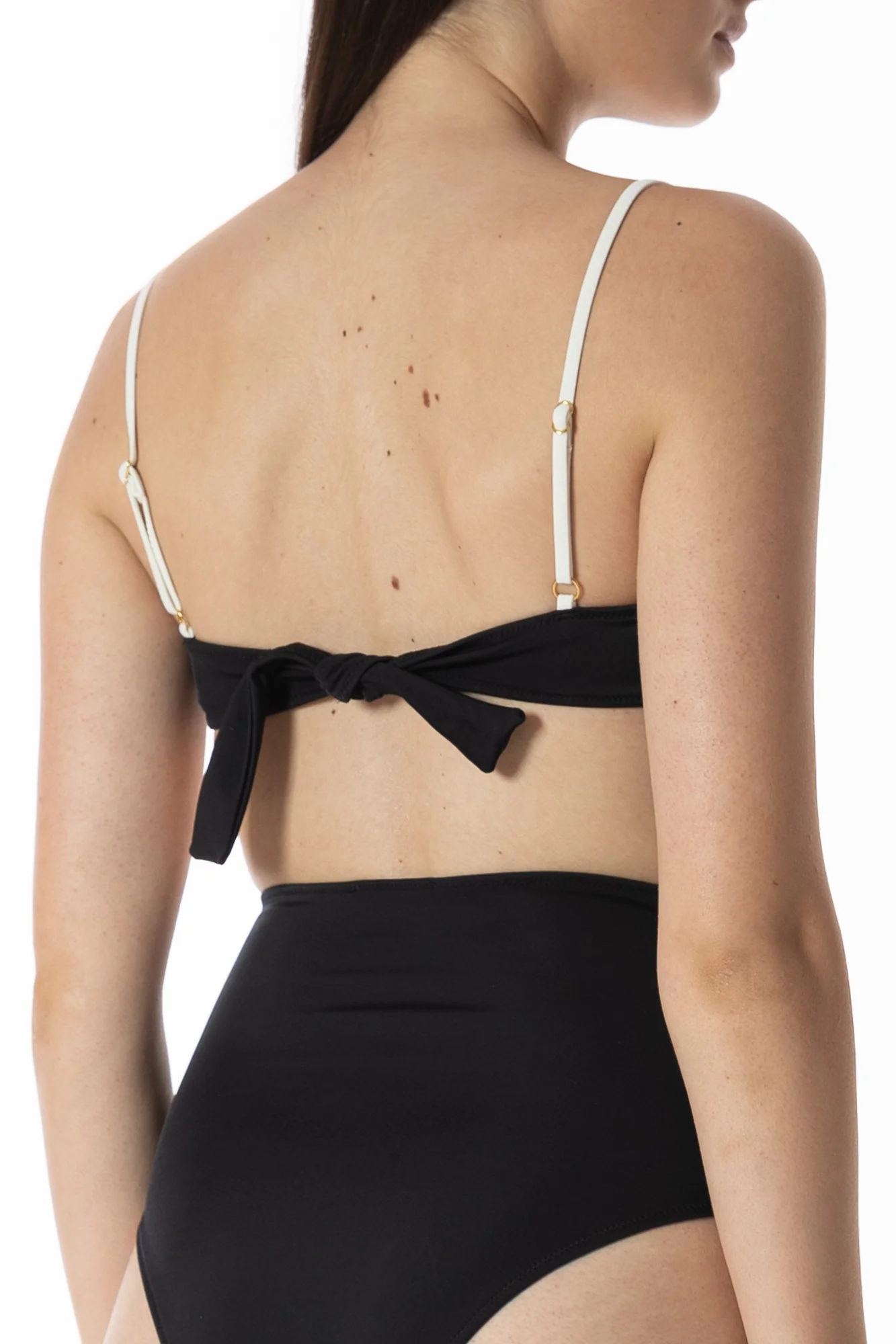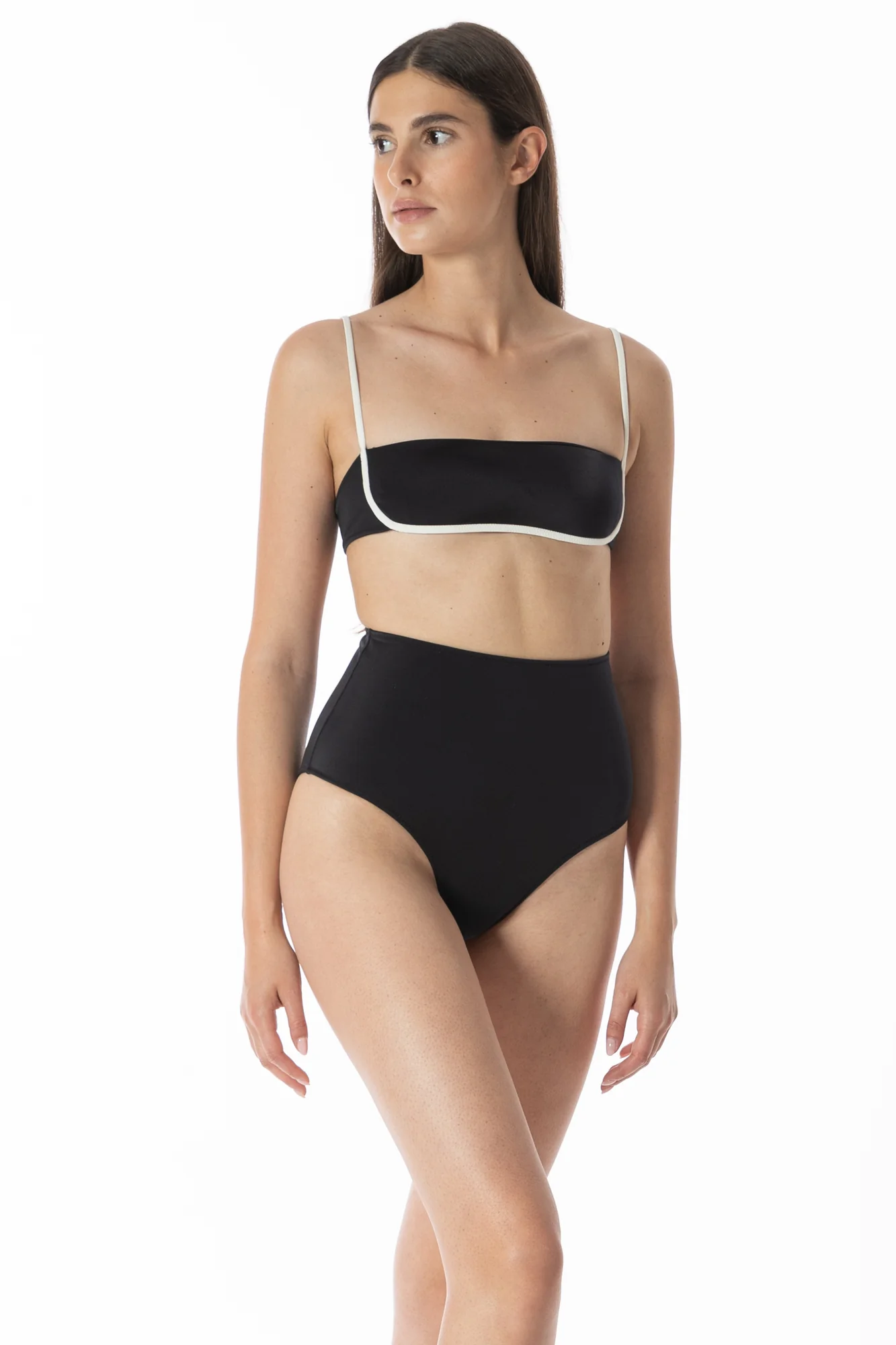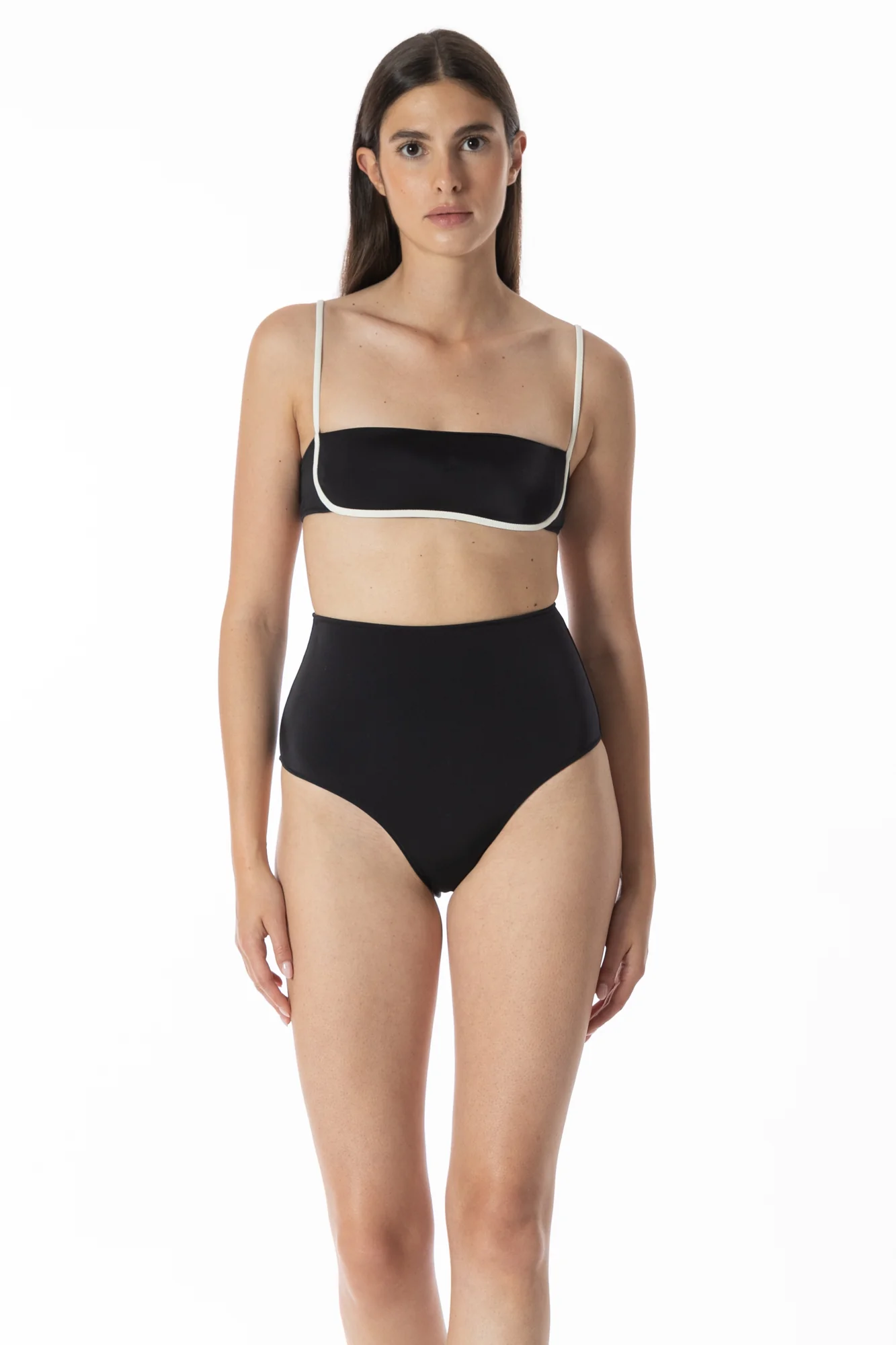 Il top bikini fascia Olympia nella variante nero & burro propone un contrasto deciso e sofisticato. La base nera, sobria e chic, è incorniciata da profili color avorio che ne accentuano l’essenzialità elegante. Spalline sottili, laccetti regolabili e coppe estraibili rendono questo top pratico e al temp