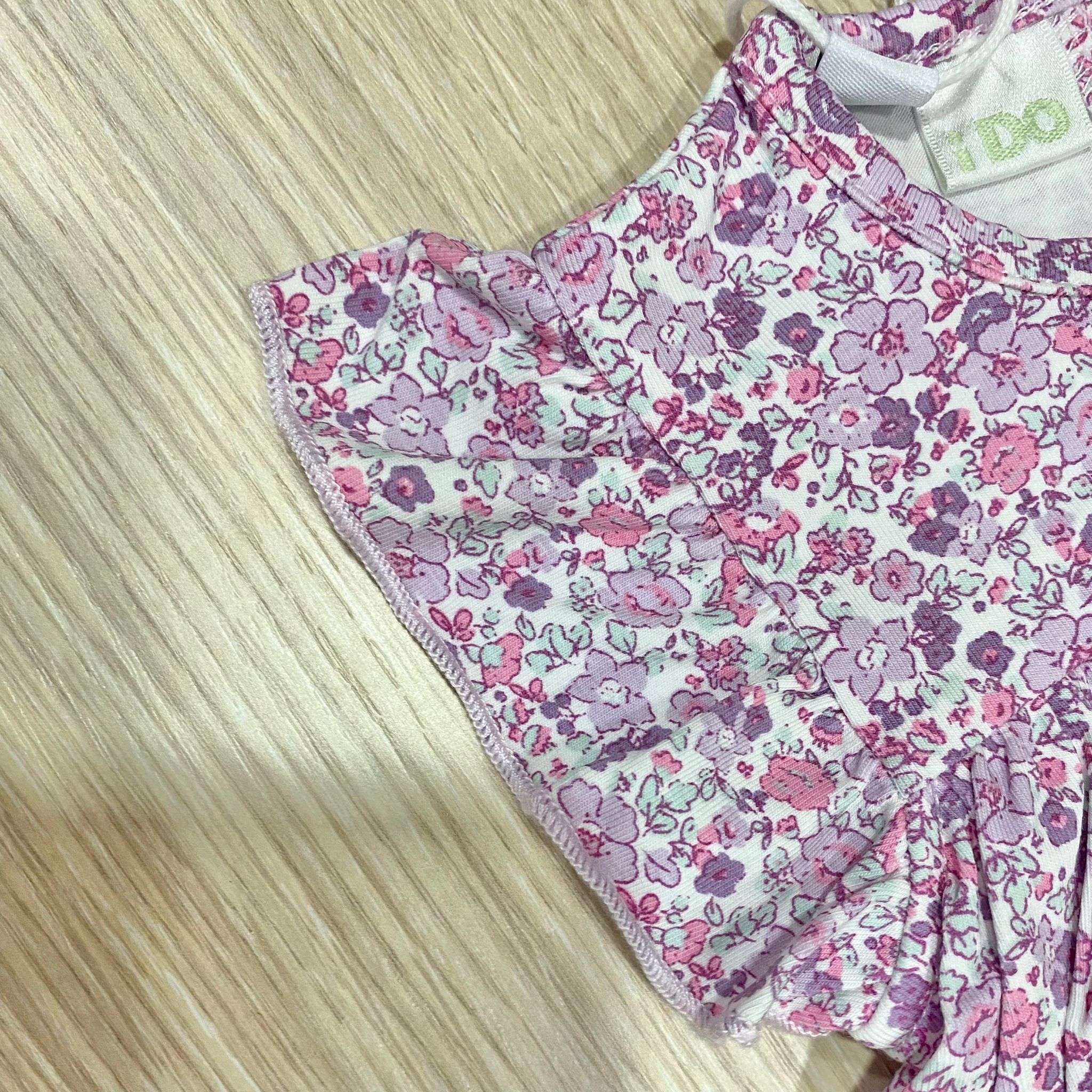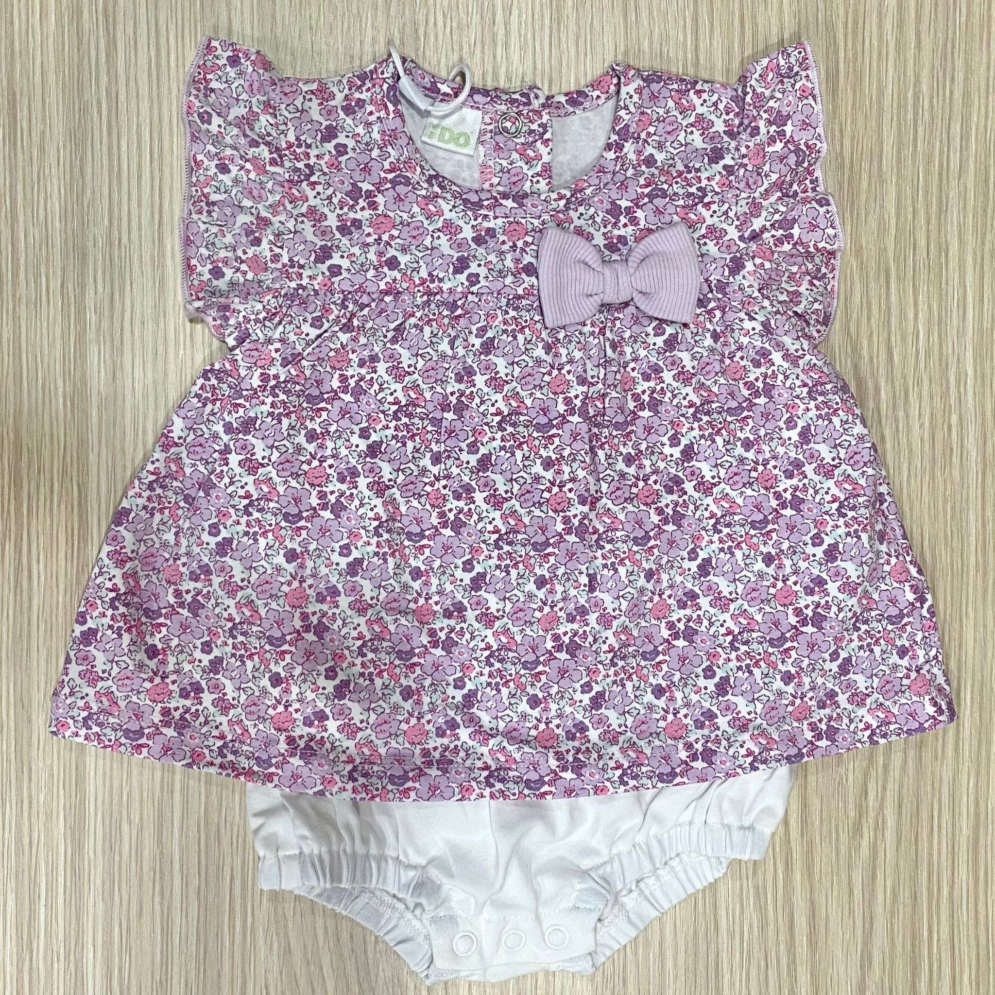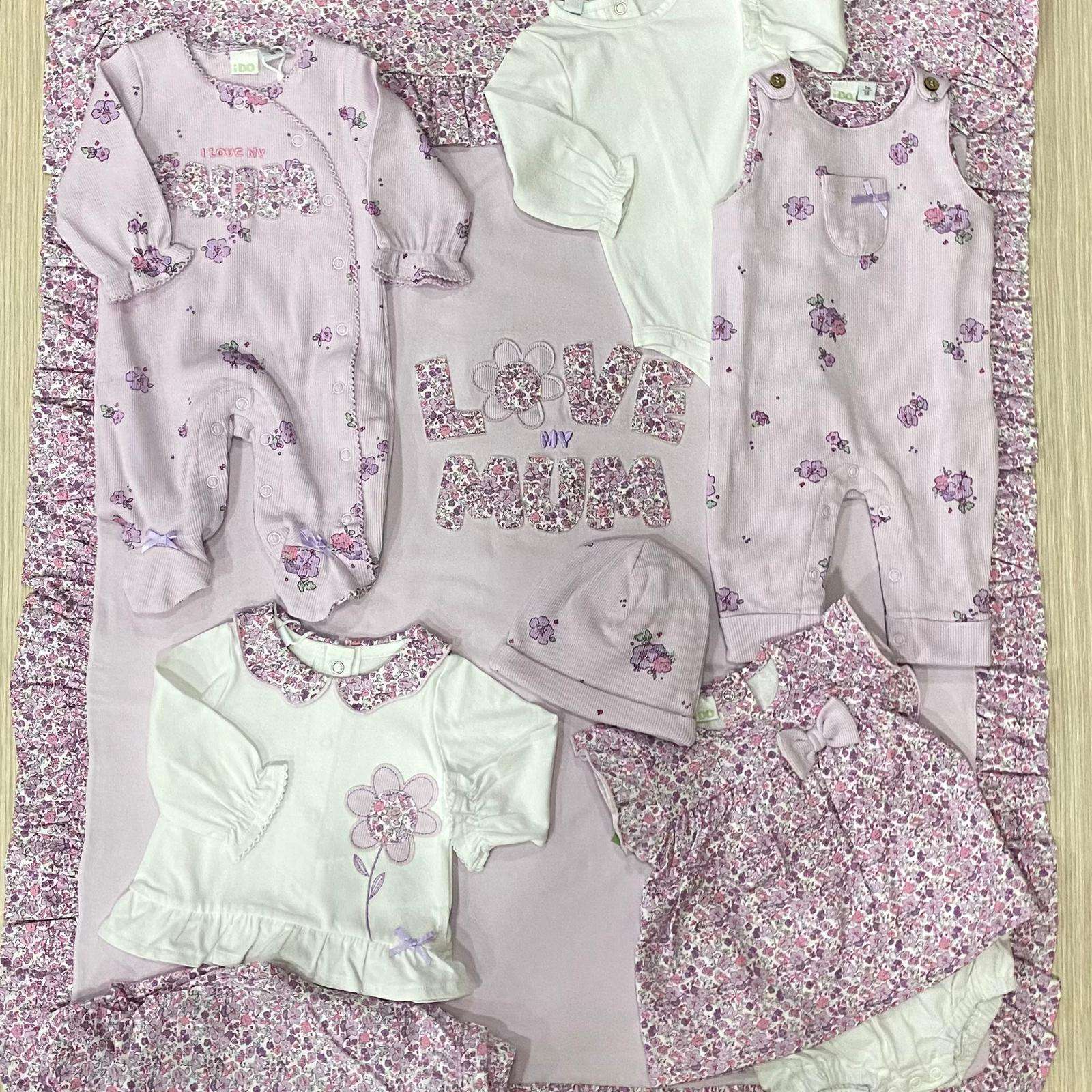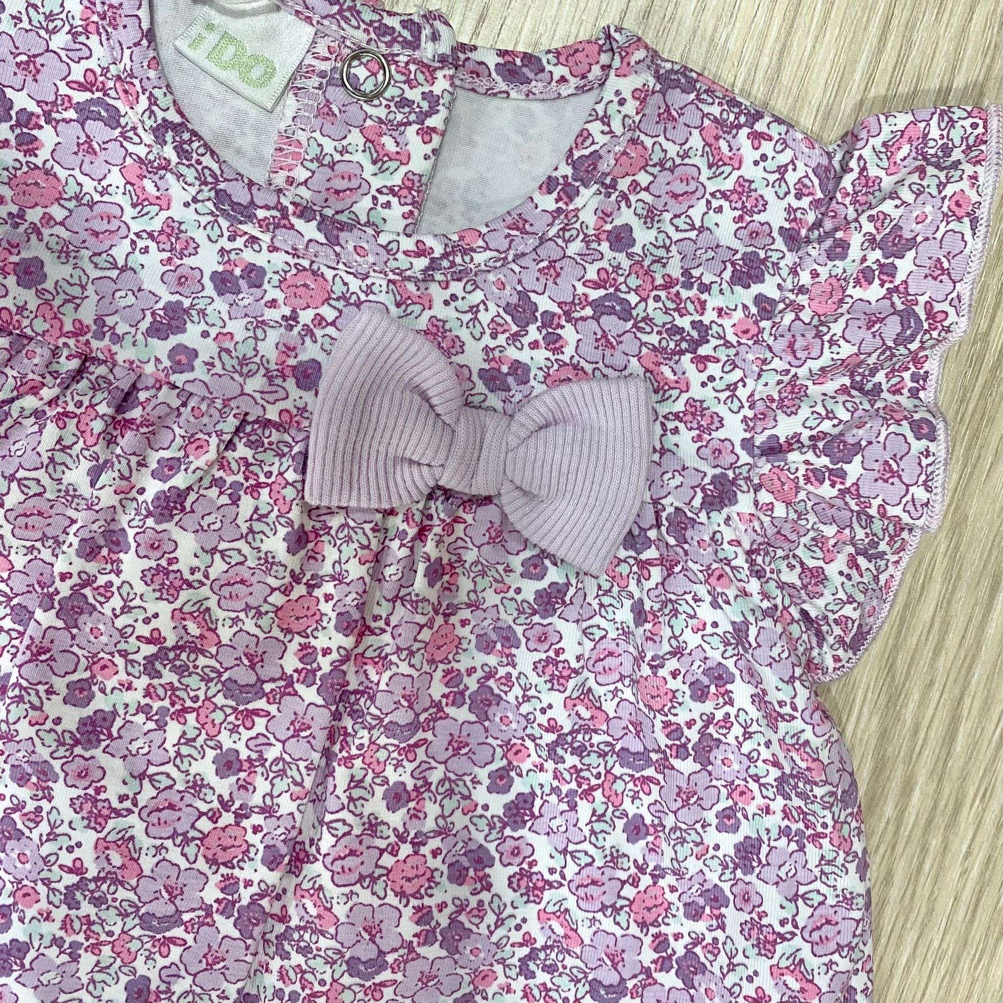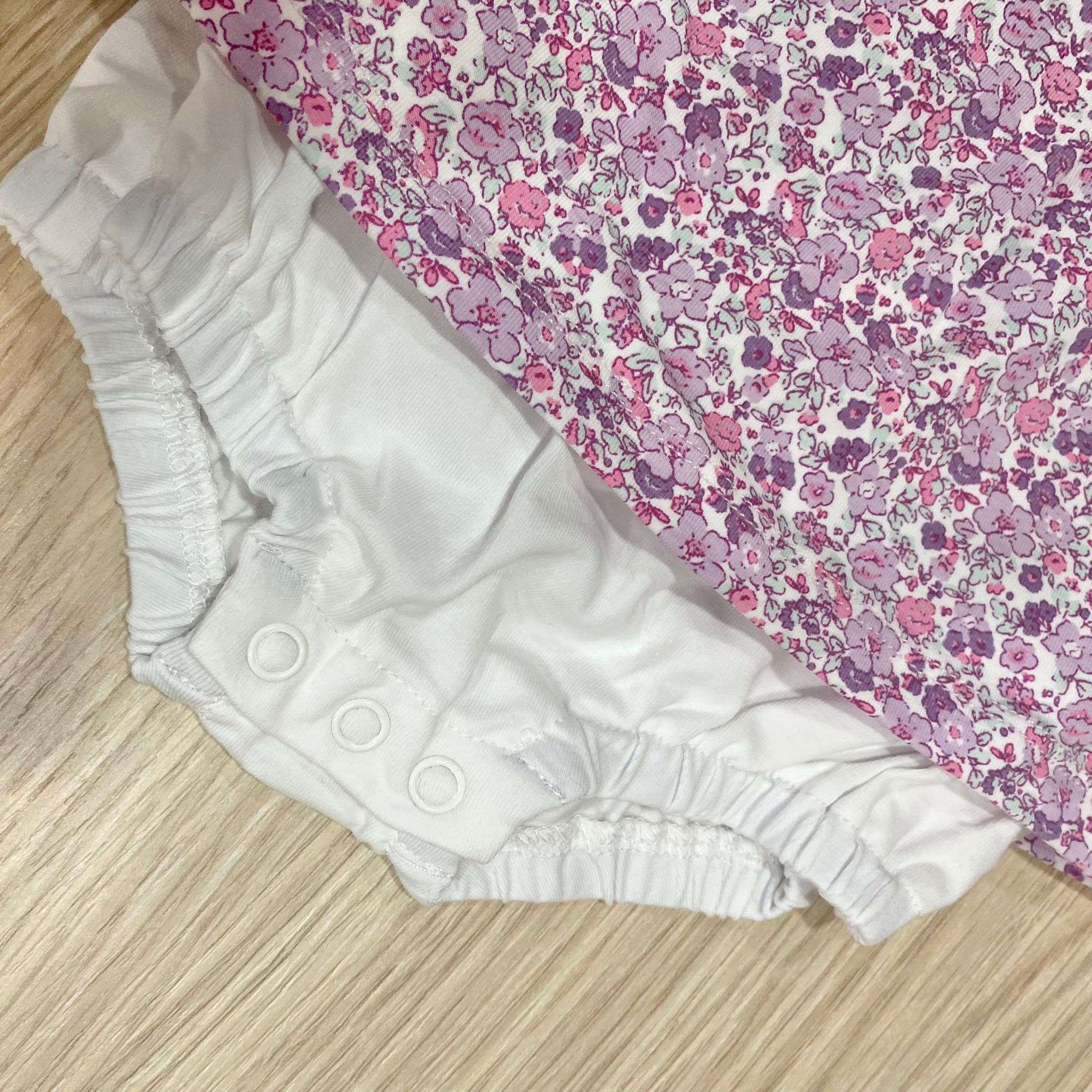Pagliaccetto neonata in cotone, di colore lilla e bianco, disegni floreali di vari colori.
