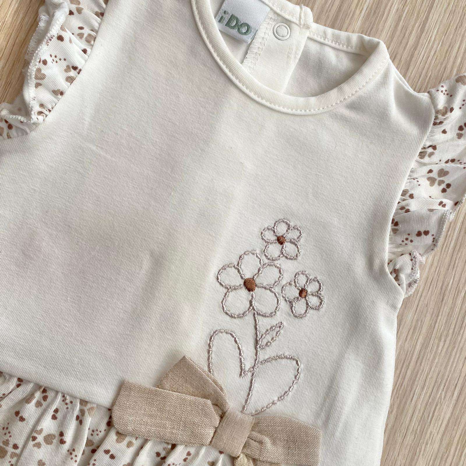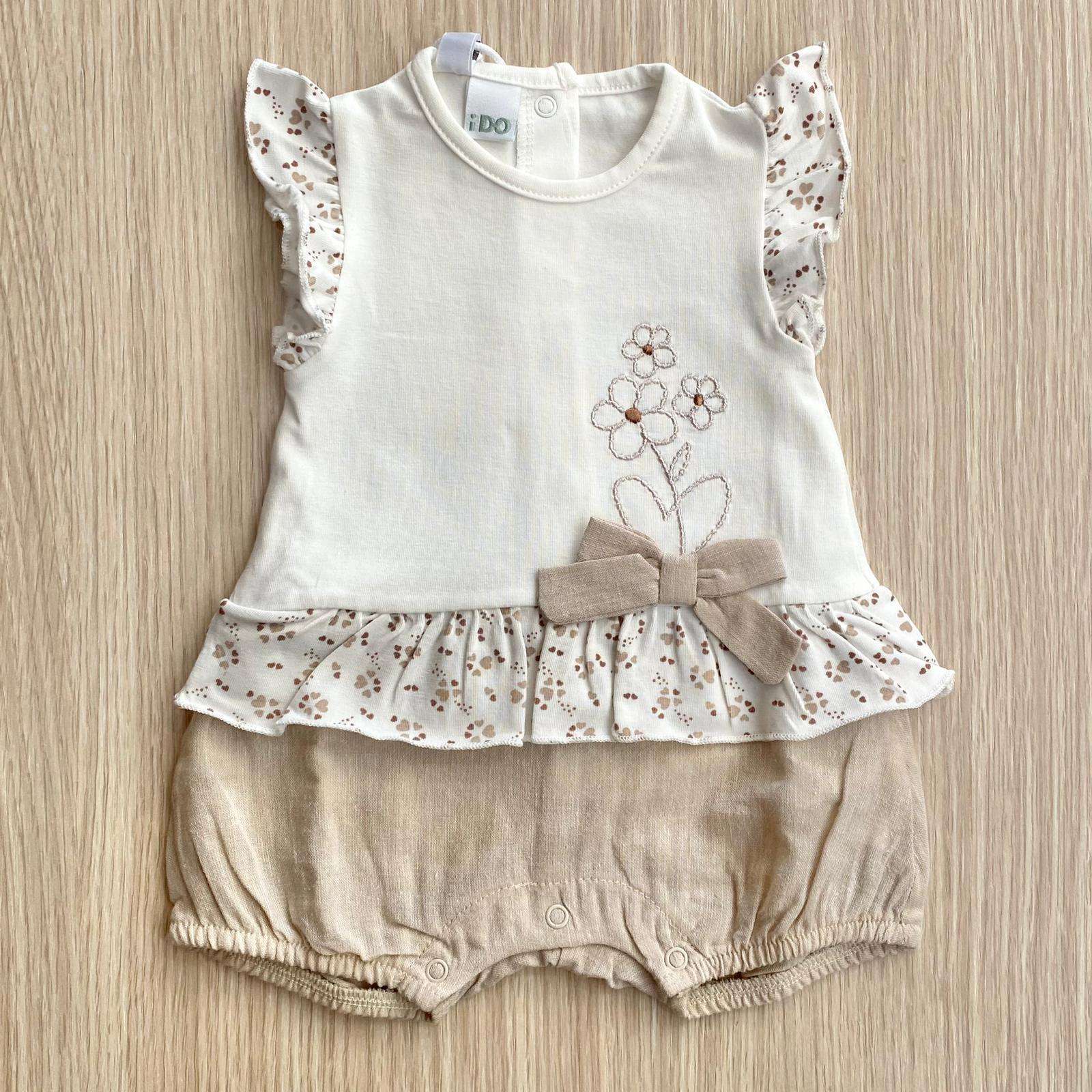 Pagliaccetto neonata in cotone, di colore panna e beige, con dettagli ricamati e applicazione di fiocchetto in tessuto. 0 Mesi: 50 cm. 1 Mese: 56 cm. 3 Mesi: 62 cm. 6 mesi: 68 cm.