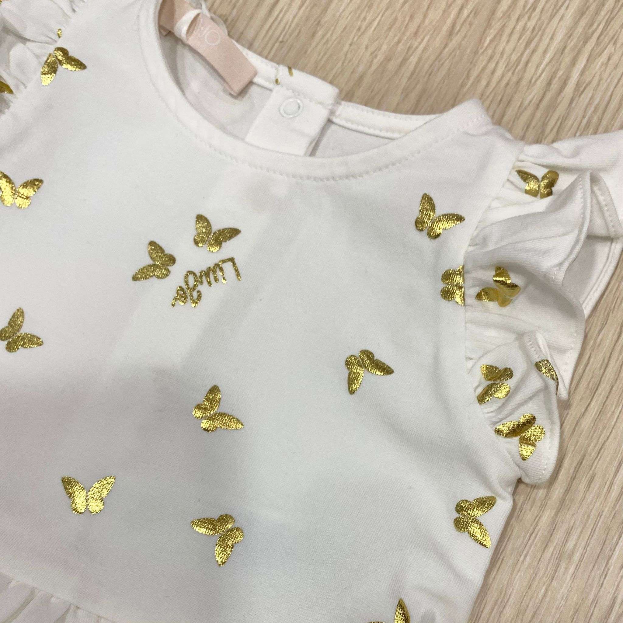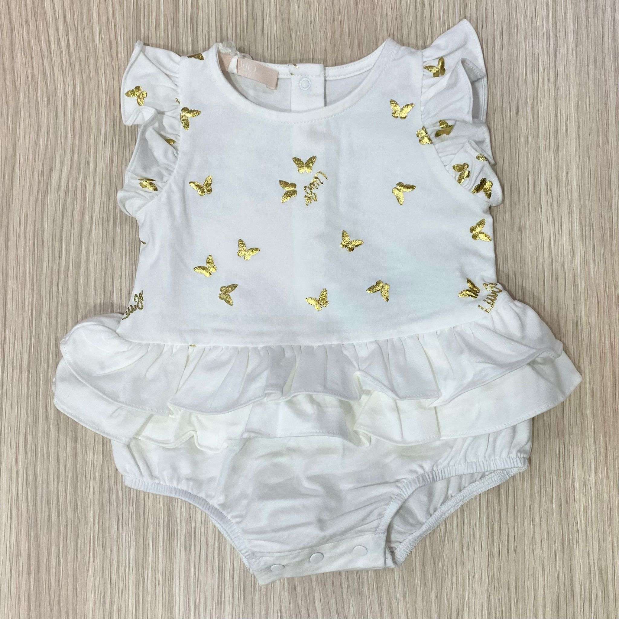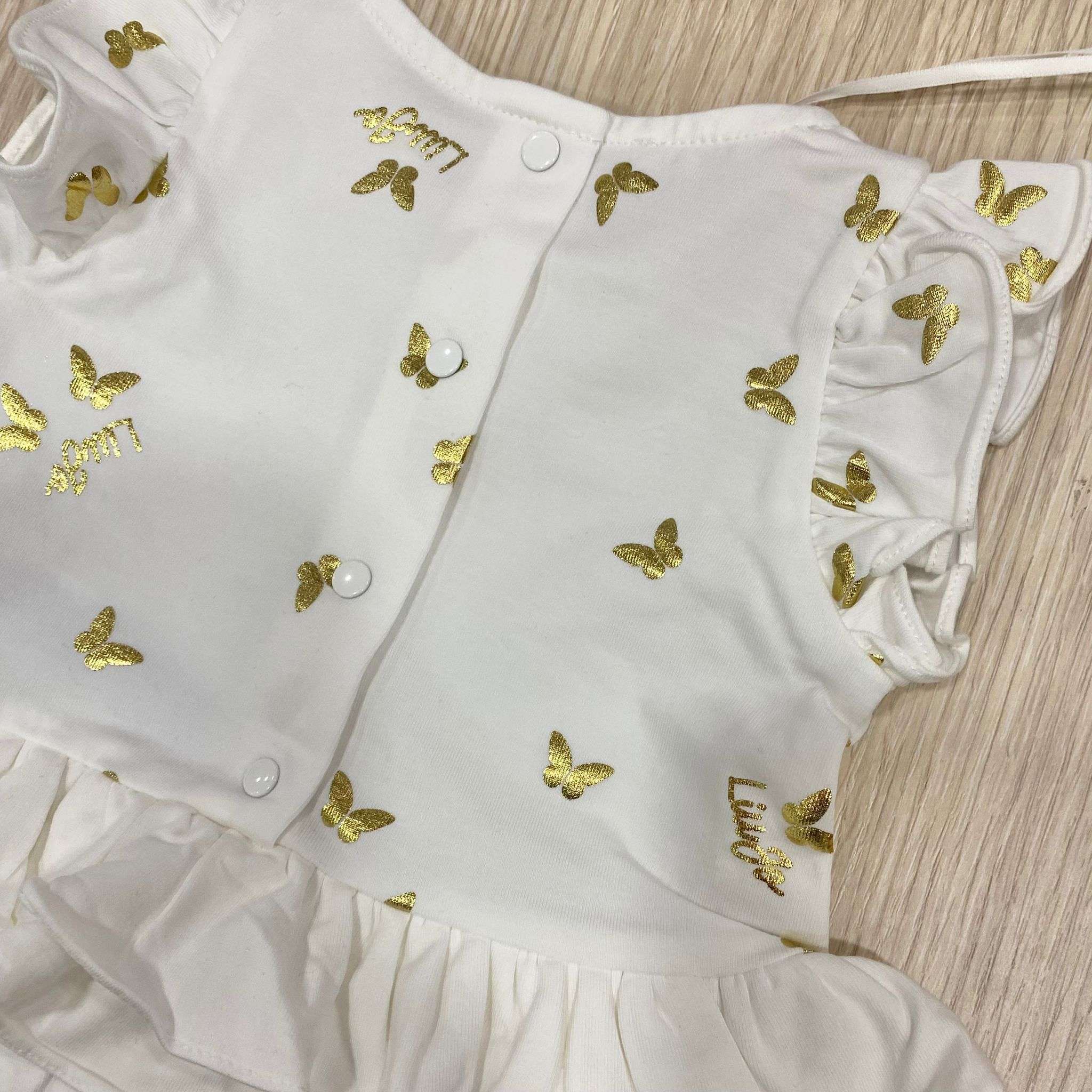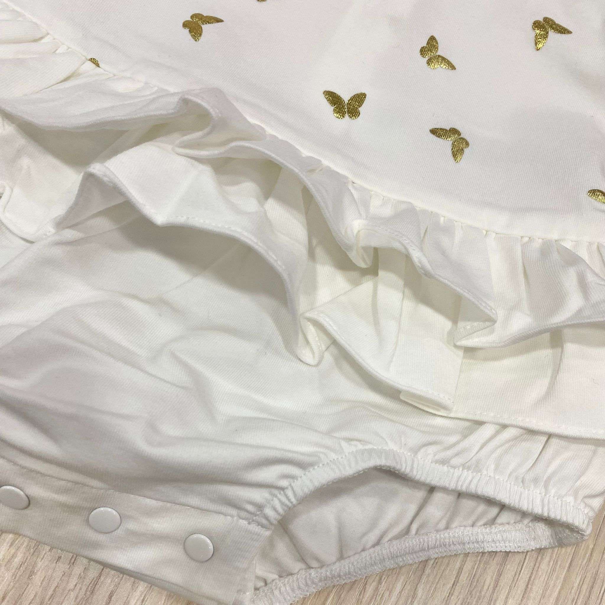Pagliaccetto neonata in cotone, di colore bianco, con stampa di farfalle e logo di colore oro, con dettaglio di vari balze di riccetti.