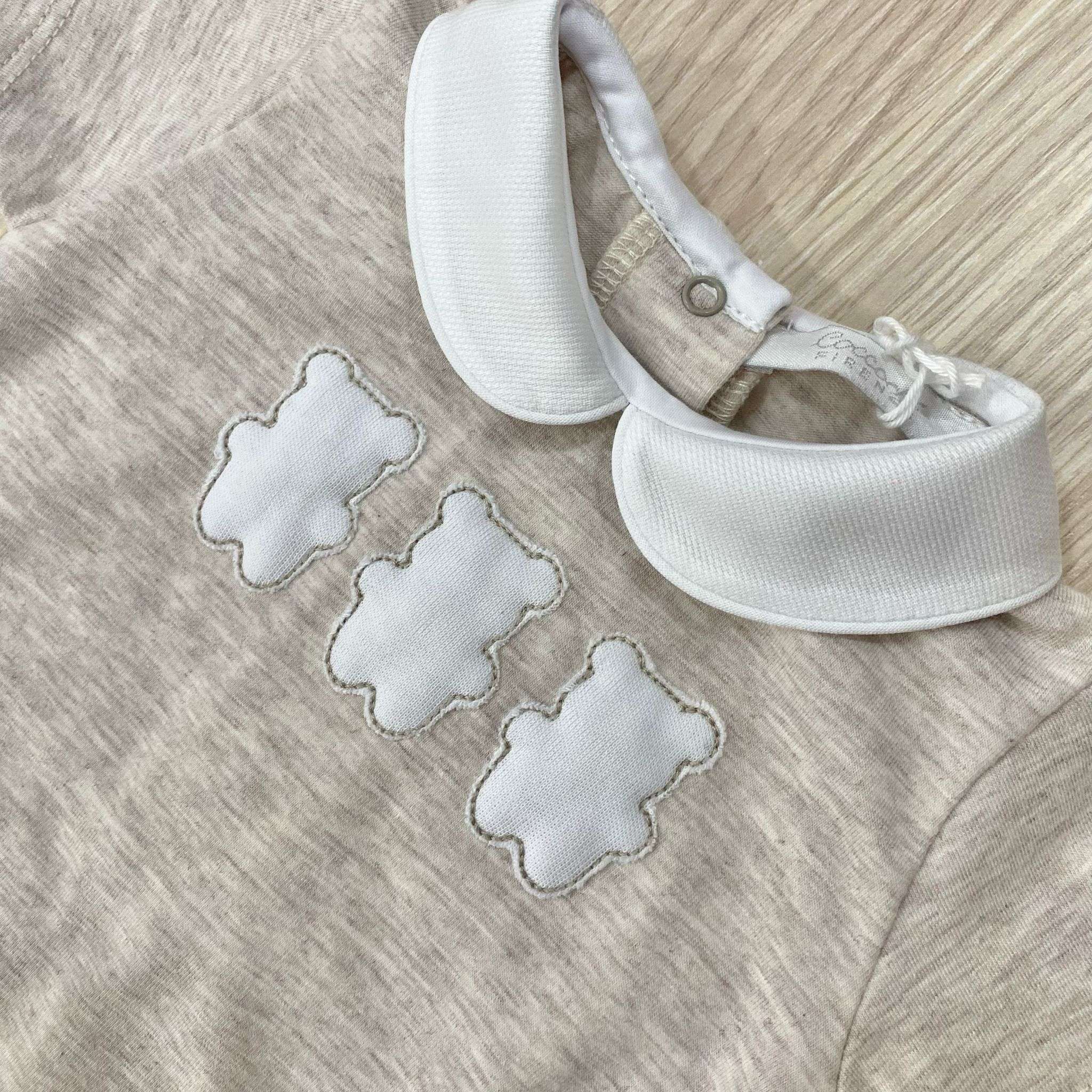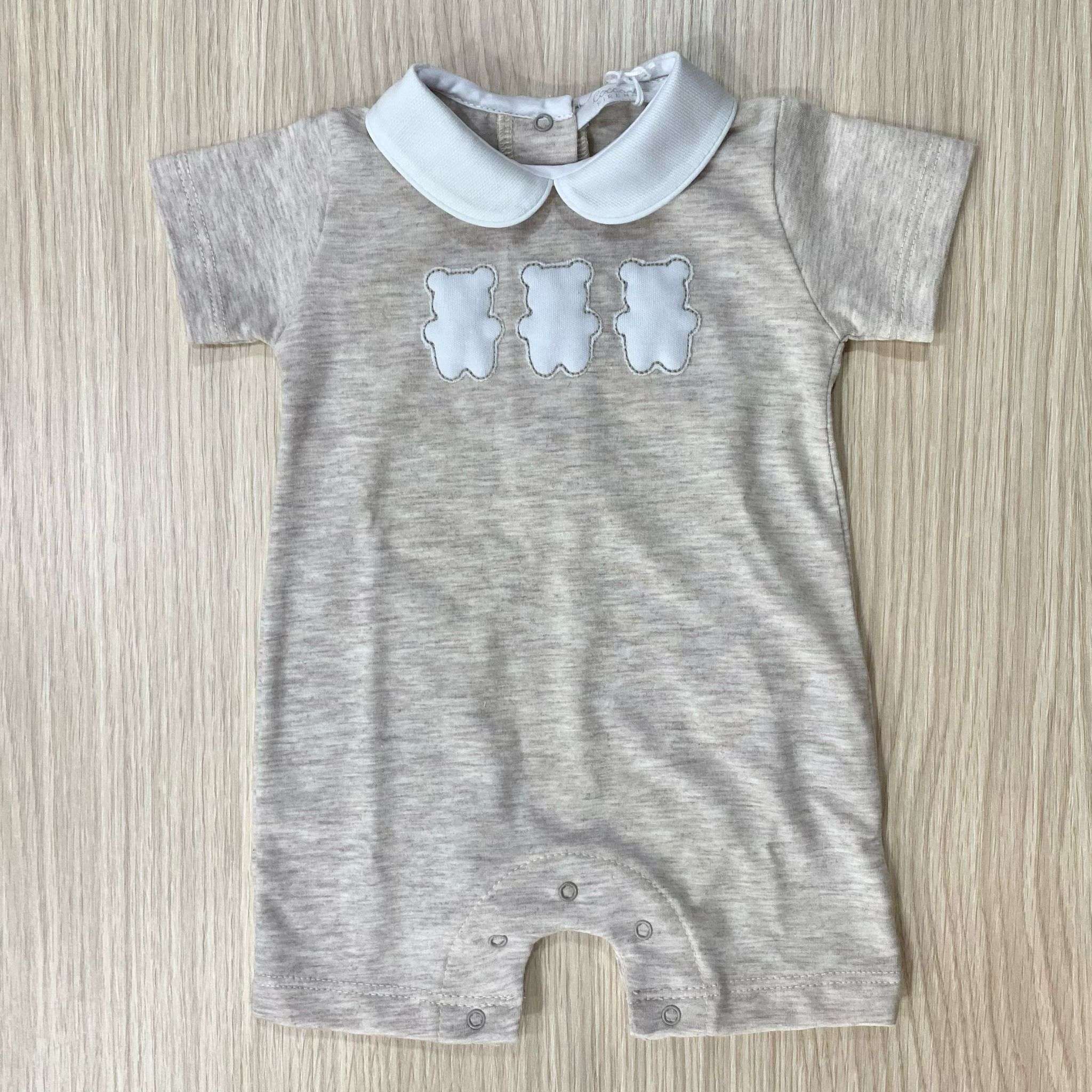 Pagliaccetto neonato in cotone, di colore sabbia e bianco, con disegno in rilievo. 0 Mesi: 50 cm. 1 Mese: 54 cm. 3 Mesi: 60 cm.