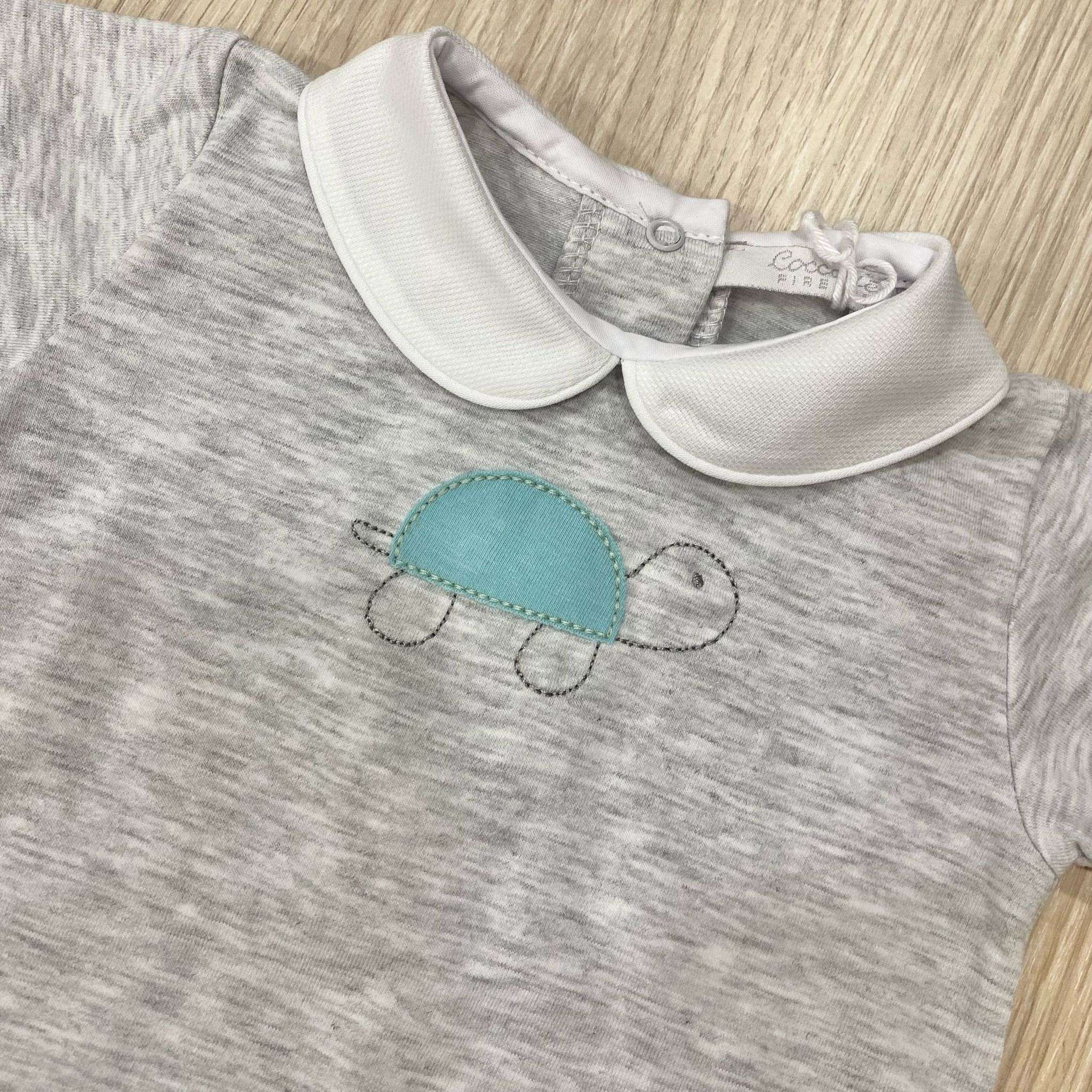 Pagliaccetto neonato in cotone, di colore grigio, con disegno in rilievo di colore verde acqua. 0 Mesi: 50 cm. 1 Mese: 54 cm. 3 Mesi: 60 cm.