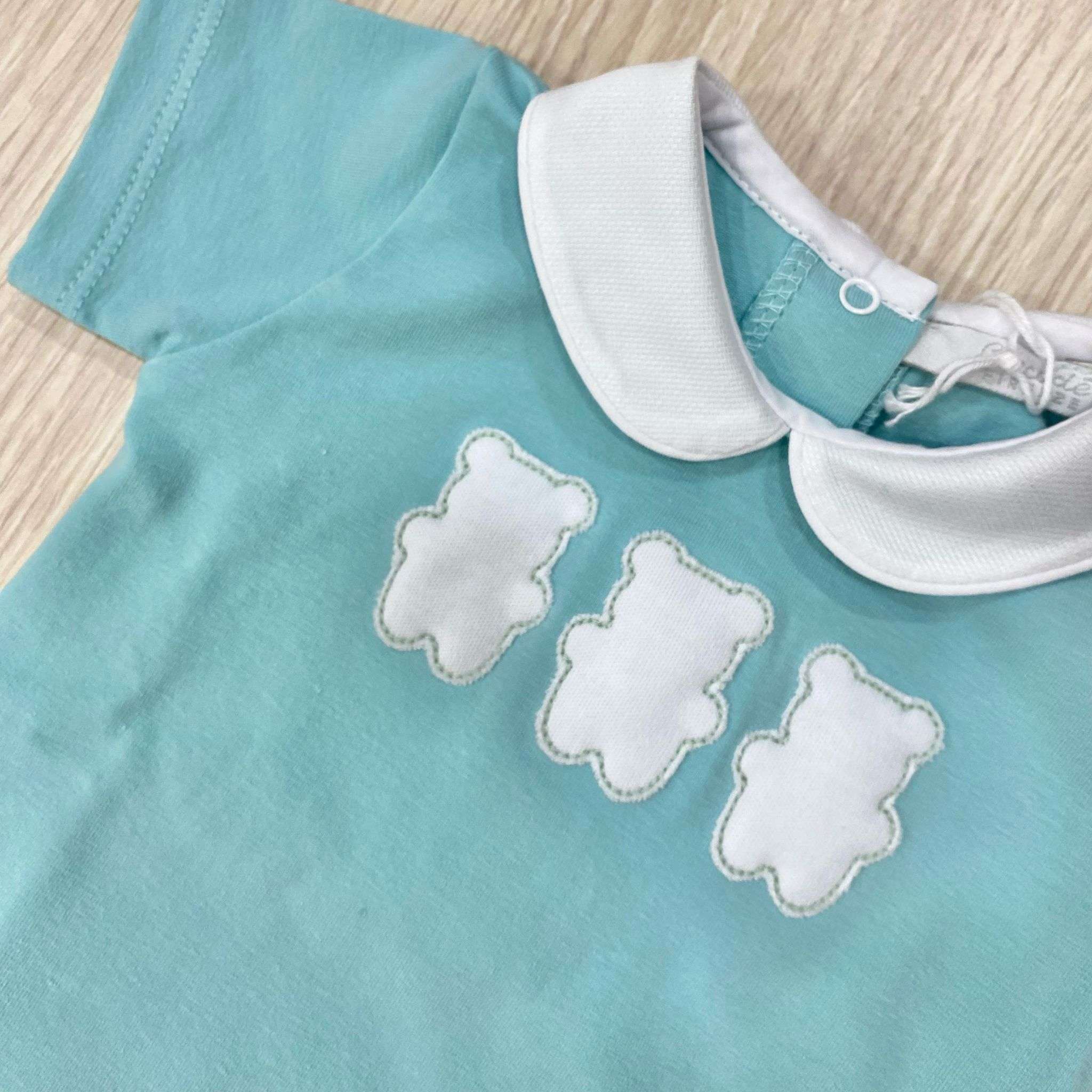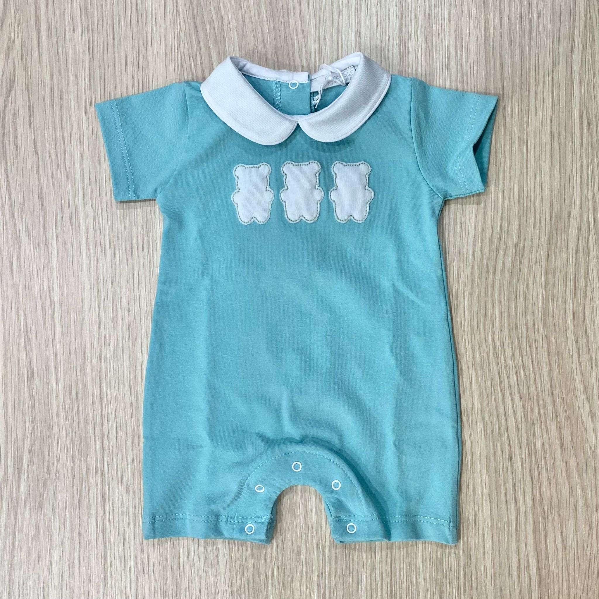 Pagliaccetto neonato in cotone, di colore verde acqua e bianco, con disegno in rilievo.. 0 Mesi: 50 cm. 1 Mese: 54 cm. 3 Mesi: 60 cm.