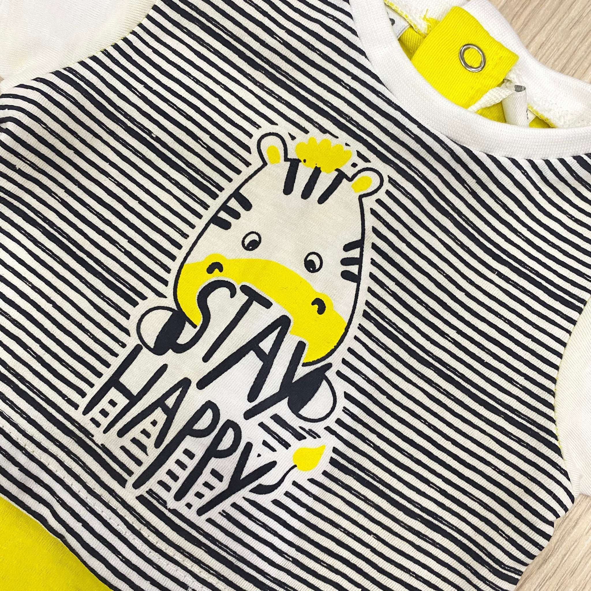 Pagliaccetto neonato in cotone, di colore bianco, nero e giallo, con disegno.