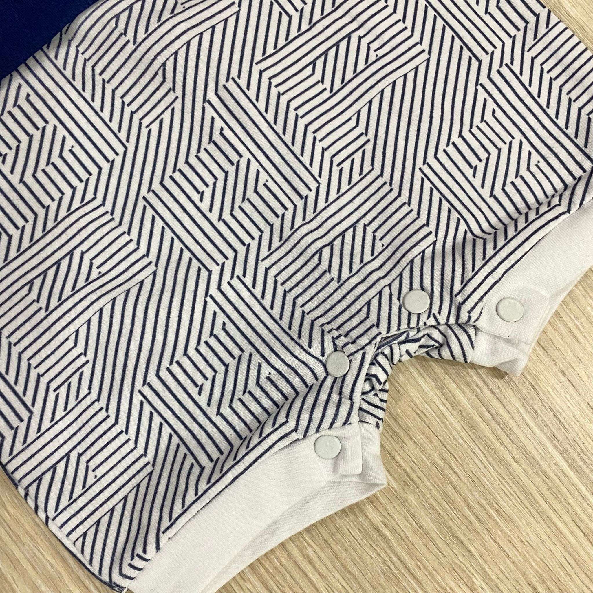 Pagliaccetto neonato in cotone, di colore bianco e blu, con applicazione di bottoncini. 95% Cotone. 5% Elastomero.