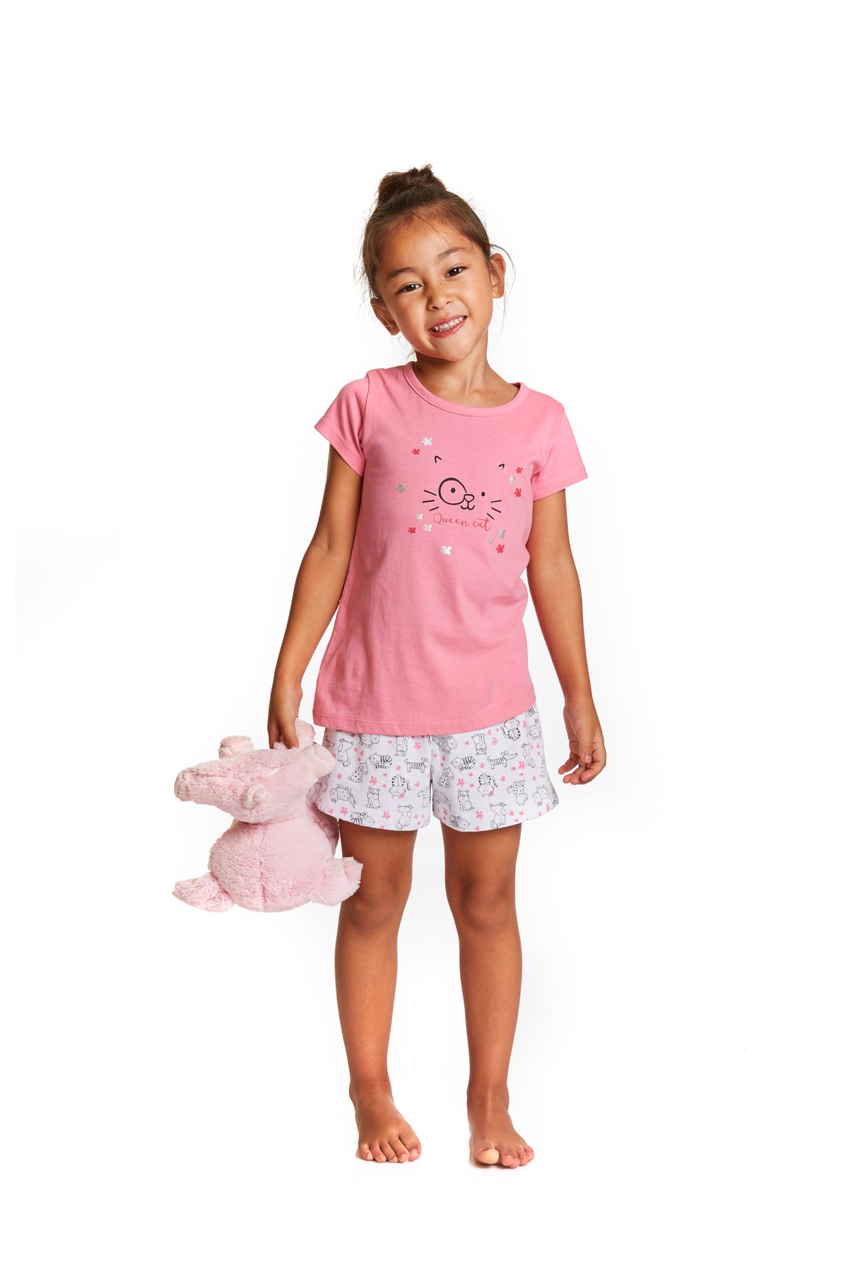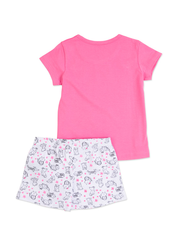 Pigiama a pantaloncini con stampa di animali per bambina. Pigiama a pantaloncini in jersey. Maglietta a manica corta di colore rosa con stampa sul davanti. Short di colore bianco tuttostampato con animali e fiori a contrasto con elastico in vita.