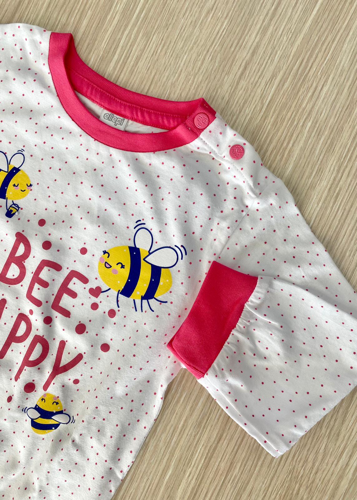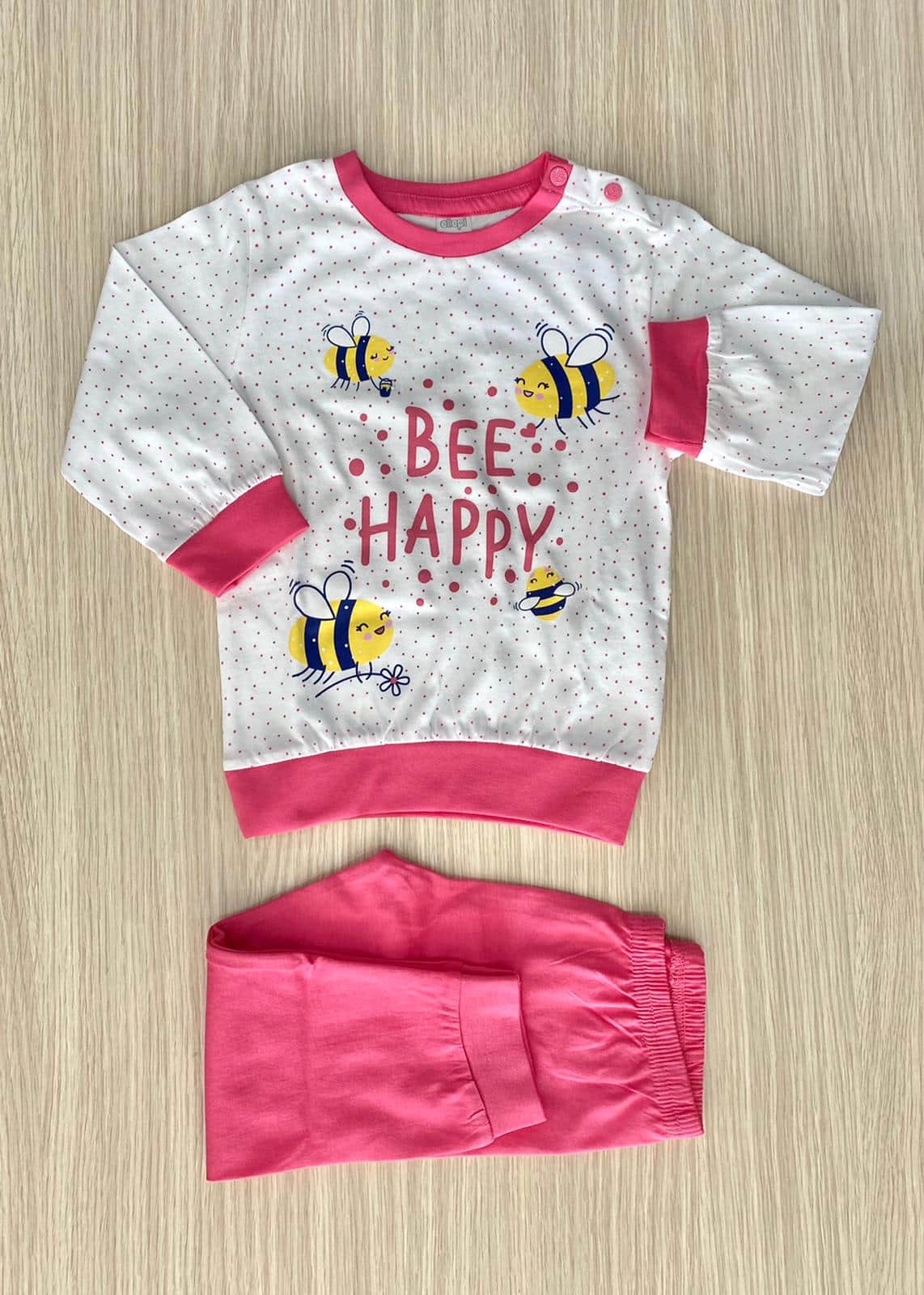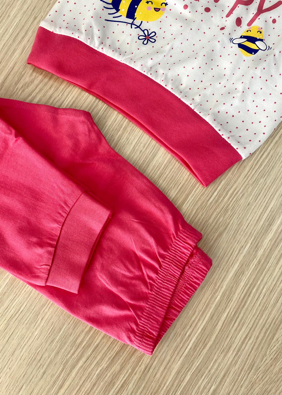 Pigiama due pezzi bambina, in cotone di colore bianco e fucsia con stampa di vari colori. Pigiama con polsini. 100% Cotone.