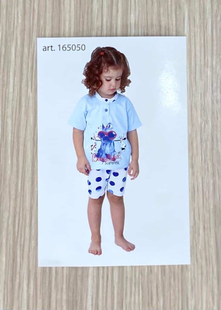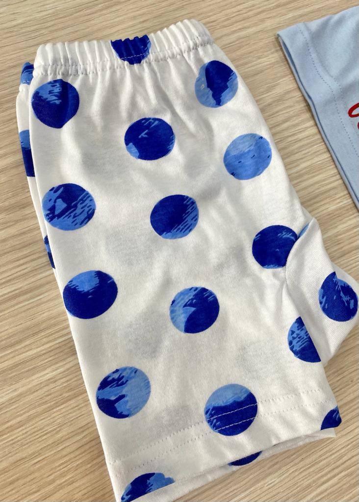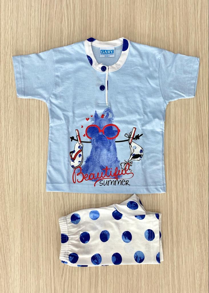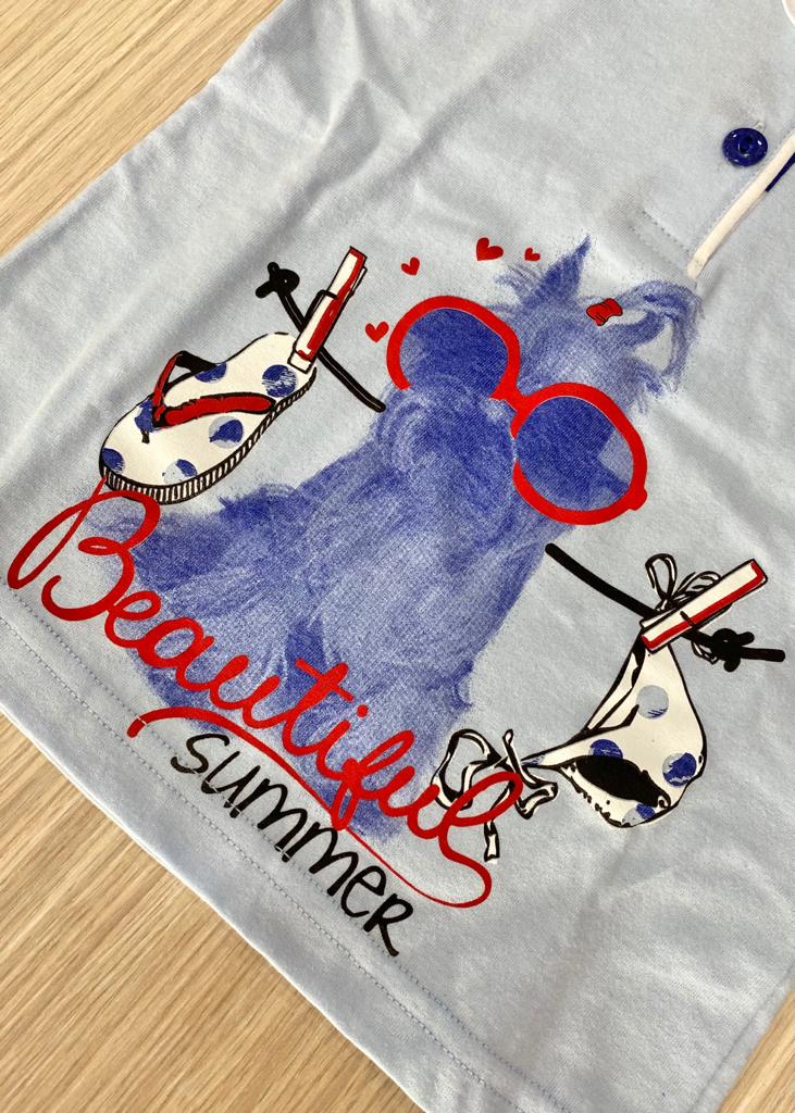 Pigiama bambina in morbido cotone, di colore azzurro e bianco con dettagli di vari colori. Pigiama bambina composto da t-shirt e pantaloncino. 100% Cotone.