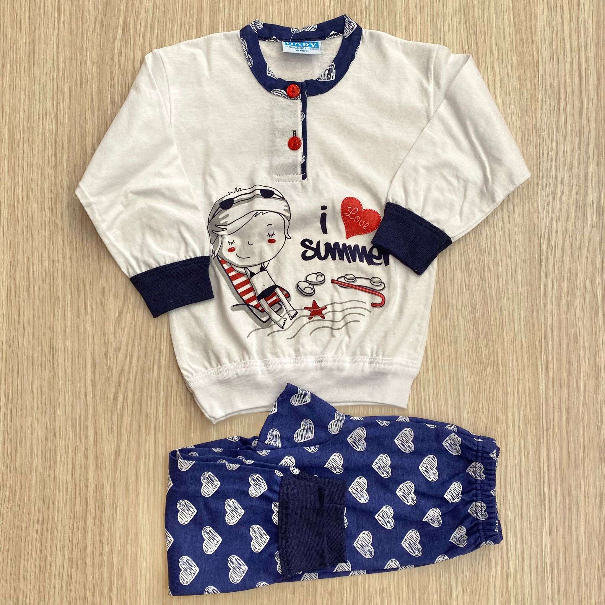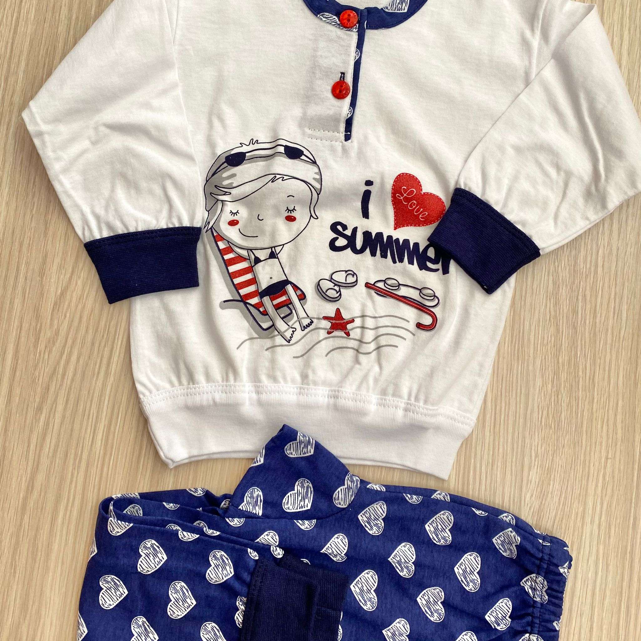 Pigiama bambina in cotone, di colore bianco e blu, con stampe di vari colori. Pigiama con polsini. 12 Mesi: 80 cm. 18 Mesi: 86 cm. 100% Cotone. Made in Italy.
