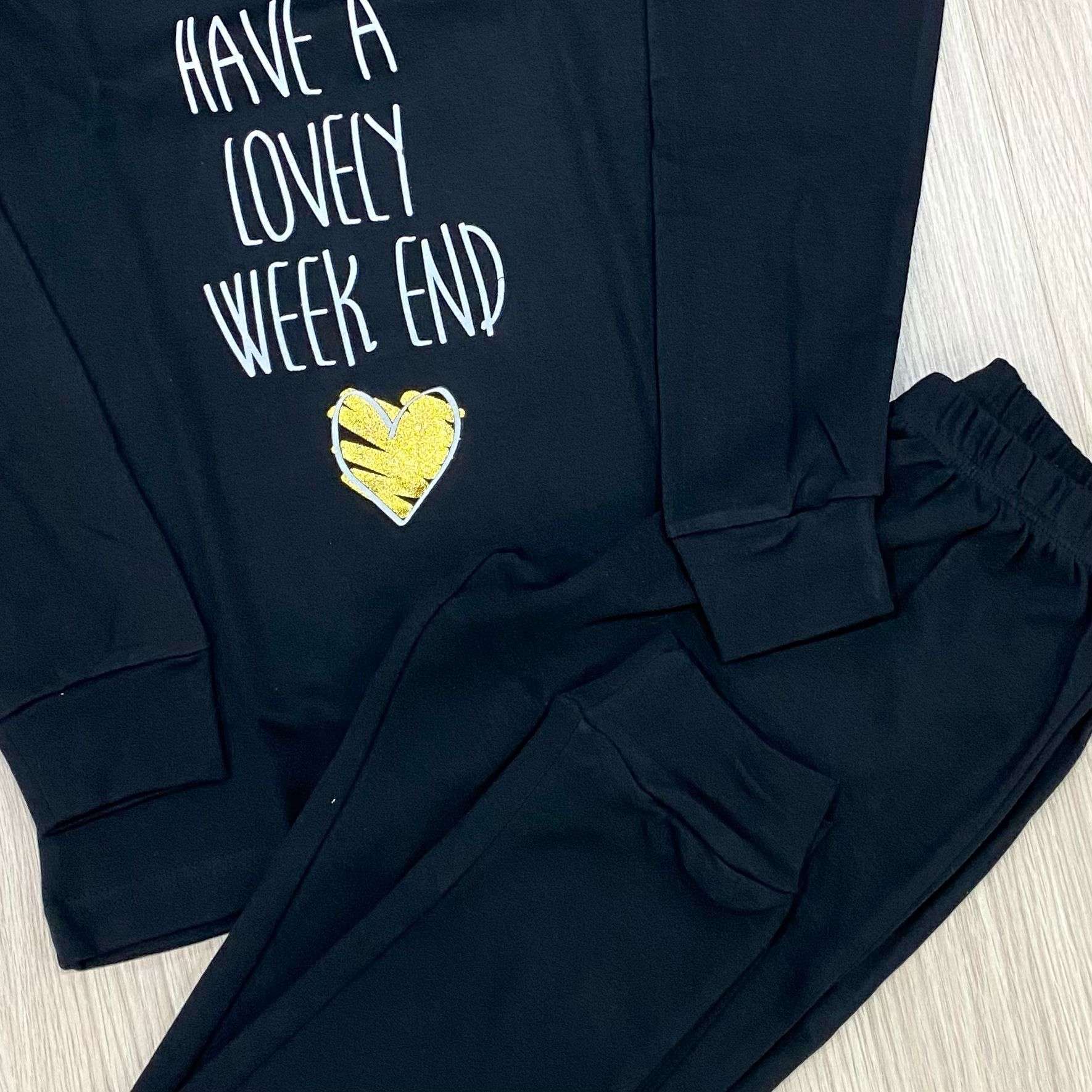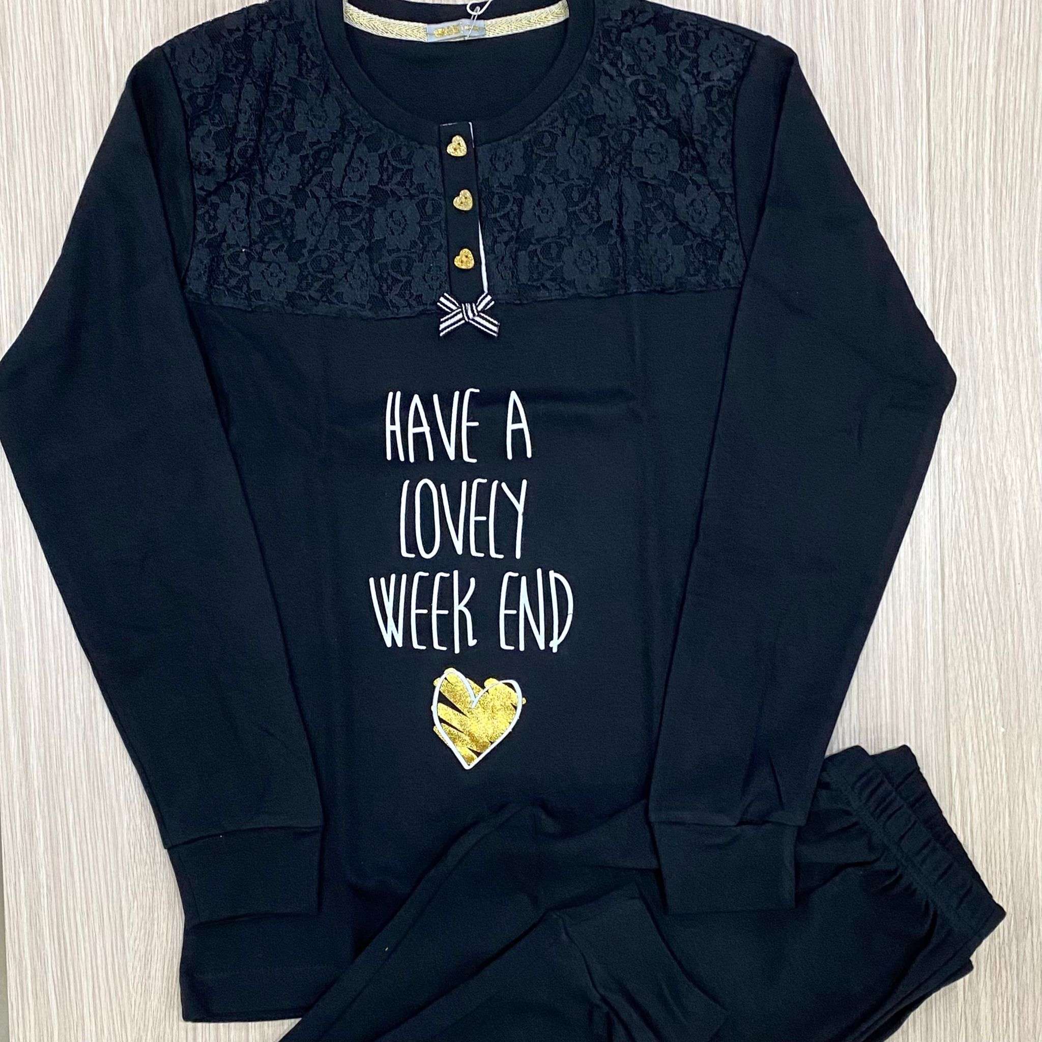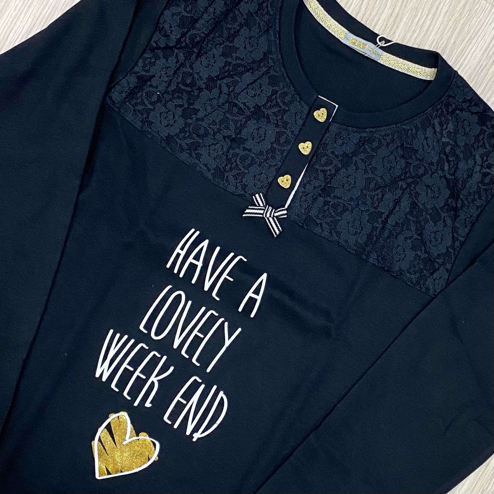 Pigiama bambina in caldo cotone, di colore nero, con stampa di colore bianco e dettaglio di pizzo. Pigiama con polsini.