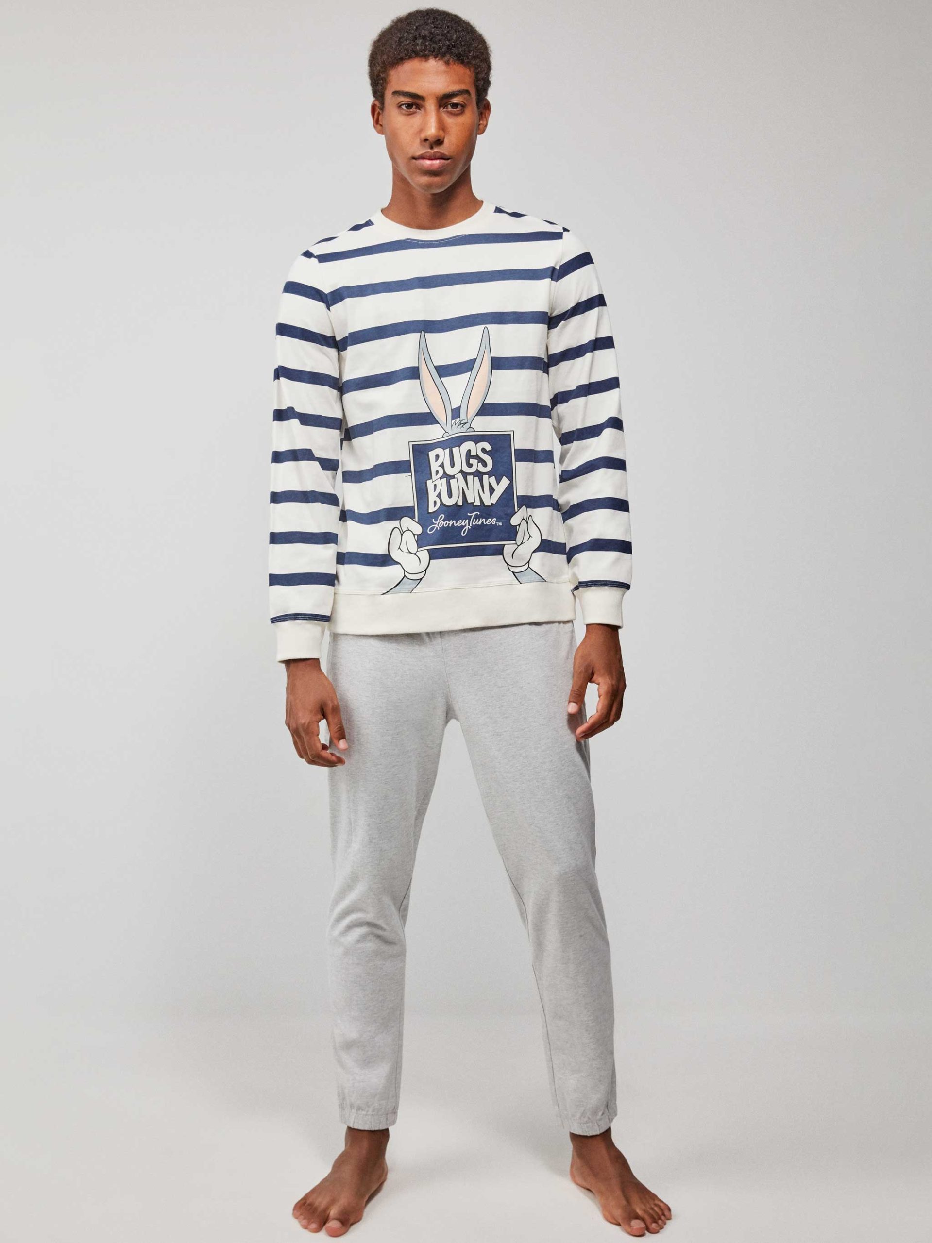 Pigiama con stampa Bugs Bunny in tessuto di maglia di cotone dalla finitura vellutata. T-shirt a maniche lunghe con stampa centrale Bugs Bunny. Pantaloni lunghi stampati con vita regolabile. Composizione 100% cotone caldo coordinato uomo codice 20238