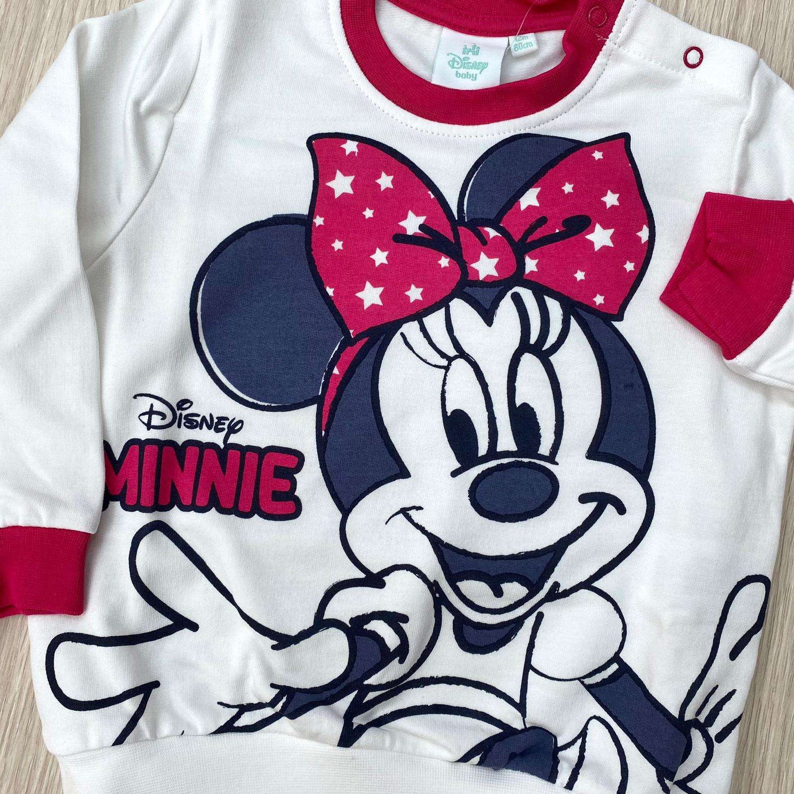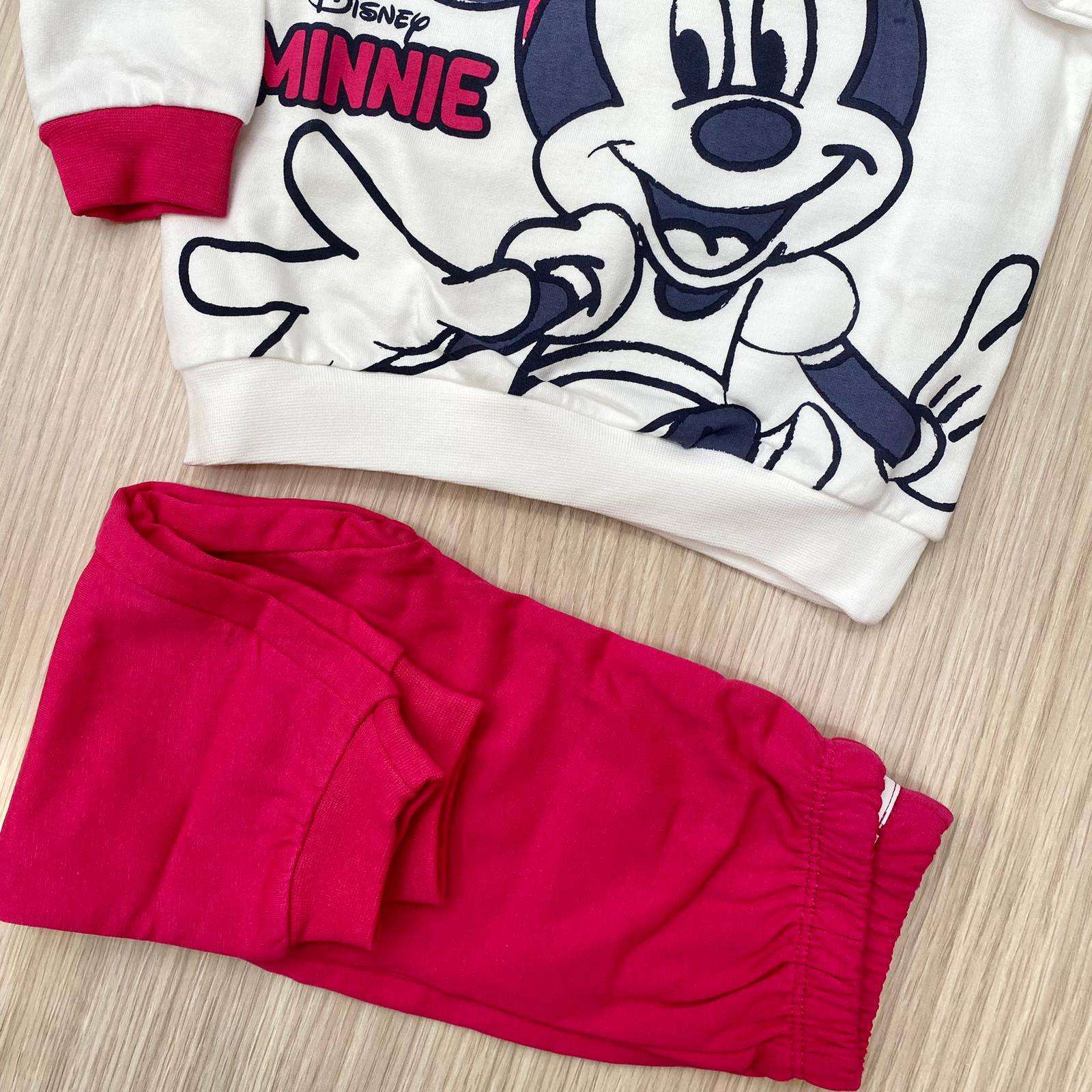 Pigiama due pezzi bambina in cotone felpato, di colore bianco e fragola, con stampa Minnie di vari colori. Pigiama con polsini.