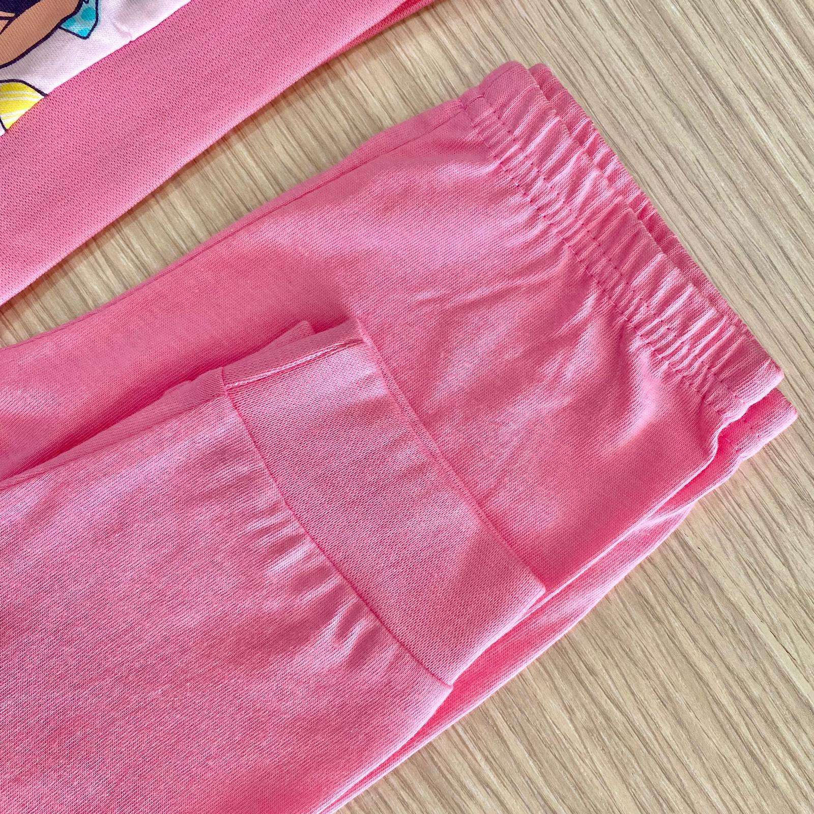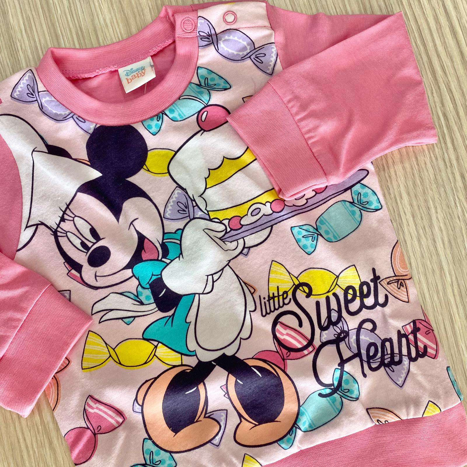 Pigiama due pezzi bambina in cotone, di colore rosa, con stampa Minnie di vari colori. 6 Mesi: 68 cm. 9 Mesi: 74 cm. 100% Cotone.