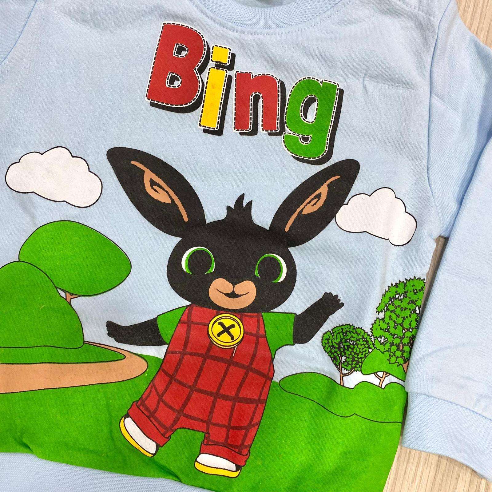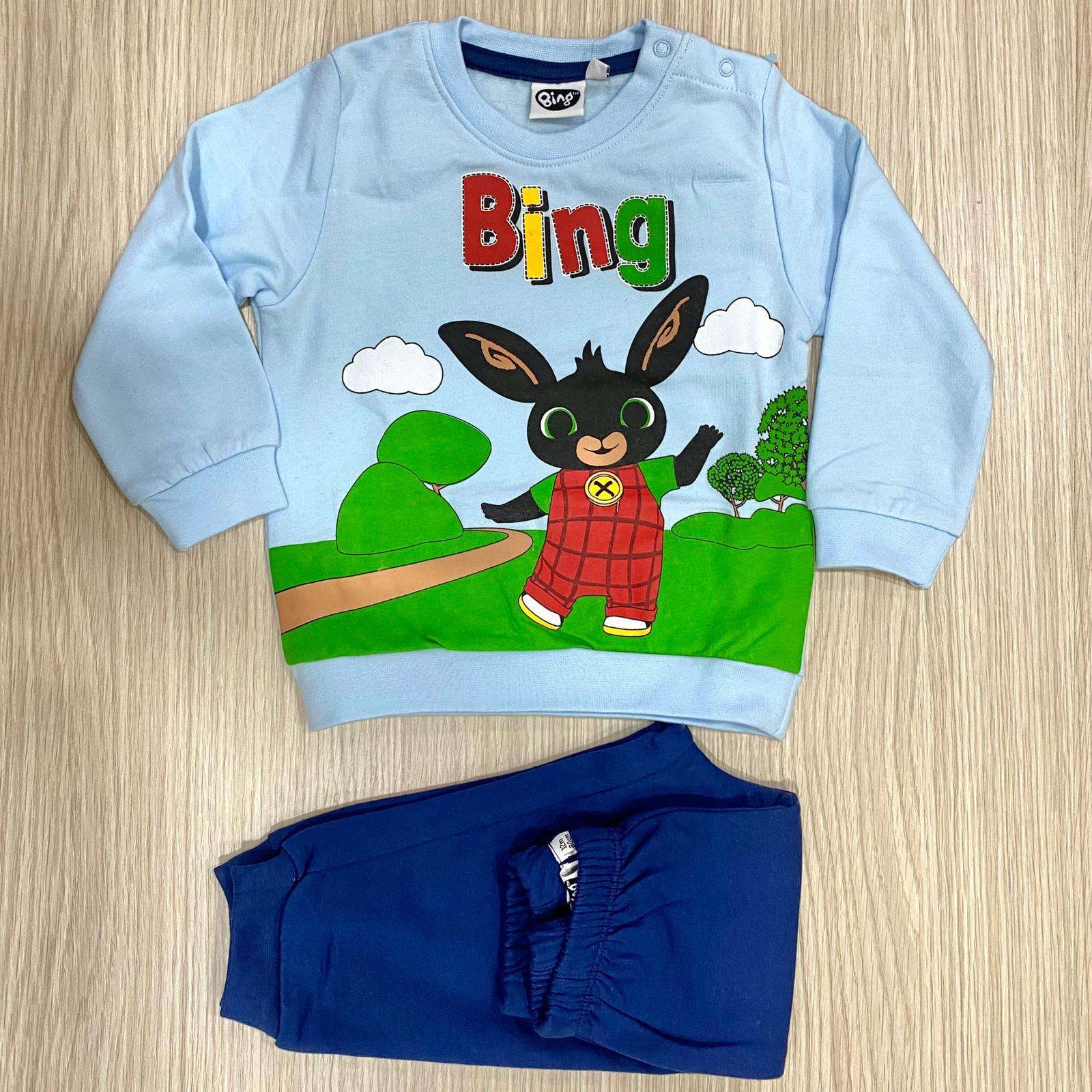 Pigiama due pezzi bambino in cotone felpato, di colore azzurro e blu, con stampa Bing di vari colori. Pigiama con polsini. 12 Mesi: 80 cm. 18 Mesi: 86 cm. 24 Mesi: 92 cm. 30 Mesi: 95 cm. 100% Cotone.