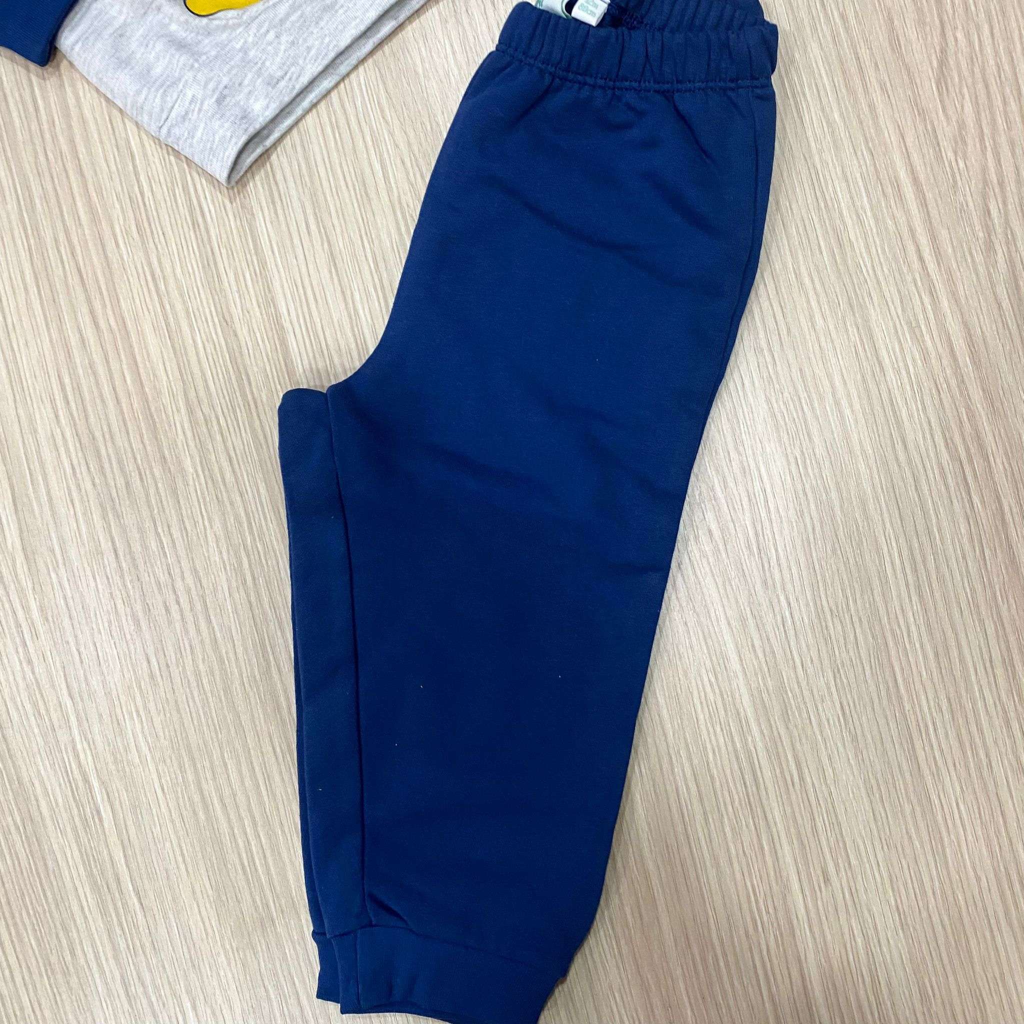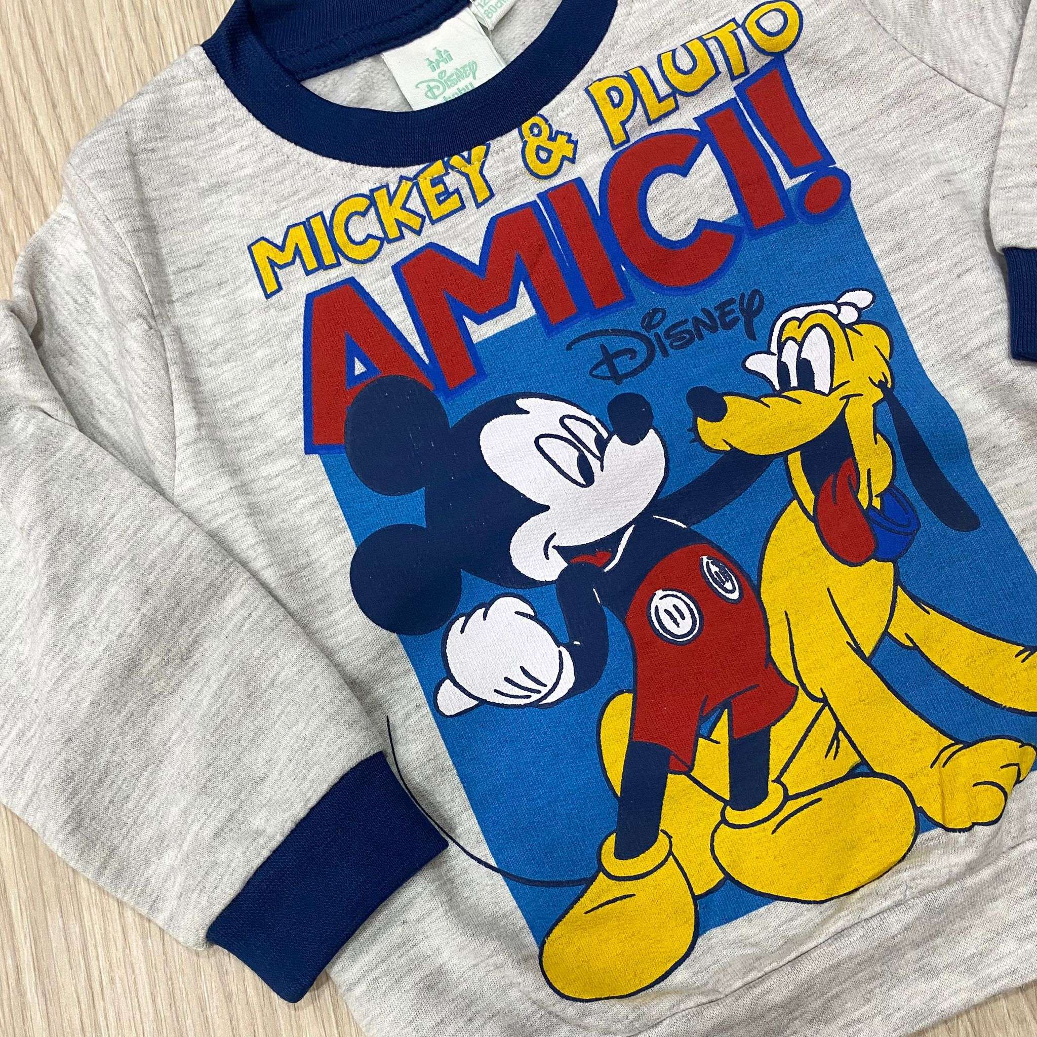 Pigiama due pezzi bambino in cotone felpato, di colore grigio e blu, con stampa Mickey Mouse di vari colori. Pigiama con polsini. 12 Mesi: 80 cm. 18 Mesi: 86 cm. 24 Mesi: 92 cm. 30 Mesi: 95 cm.