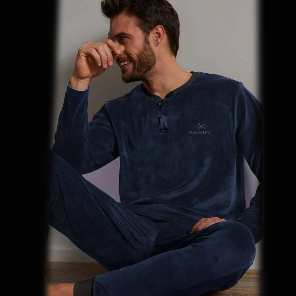 Pigiama admas uomo serafino in morbido velour , velluto sottile Pantalone lungo con tasche laterali , elastico in caviglia Casual ed elegante per l’ uomo che vive il comfort e l’eleganza a casa e di notte Pigiama uomo elegante di colore Blu
