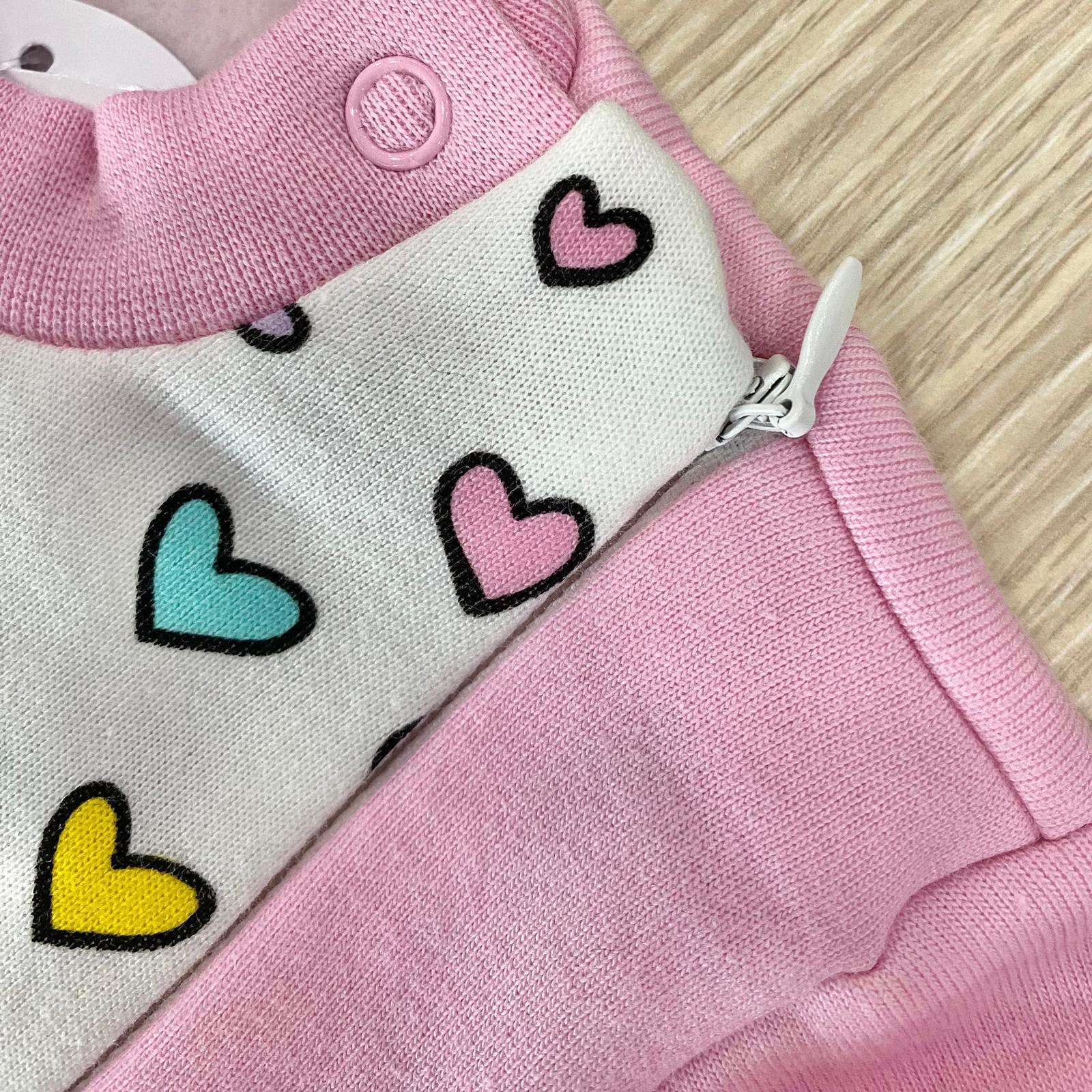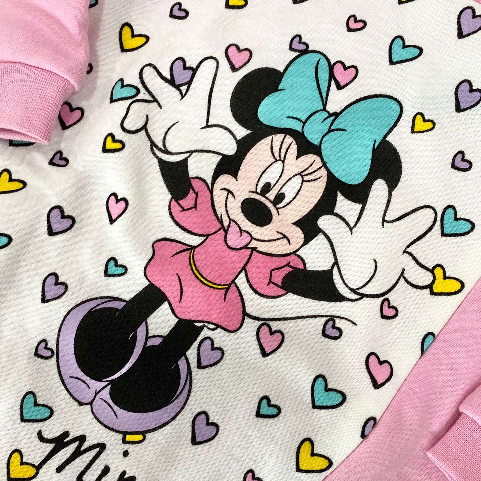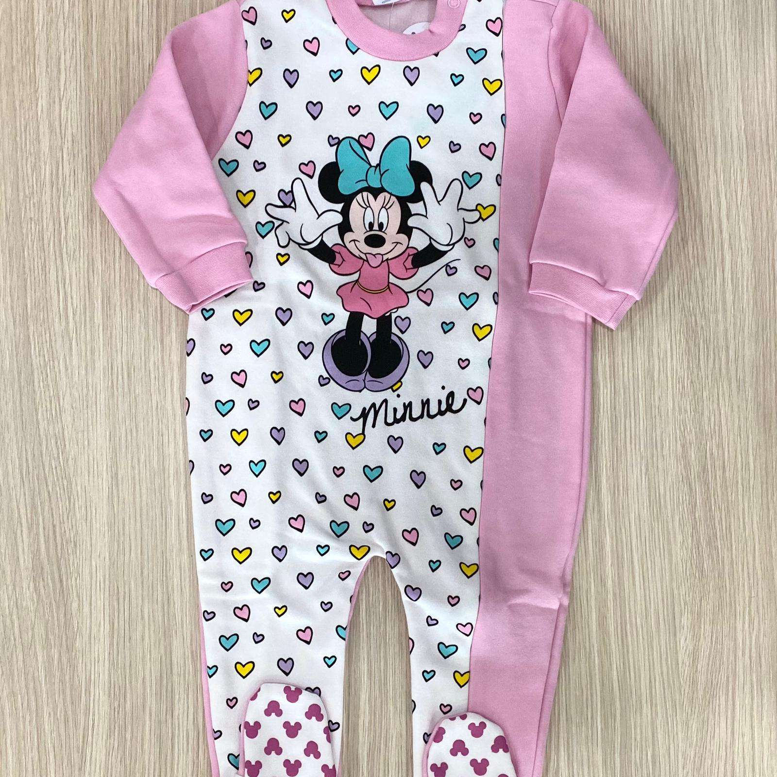 Pigiamone intero bambina in cotone felpato, di colore bianco e rosa, con stampa Minnie e cuoricini di vari colori. Apertura con cerniera. Pigiamone con antiscivolo.