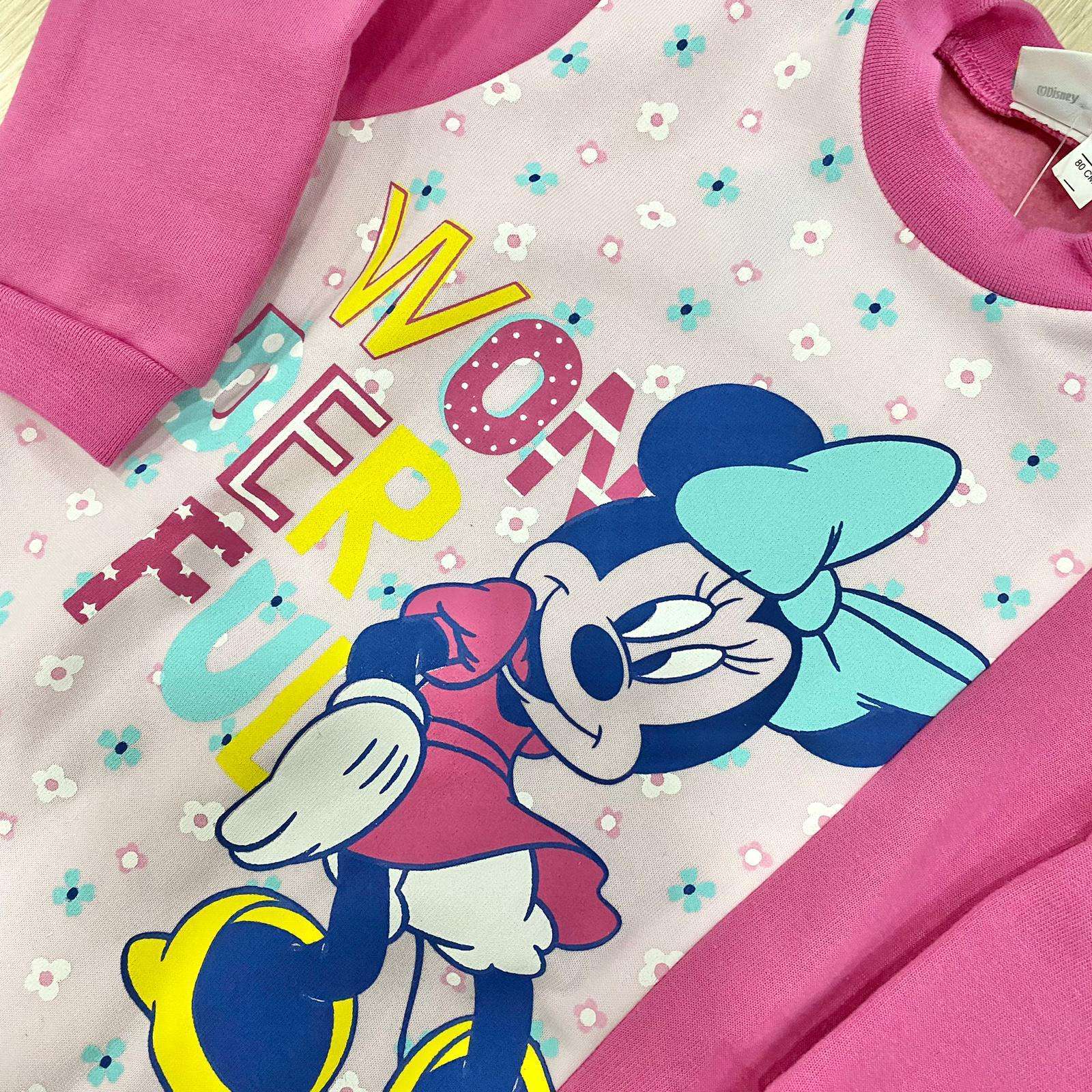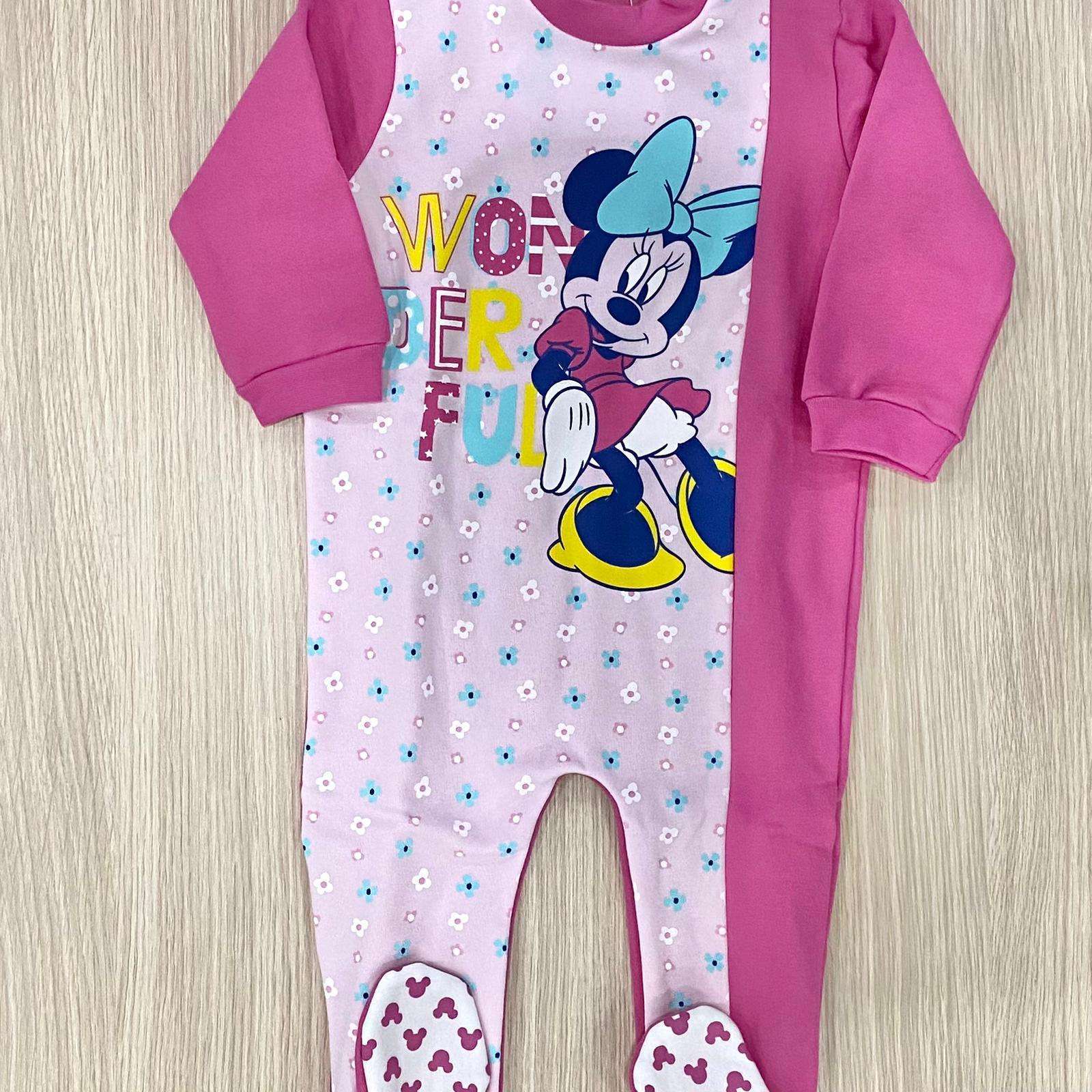 Pigiamone intero bambina in cotone felpato, di colore fucsia e rosa, con stampa Minnie e fiorellini di vari colori. Apertura con cerniera. Pigiamone con antiscivolo.