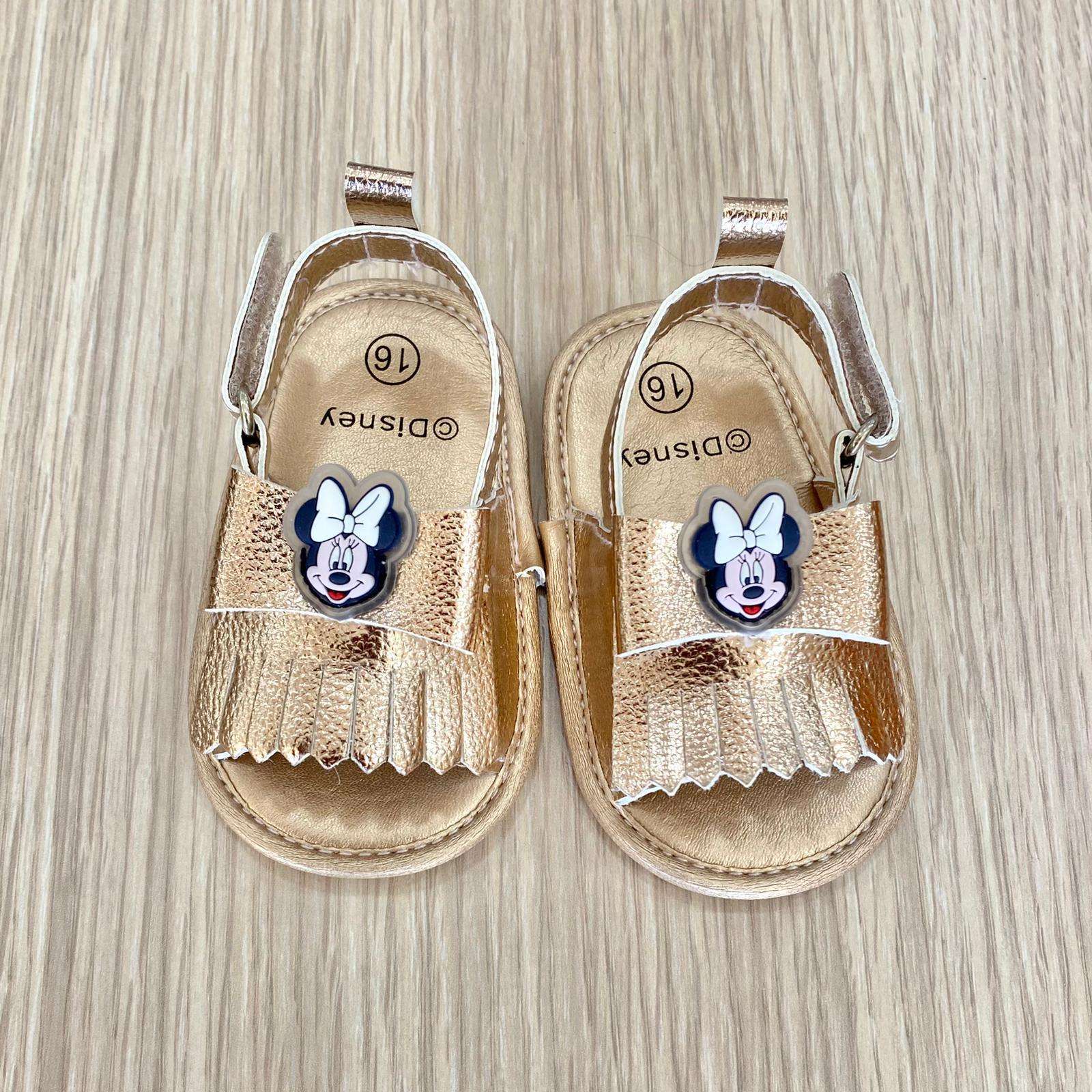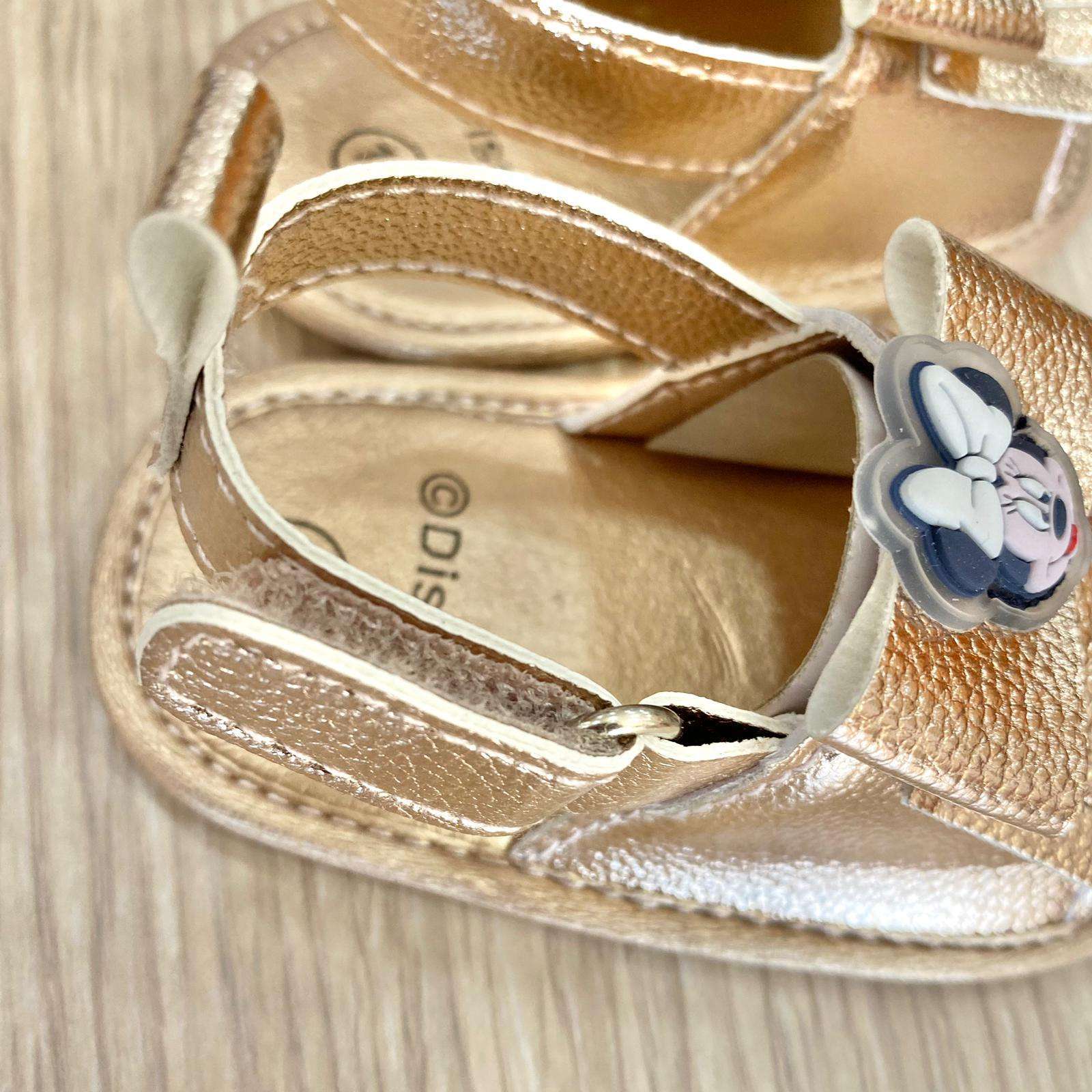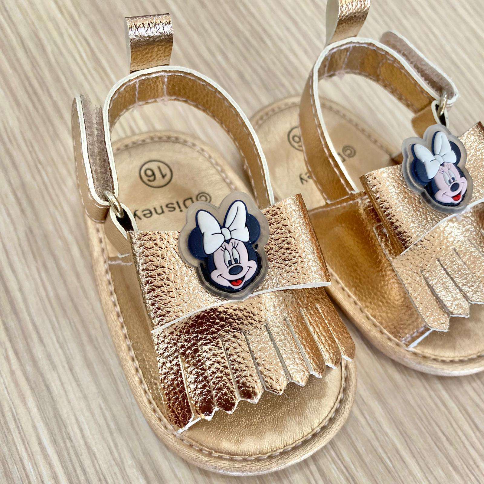 Sandalino dorato, con applicazione fiocchetto e Minnie gommata. Sandalino antiscivolo e chiusura a strappo.