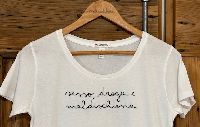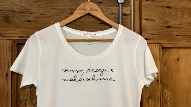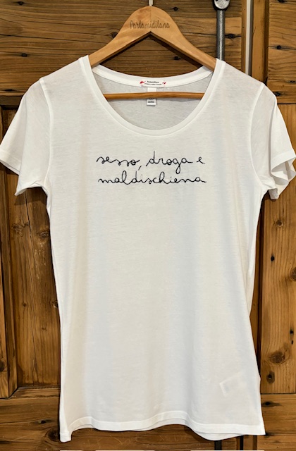 T-shirt “SESSO, DROGA E MALDISCHIENA” ricamata a mano. Vedi tabella TAGLIE in galleria foto.