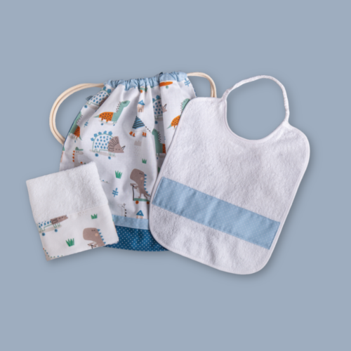 Il set base è composto da 3 pezzi: bavaglino, asciugamano e sacchetto.