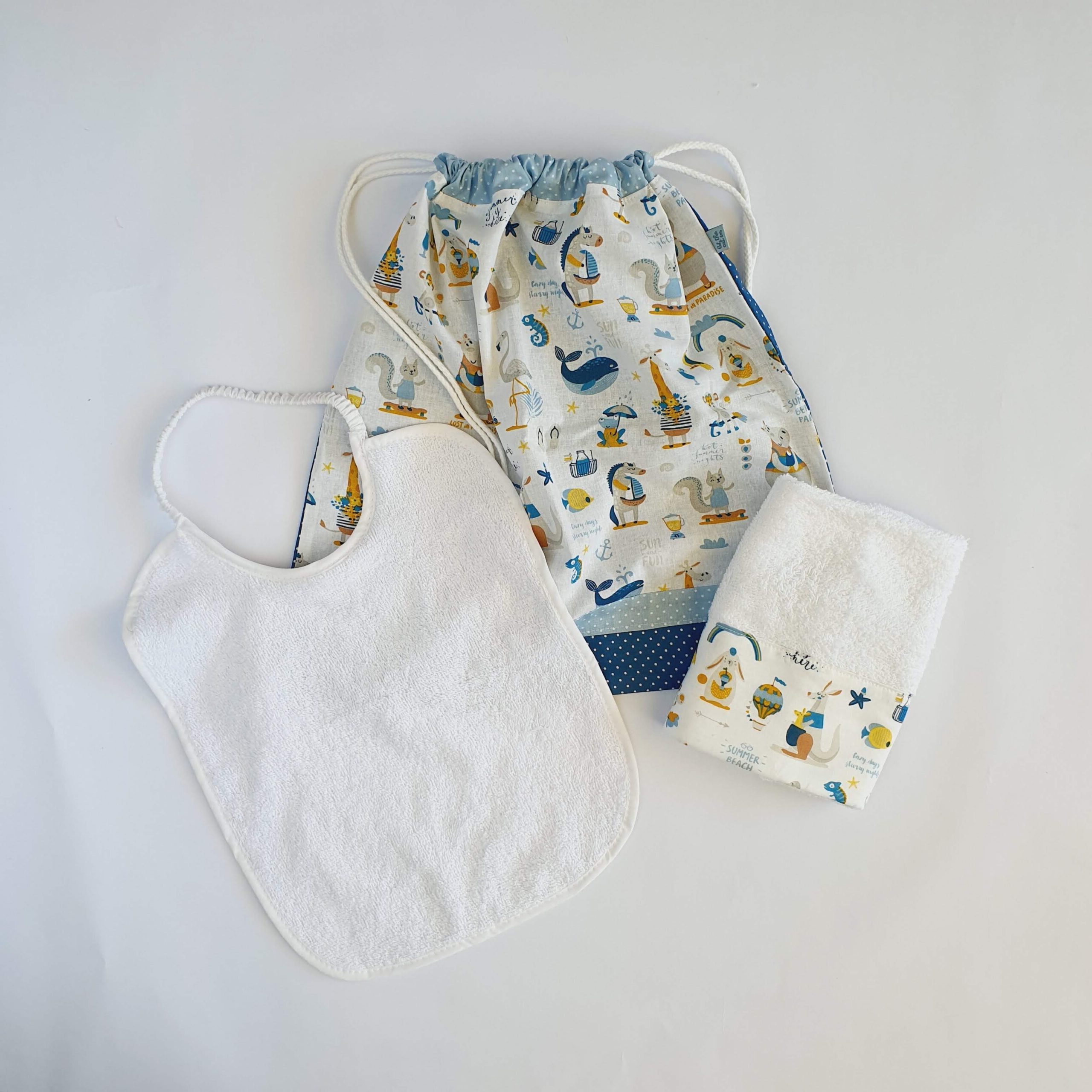 Il set base è composto da 3 pezzi: bavaglino, asciugamano e sacchetto.