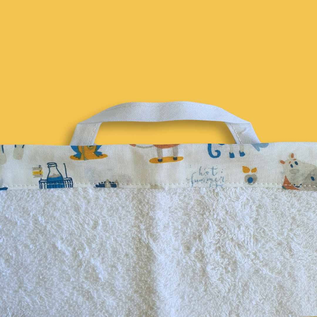 - L’asciugamano è in spugna e ha una pratica asola per essere appeso, che ricordi i gancetti colorati che avevo a scuola!