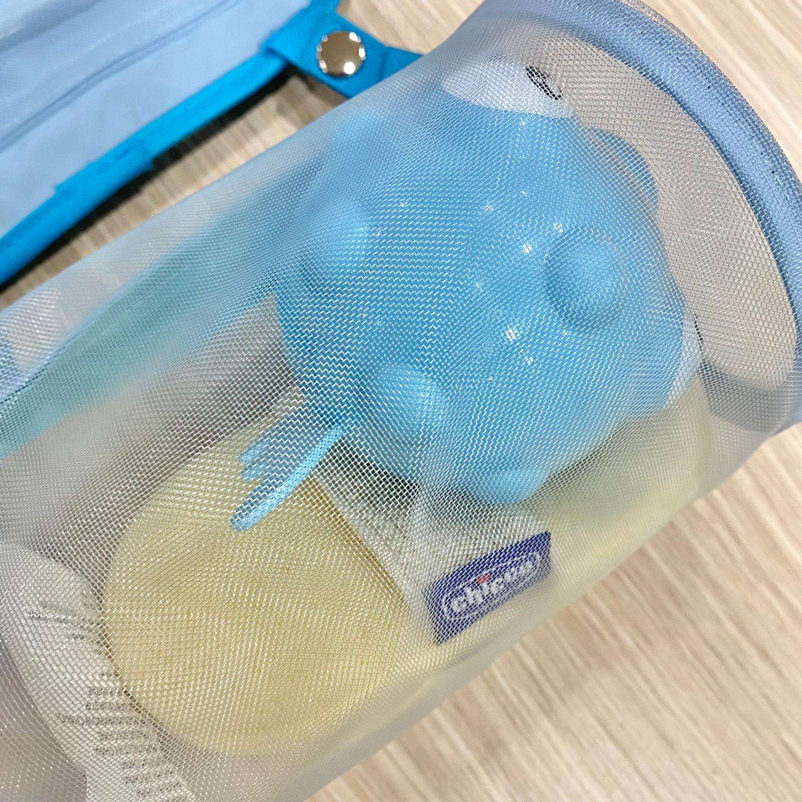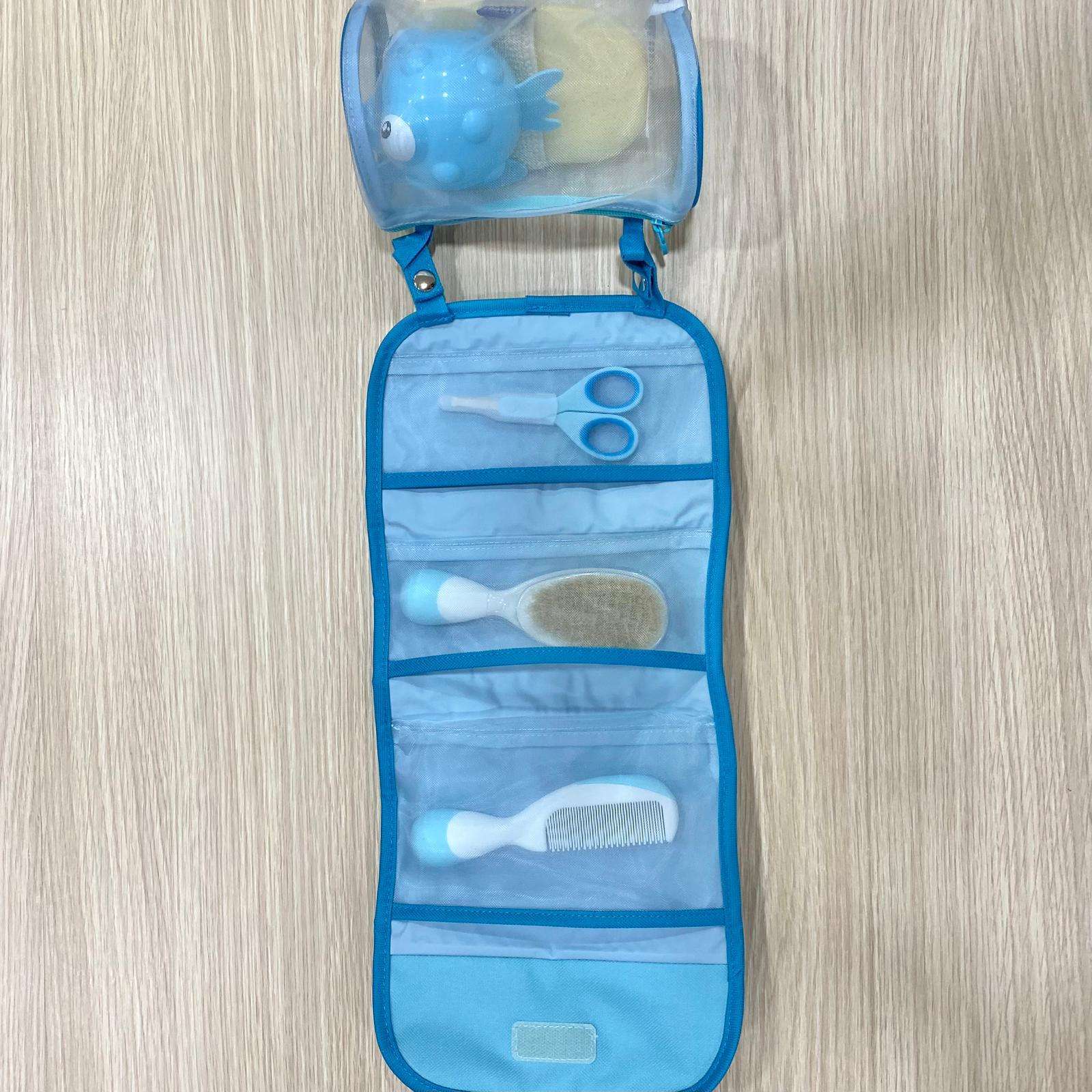 Set beauty neonato composto da: Spazzola con setole naturale, pettine con punte arrotondate, guanto spugna, termometro da bagno, forbicine con punte arrotondate.