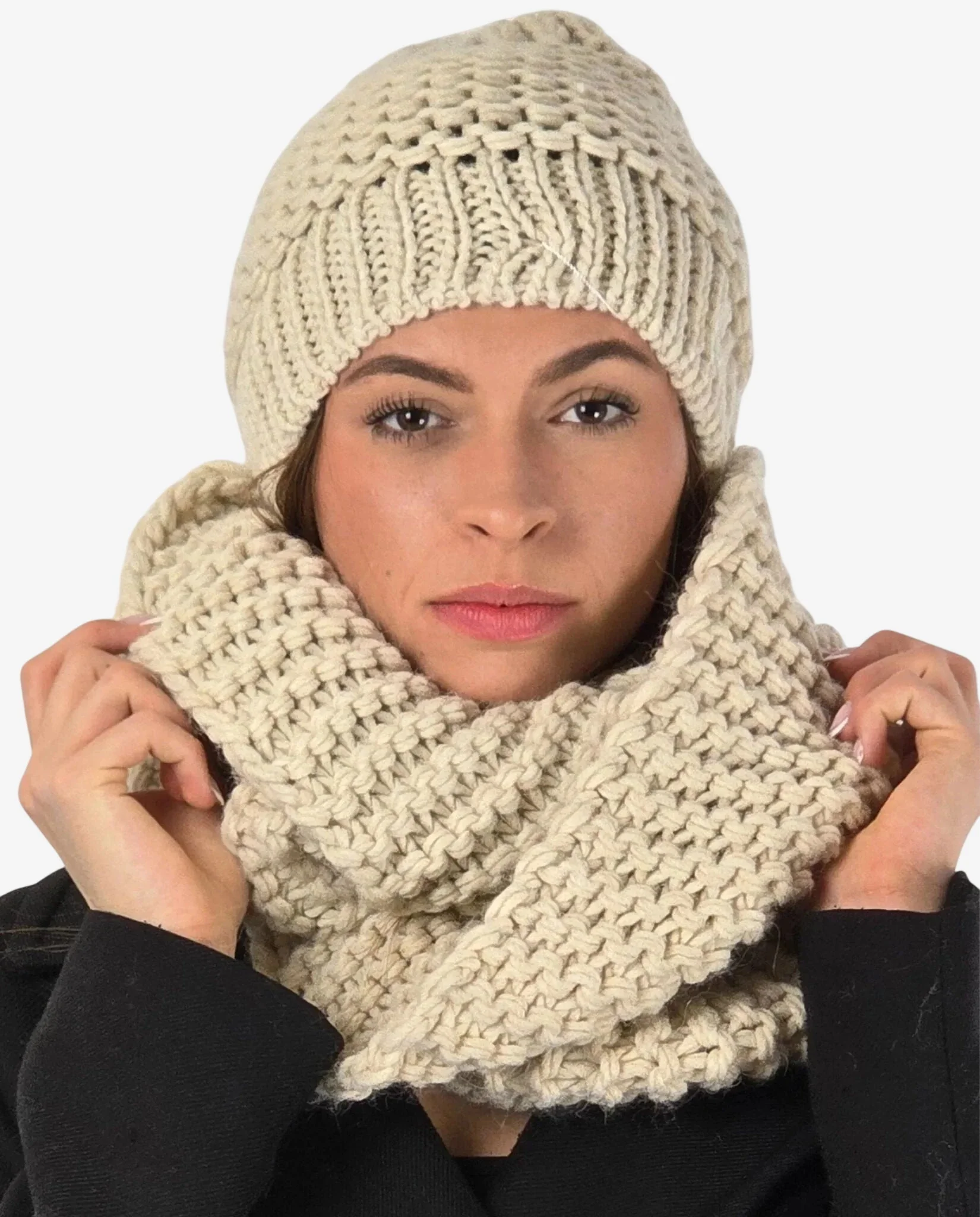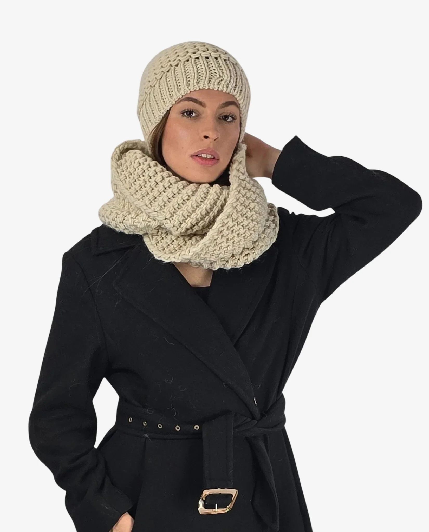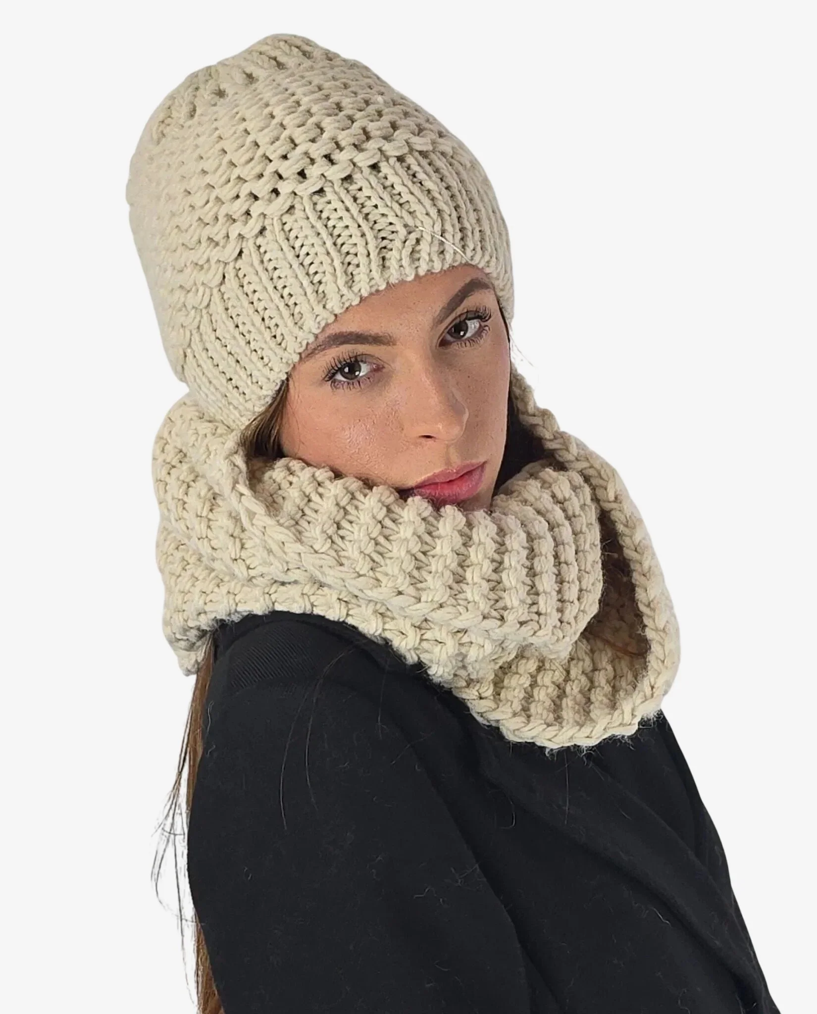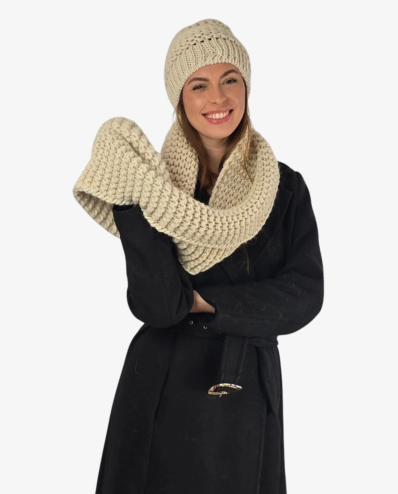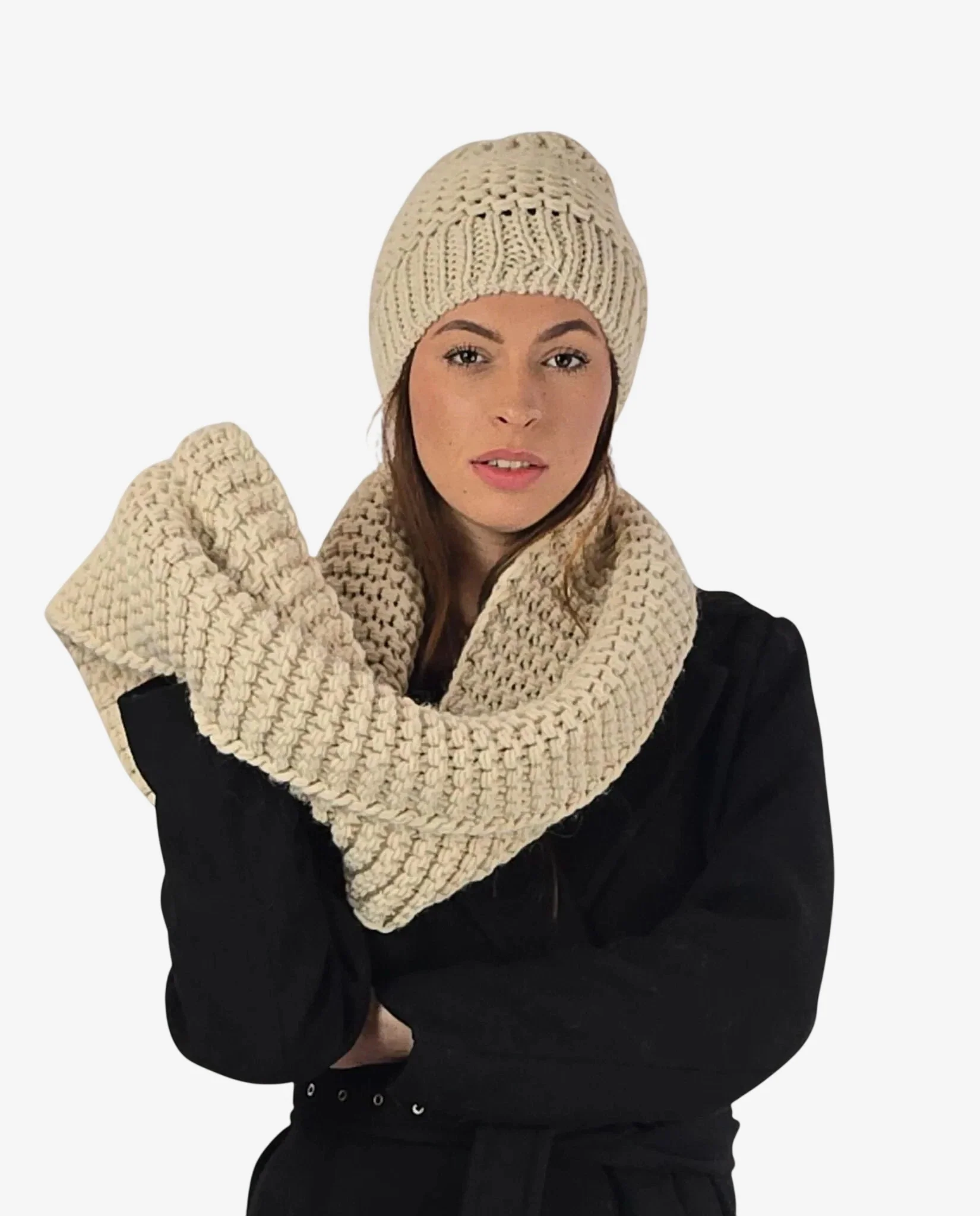 Set donna coordinato collo e cuffia avorio con lana merino, perfetto per affrontare l’inverno con stile e raffinatezza.