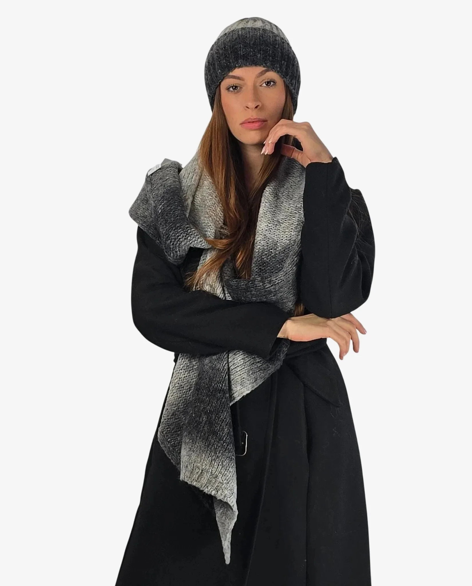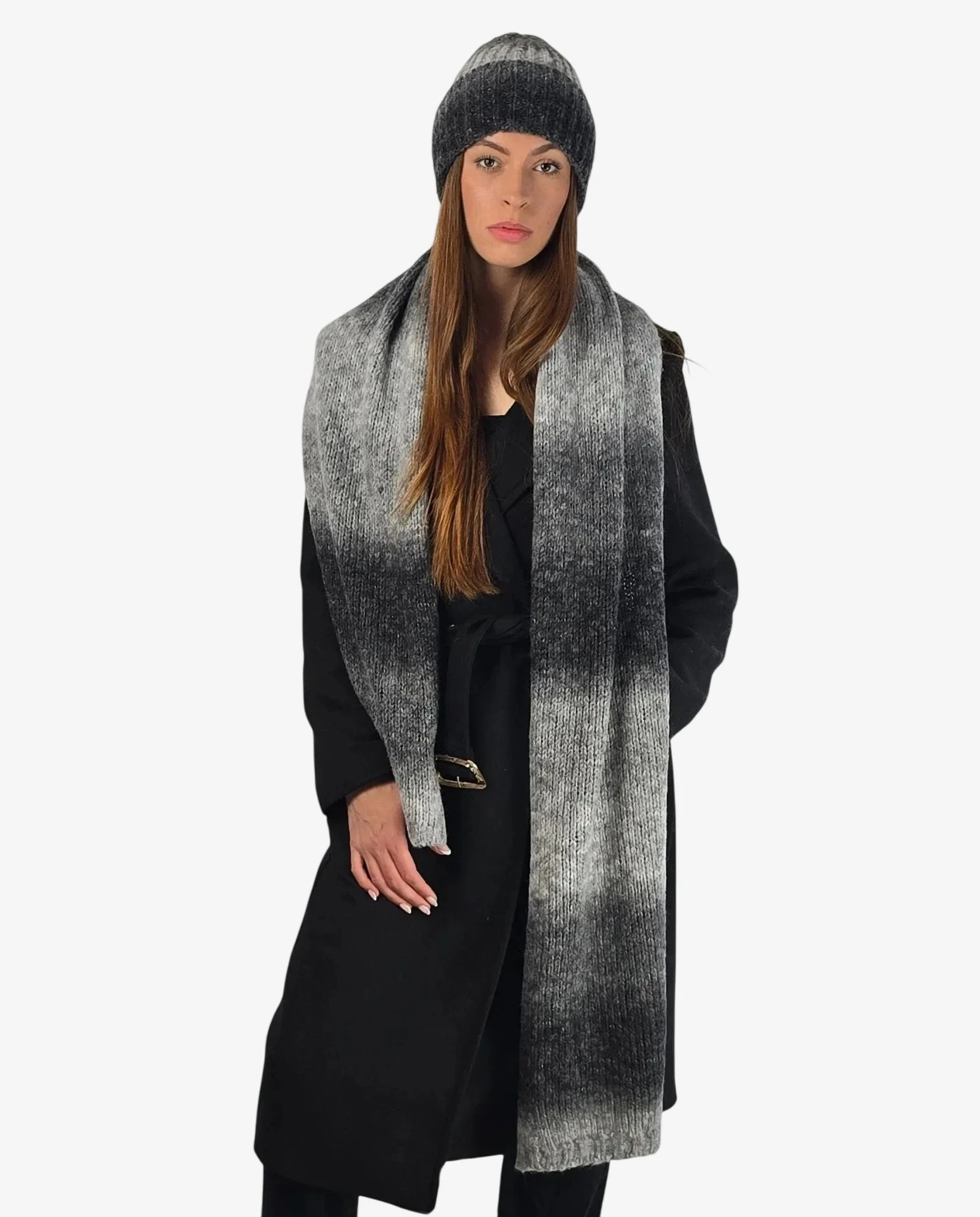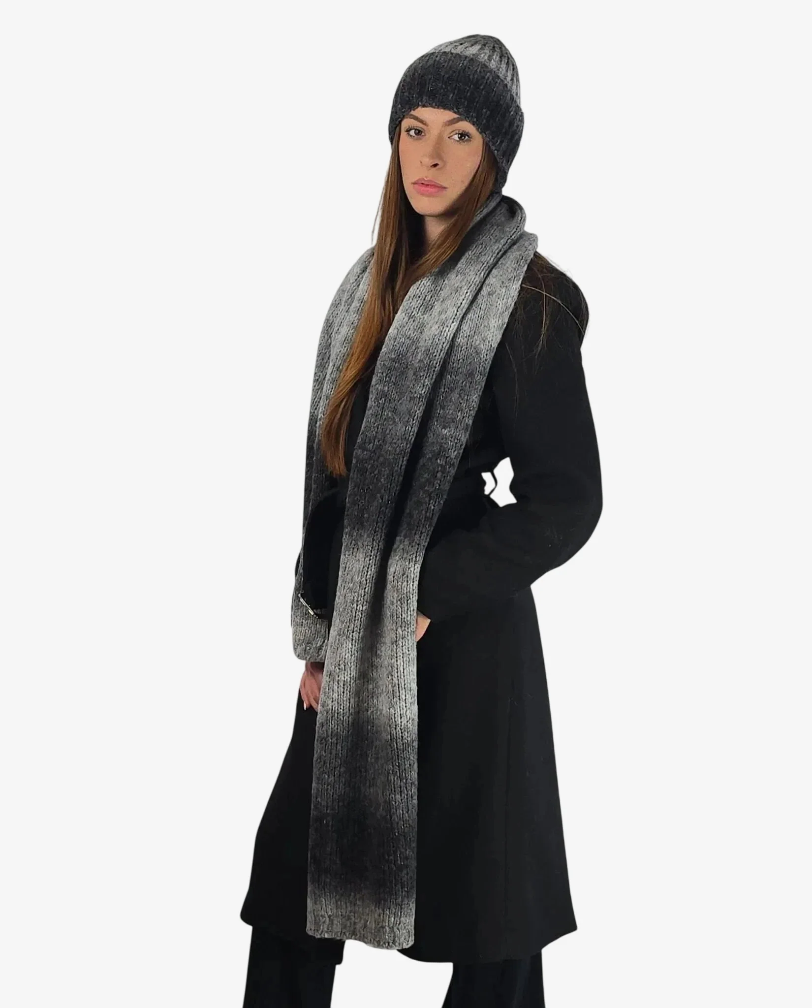 Set donna coordinato sciarpa e cuffia grigio sfumato con lana, perfetto per l’inverno con stile e calore.