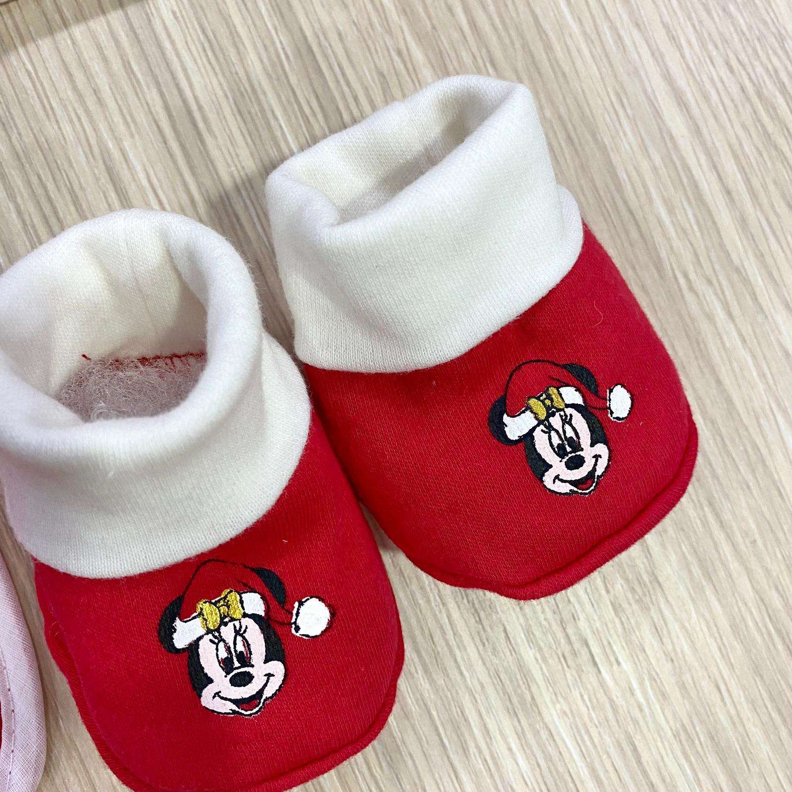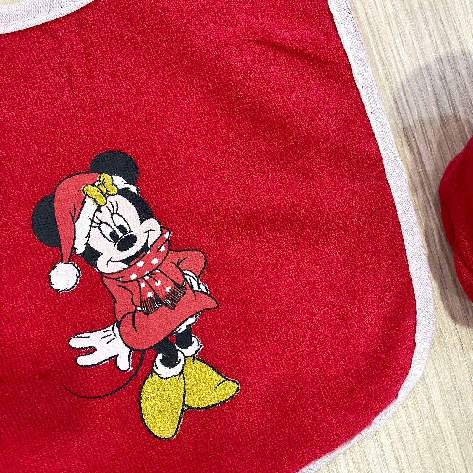 Set regalo Natale composto da: cappellino, bavetta e calzini in caldo cotone, di colore rosso, con stampa Minnie di vari colori. Taglia Unica: 0/1 Mese.