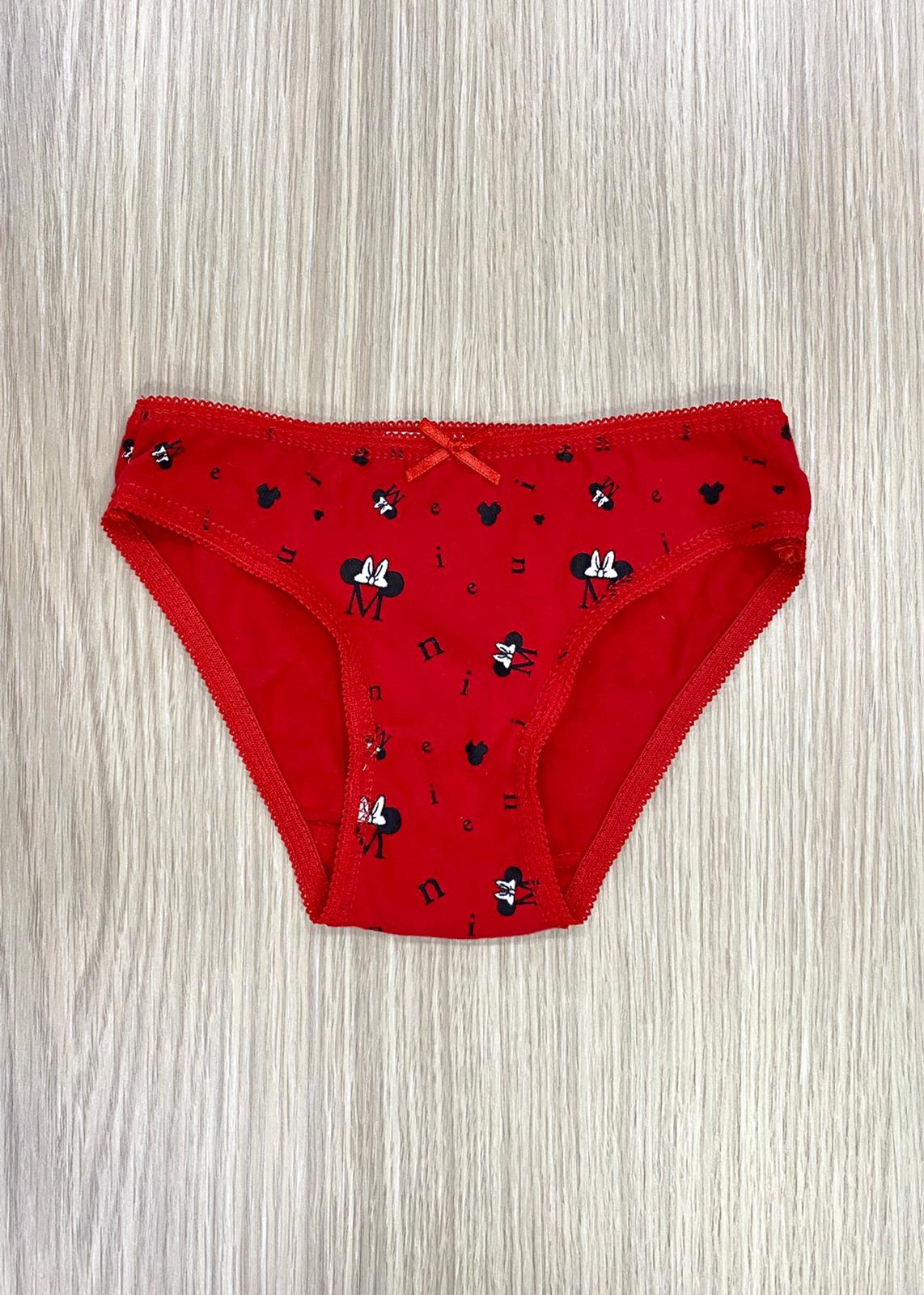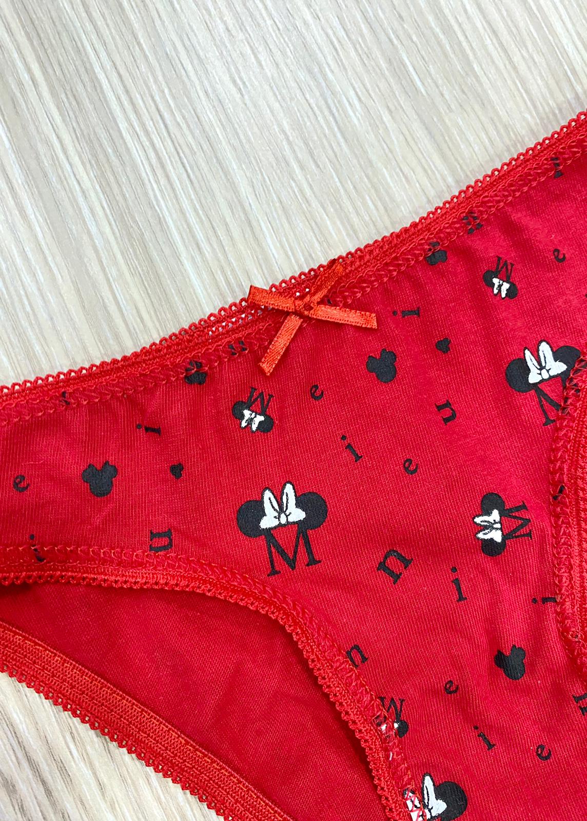 Slip bambina natalizio in cotone, di colore rosso, con stampa Minnie di colore bianco e nero, con applicazione di fiocchetto. 100% Cotone.