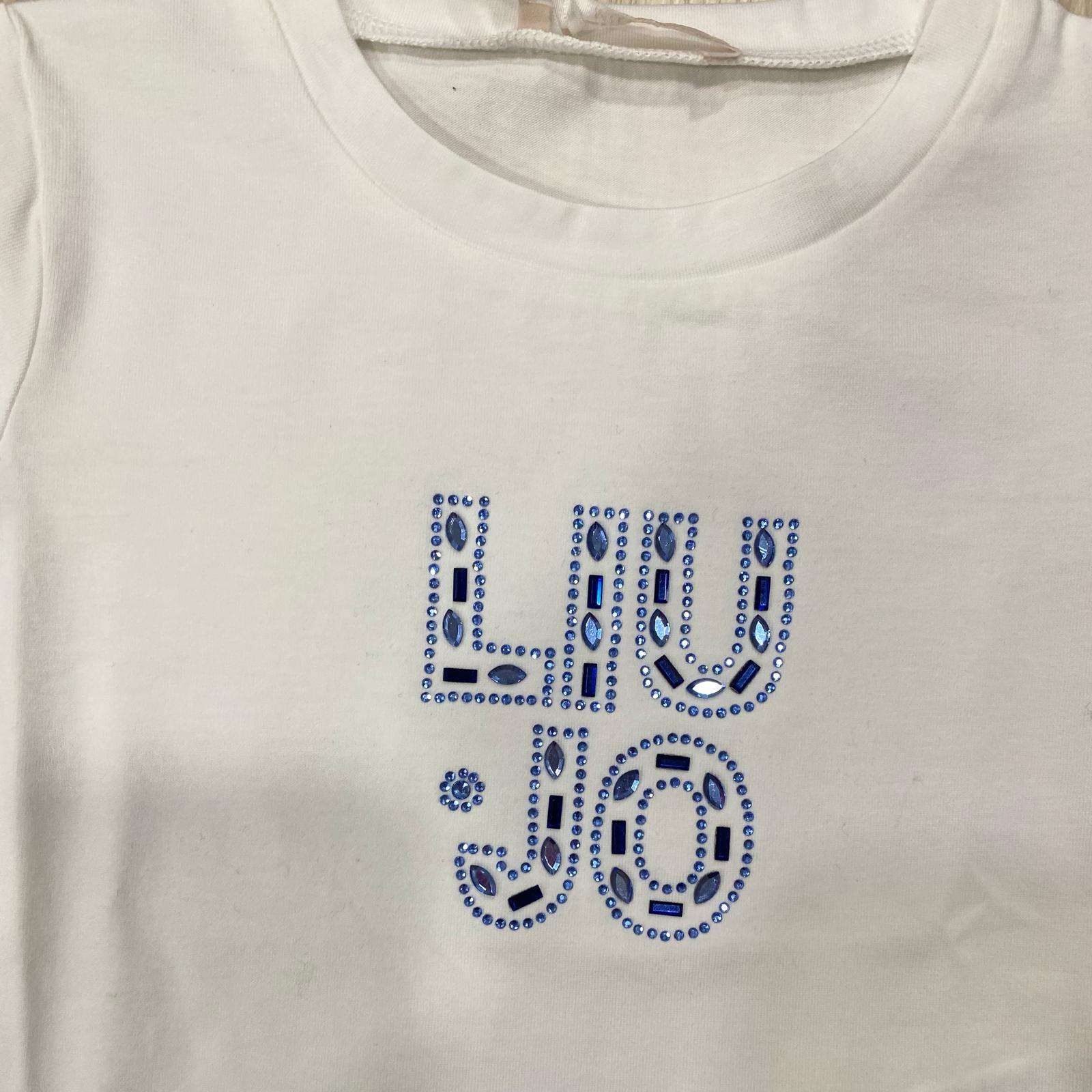 T-shirt bambina in cotone, di colore bianco, con strass di colore blu. 95% Cotone. 5% Elastane.